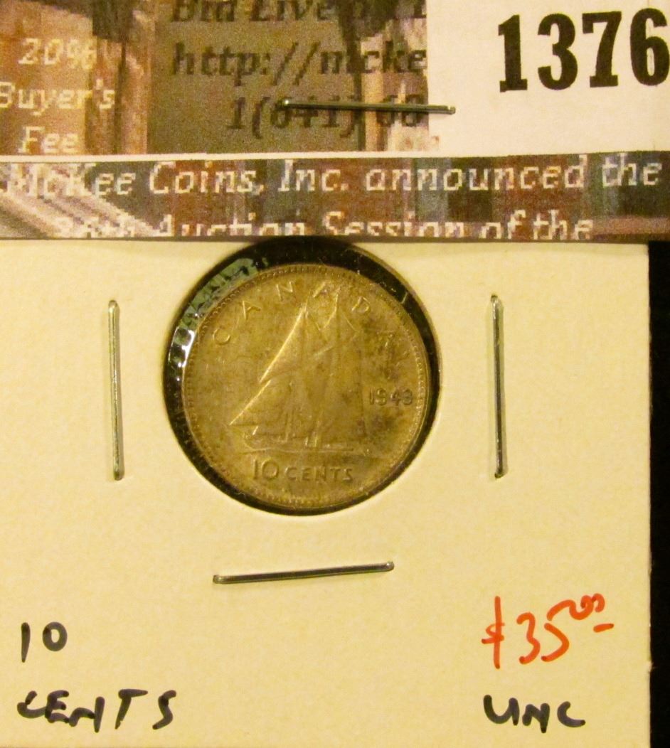 1376 . 1943 Canada Ten Cents, UNC, value $35