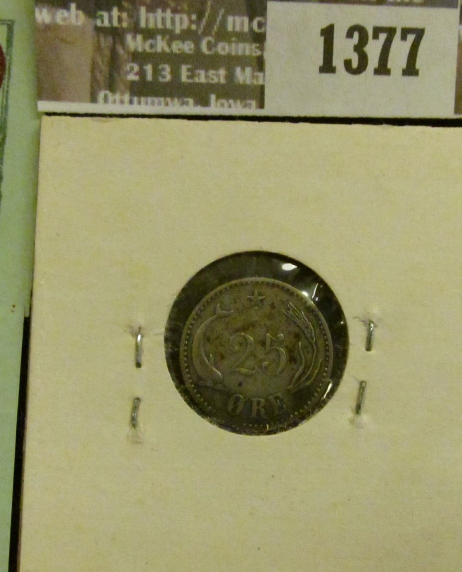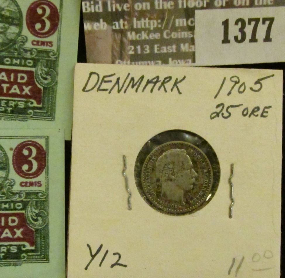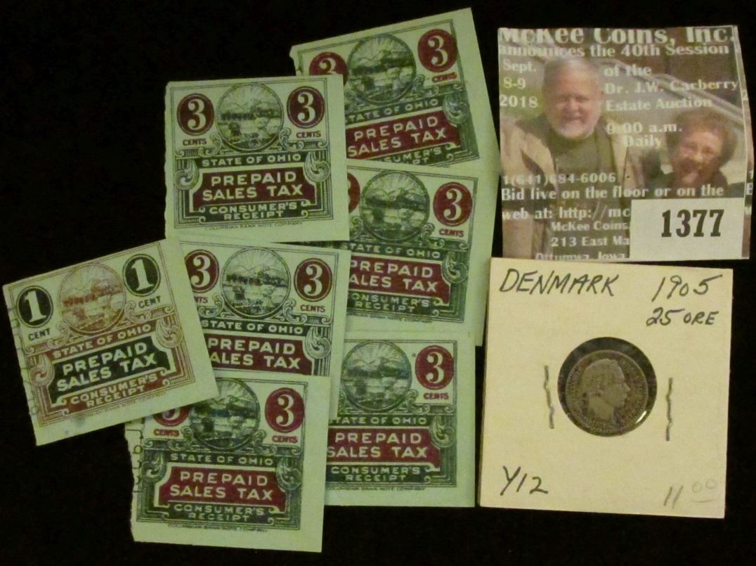 (6 ) blue-green Three Cent & a One cent State of Ohio Prepaid Sales Tax Consumer's Receipt Stamps; & 1905 Denmark Silver 25 Ore.