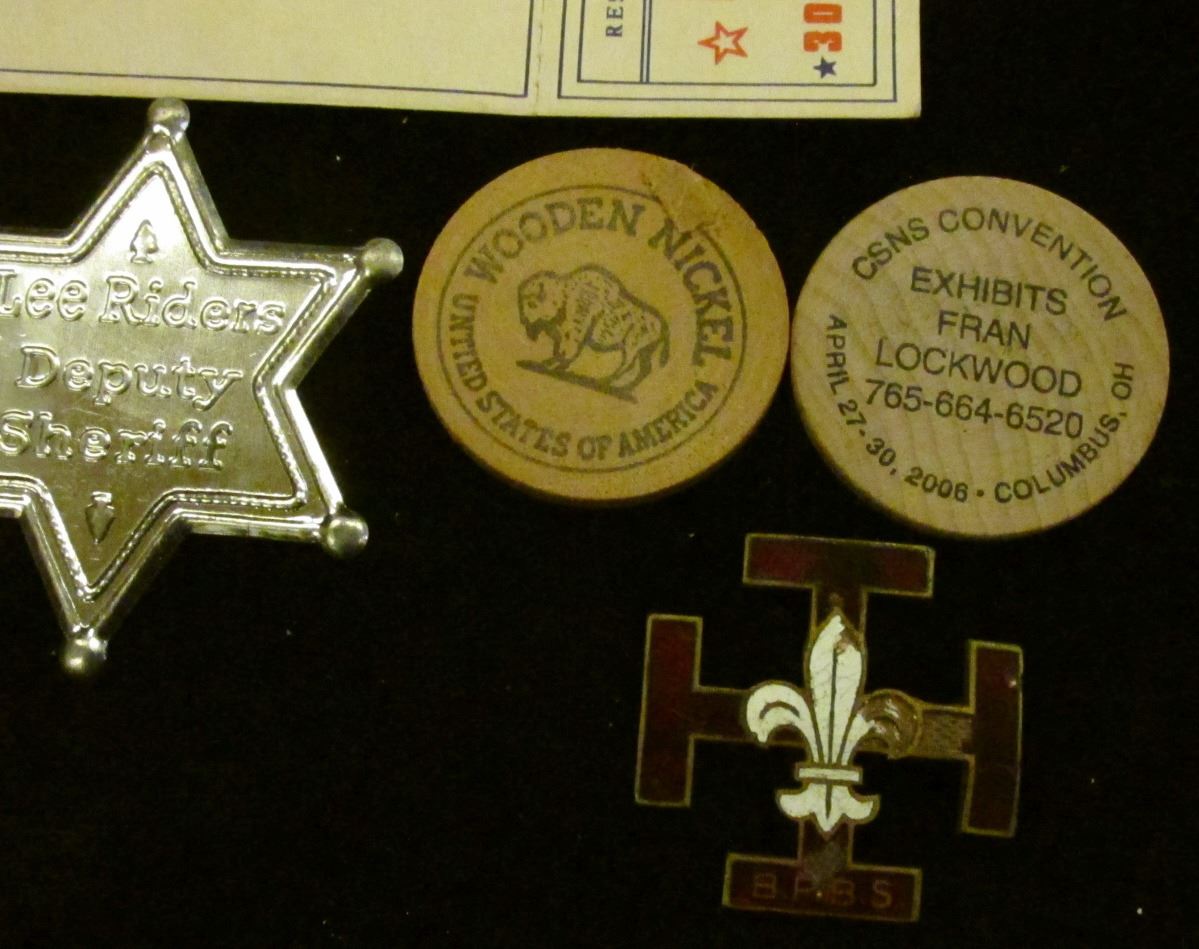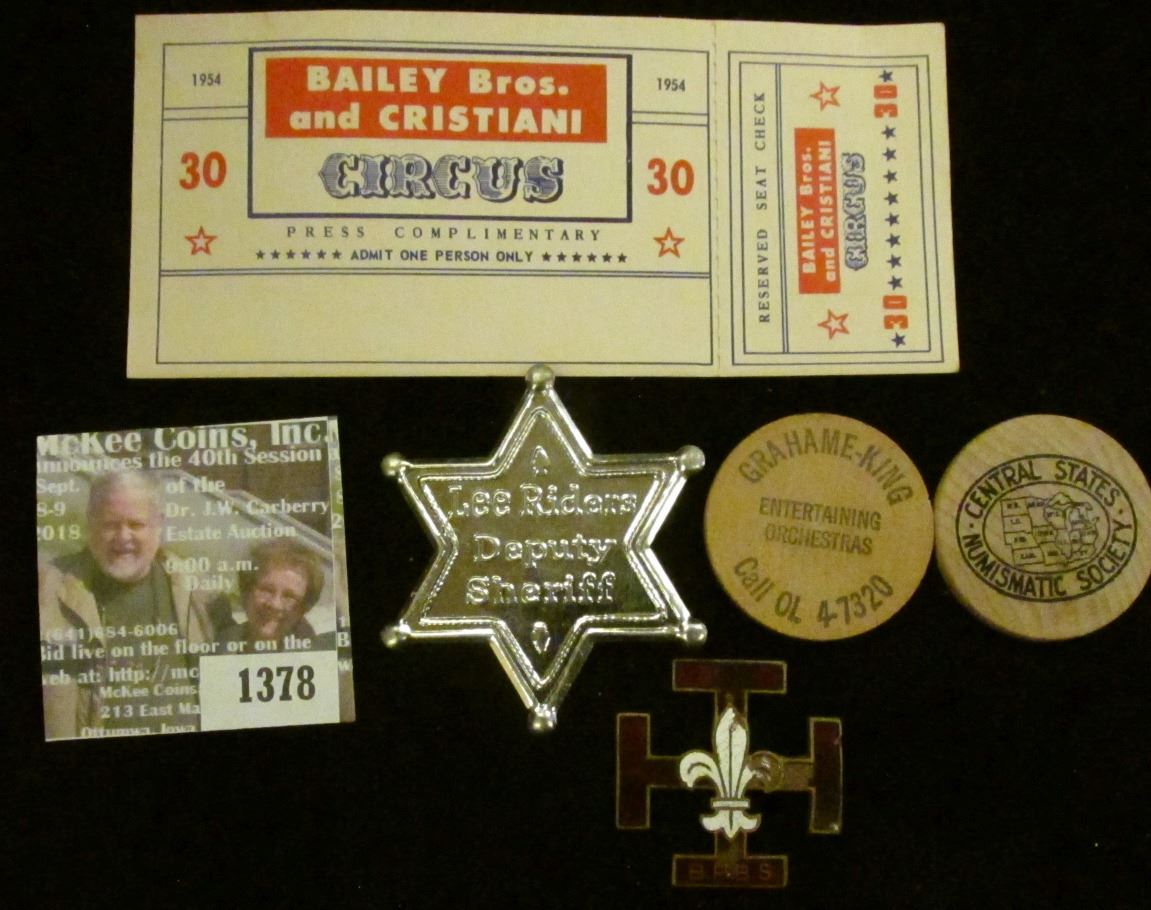 1954 "Bailey Bros. and Cristiani Circus Press Complimentary Admit One Person Only" Ticker with Stub; two different Wooden Nickels; "AMA" enameled Pin; "B.R.B.S." red and white enameled Fleur-de-lis; & a "Lee Rider Deputy Sheriff" Badge.