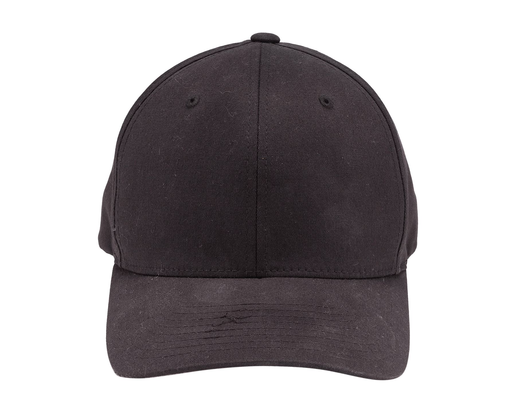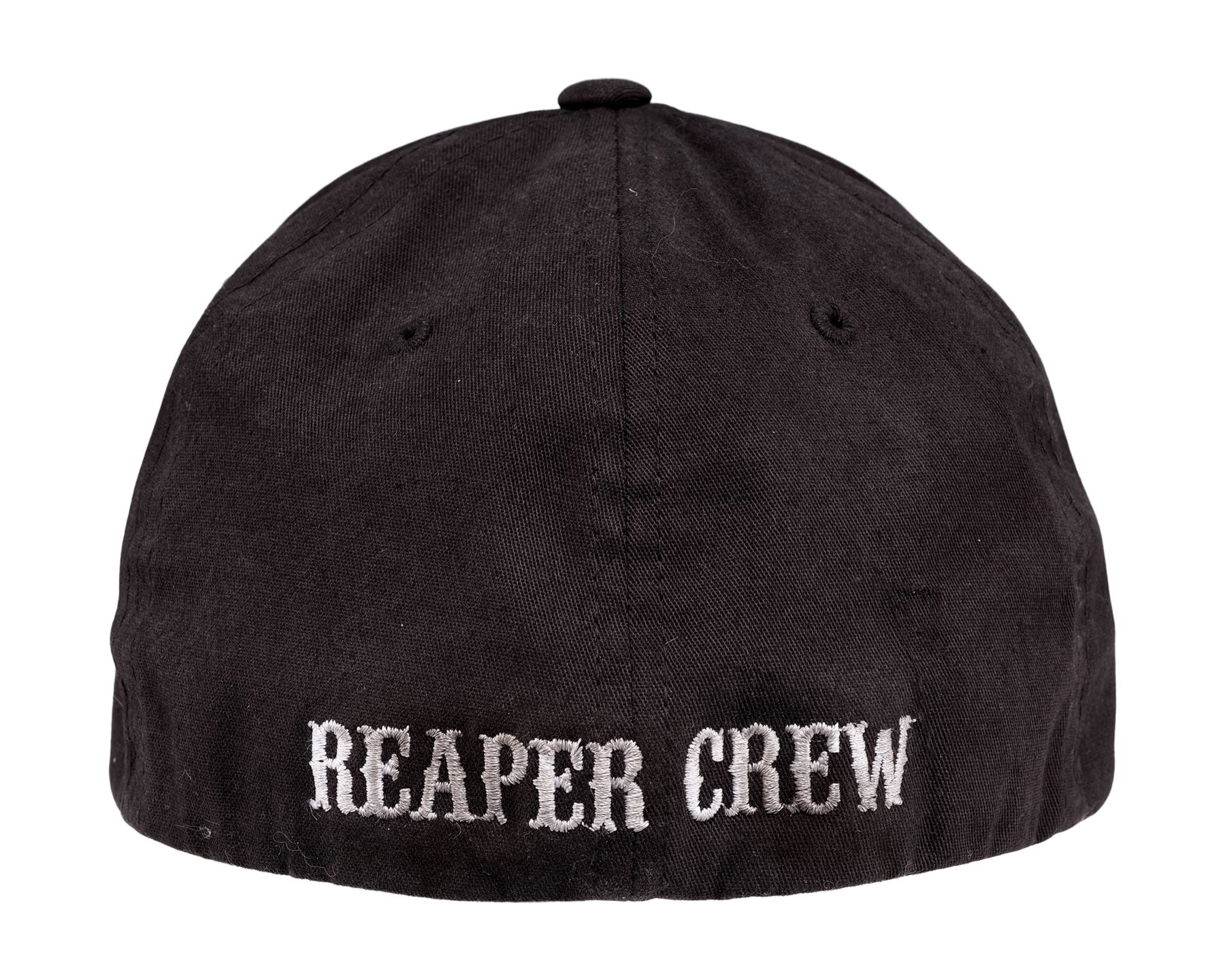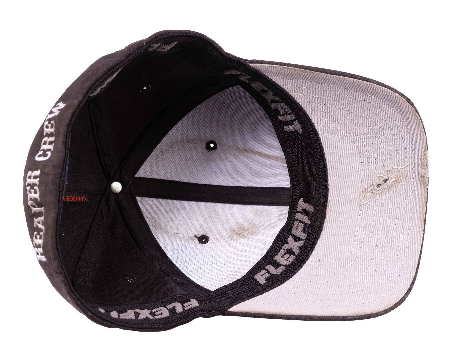 This cotton-Spandex-blend black Flexfit baseball cap is embroidered with "Reaper Crew" in white thread along the back. It exhibits tearing and staining, some of which may be intentional distressing, while some is from use.