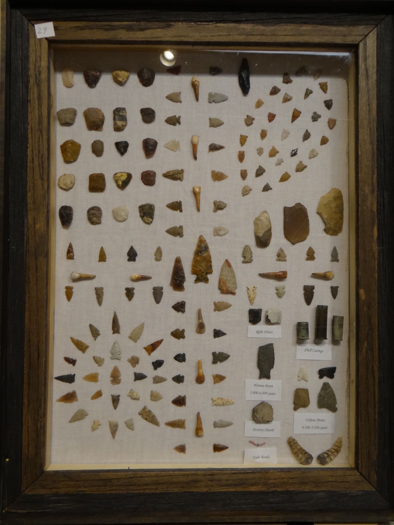 138 artifacts, in 20" x 26" frame, arrowheads, scrapers, knives, buffalo teeth, rattle snake rattles