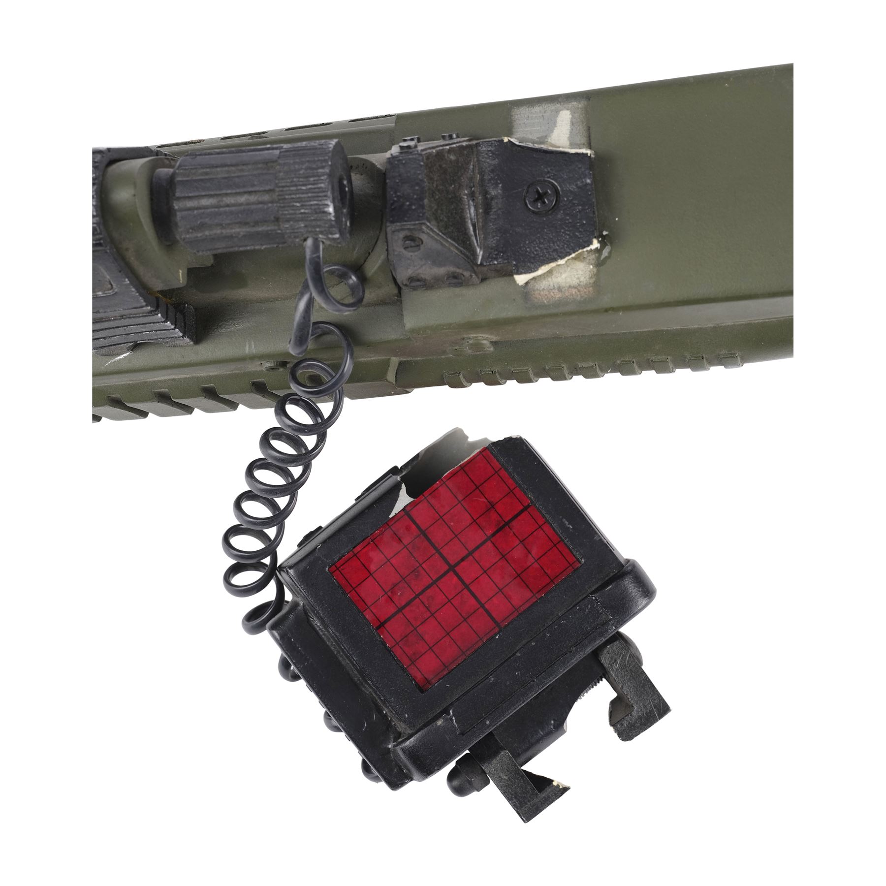 This static rifle is made of resin and rigid foam painted green with black accents with an arm support, vented barrel, and a hollow targeting array screen attached by a rubber cord. This lot exhibits cracks, exposed resin, a loose targeting screen, and notable adhesive residue. Dimensions: 33" x 14" x 5" (84 cm x 35.5 cm x 12.75)