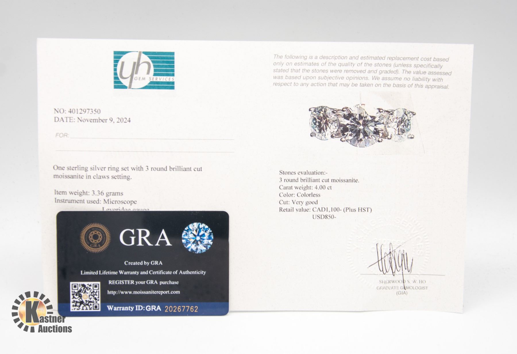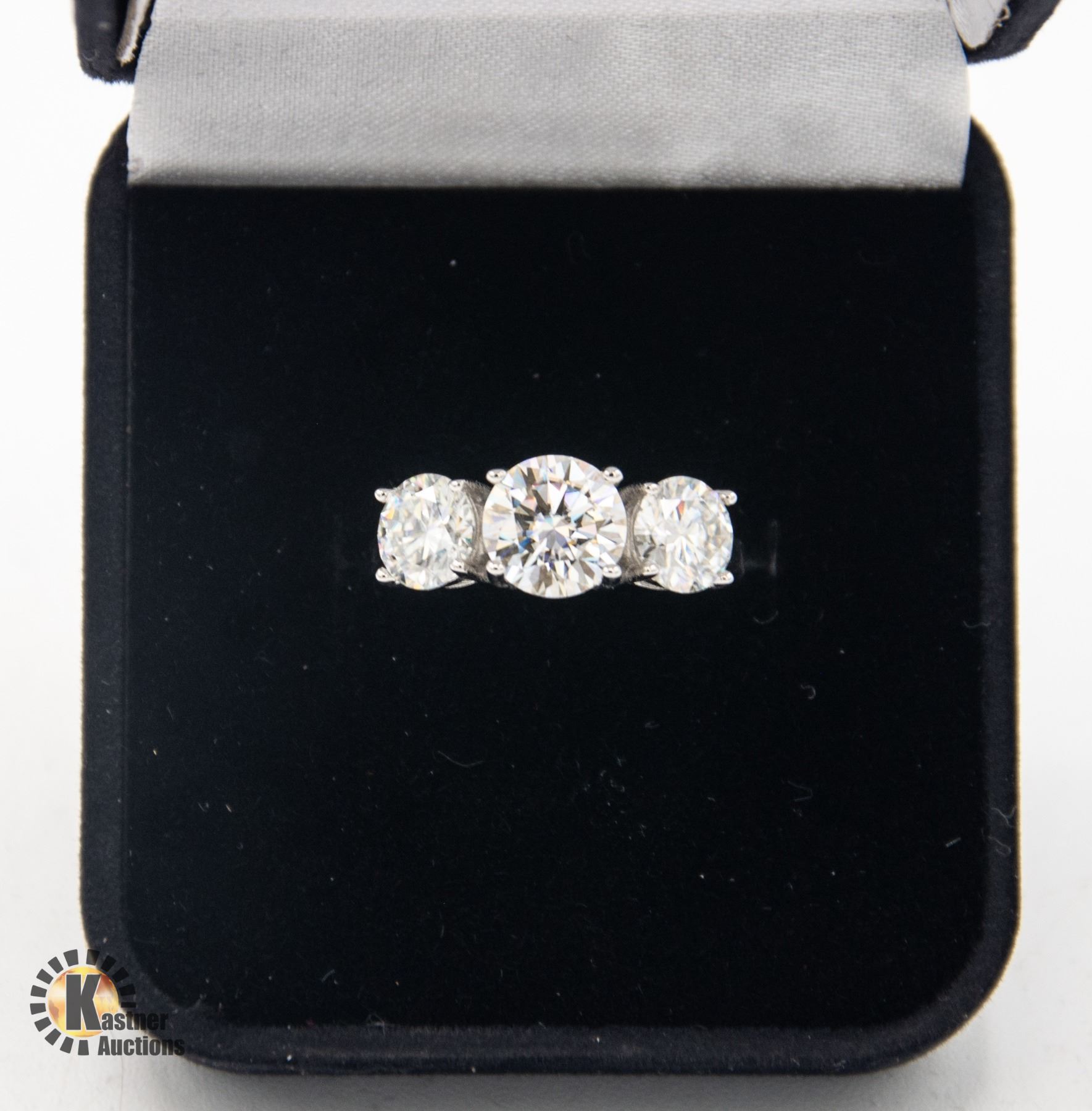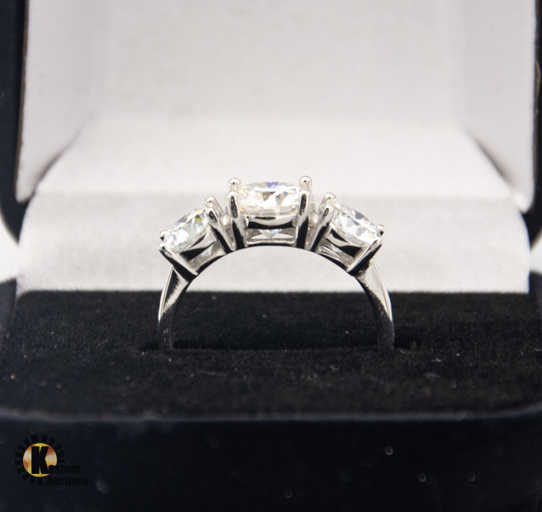 BRILLIANT CUT MOISSANITE STONE VVS D COLOR WITH 2.00 CT IN CENTER WITH 1.00 CT ON EITHER SIDE SET IN 925 SILVER RING SIZE 8 RETAIL VALUE $1,100.00