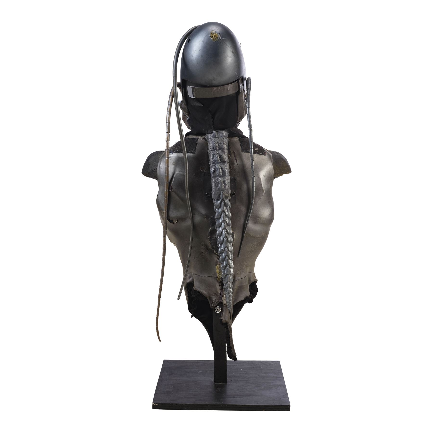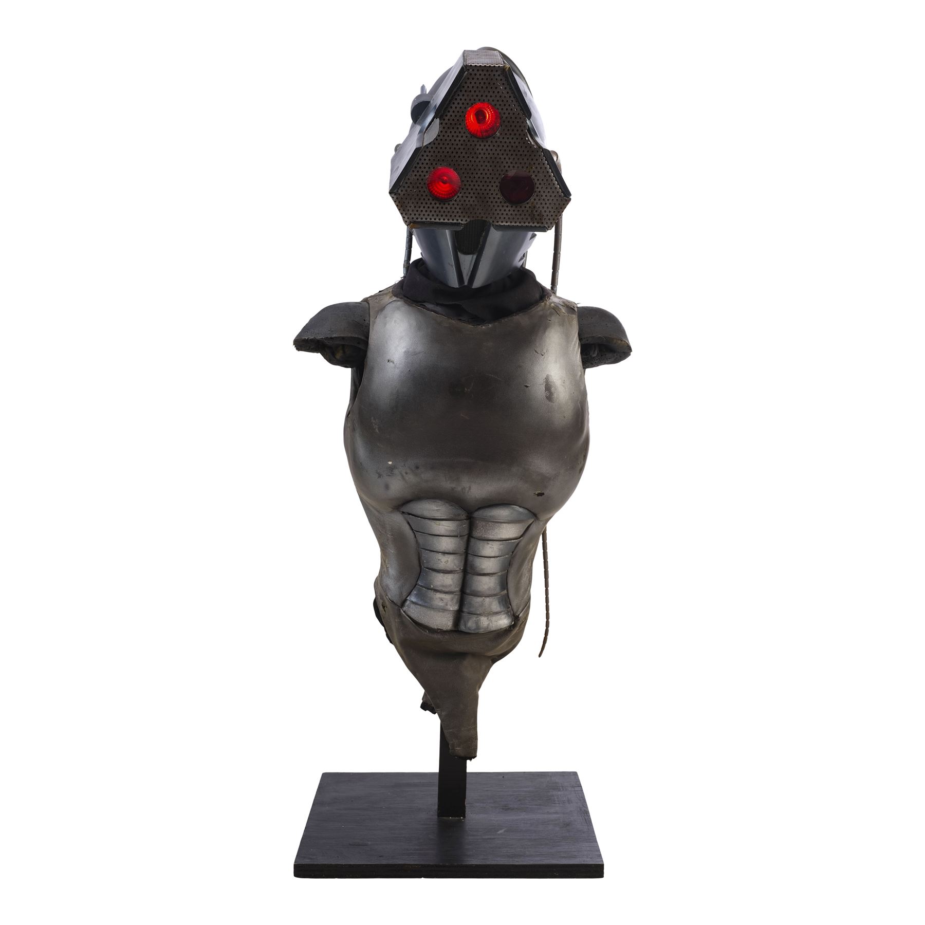 This lot consists of a dark silver-color painted fiberglass light-up helmet featuring a dark silver-color painted extended faceplate with metal grates on the sides and red cellophane lenses, silver-color painted rubber cables protruding from the sides, and lined with black foam padding and a black leather chin strap marked "Finber" and "#1"; and a black Spandex top with an adhered black painted rubber foam chest armor and sculpted spine down the back. The Spandex is adhered to a foam mannequin torso mounted on a black painted wooden base with a black painted wooden post. The helmet lights up via a switch on the underside of the faceplate. This lot exhibits glue residue and minor torn rubber. Dimensions: 18" x 12" x 40.5" (45.75 cm x 30.5 cm x 103 cm)