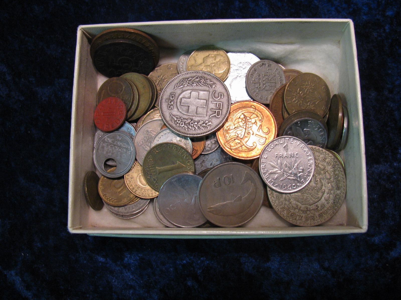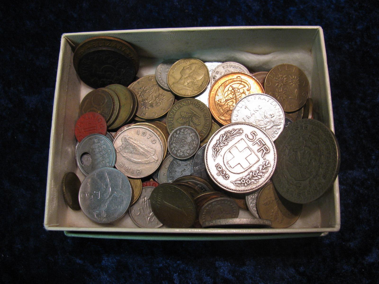 1383. (80) Assorted World Coins In Box, Some Silver Coins.