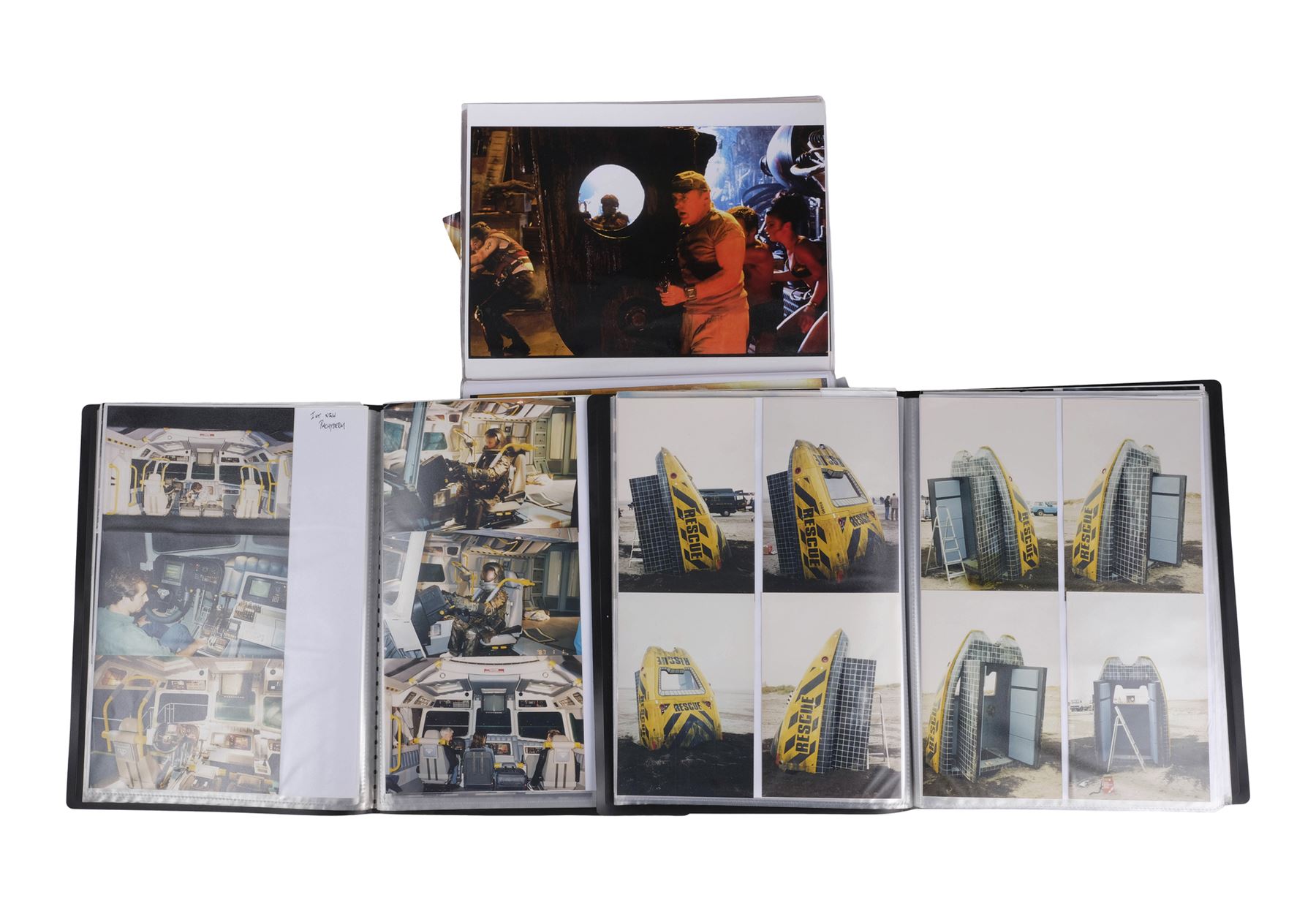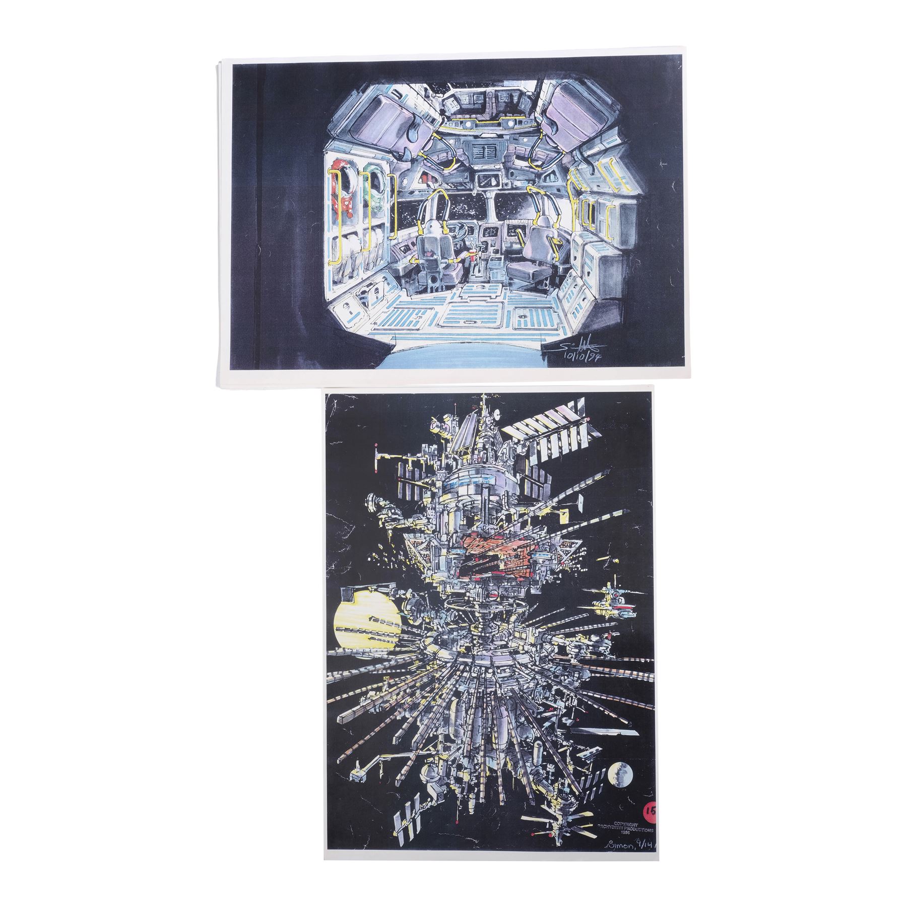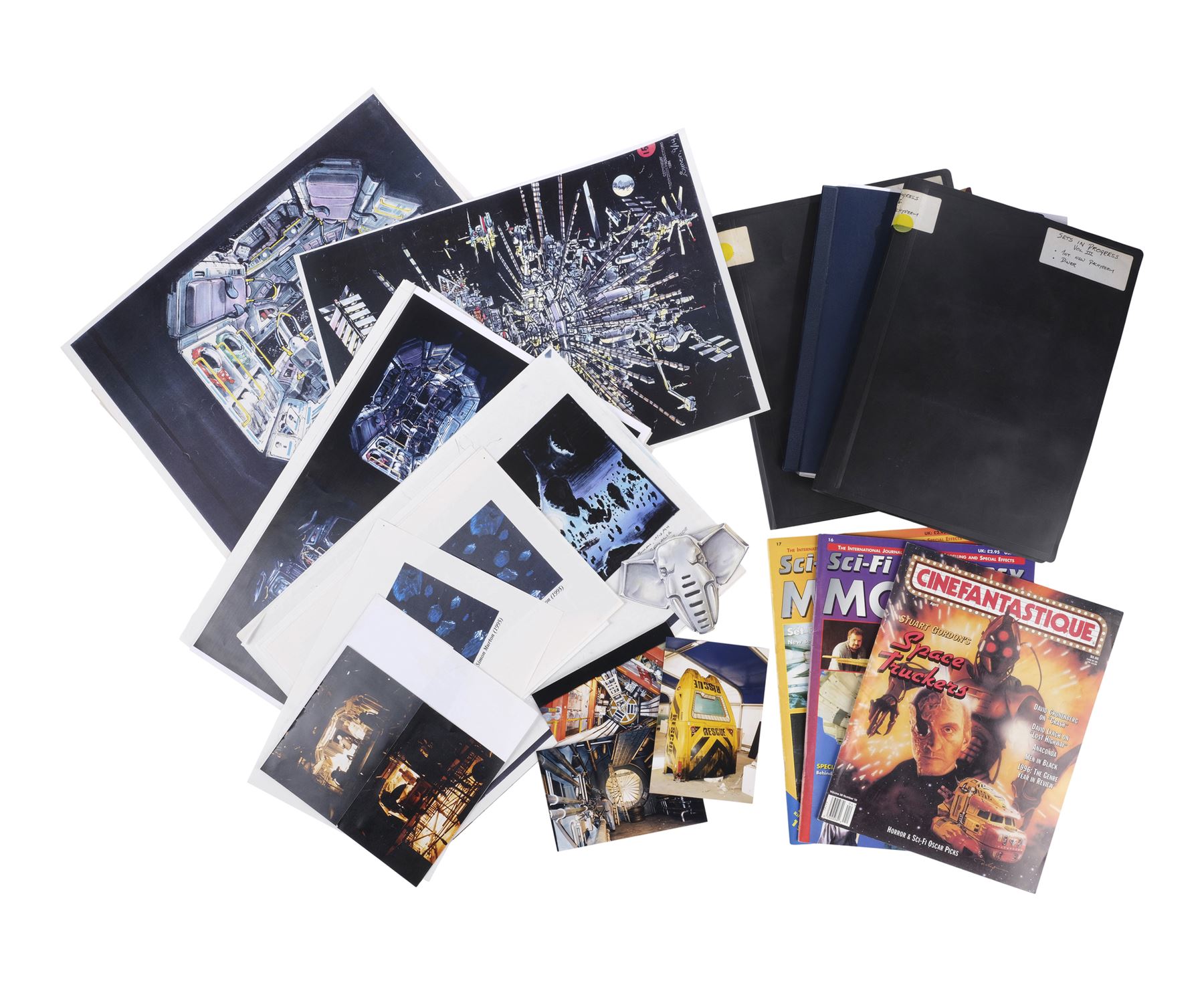 Created by film production designer Simon Murton, this lot consists of a blue vinyl folder with 21 color printed photos of the set and 16 larger color print photos; a black vinyl folder labeled "Sets in Progress (Vol II) Zesty's Pachyderm POD Kellers" on the front and spine with 66 color photos adhered to white copy paper; a black vinyl folder labeled "Sets in Progress Vol III Int. New Pachyderm Diner" on the front and spine with 90 color photos adhered to white copy paper; five color behind-the-scenes photos; 29 printed and one printed hand-illustrated concept designs; two Sci-Fi & Fantasy Models magazines issues 16 and 17 featuring articles on the model miniatures used on the film; and one Cinefantastique magazine volume 28 number 10 of Space Truckers. This lot exhibits discoloration and grime. Dimensions: (largest) 17" x 12" (43.25 cm x 30.5 cm)