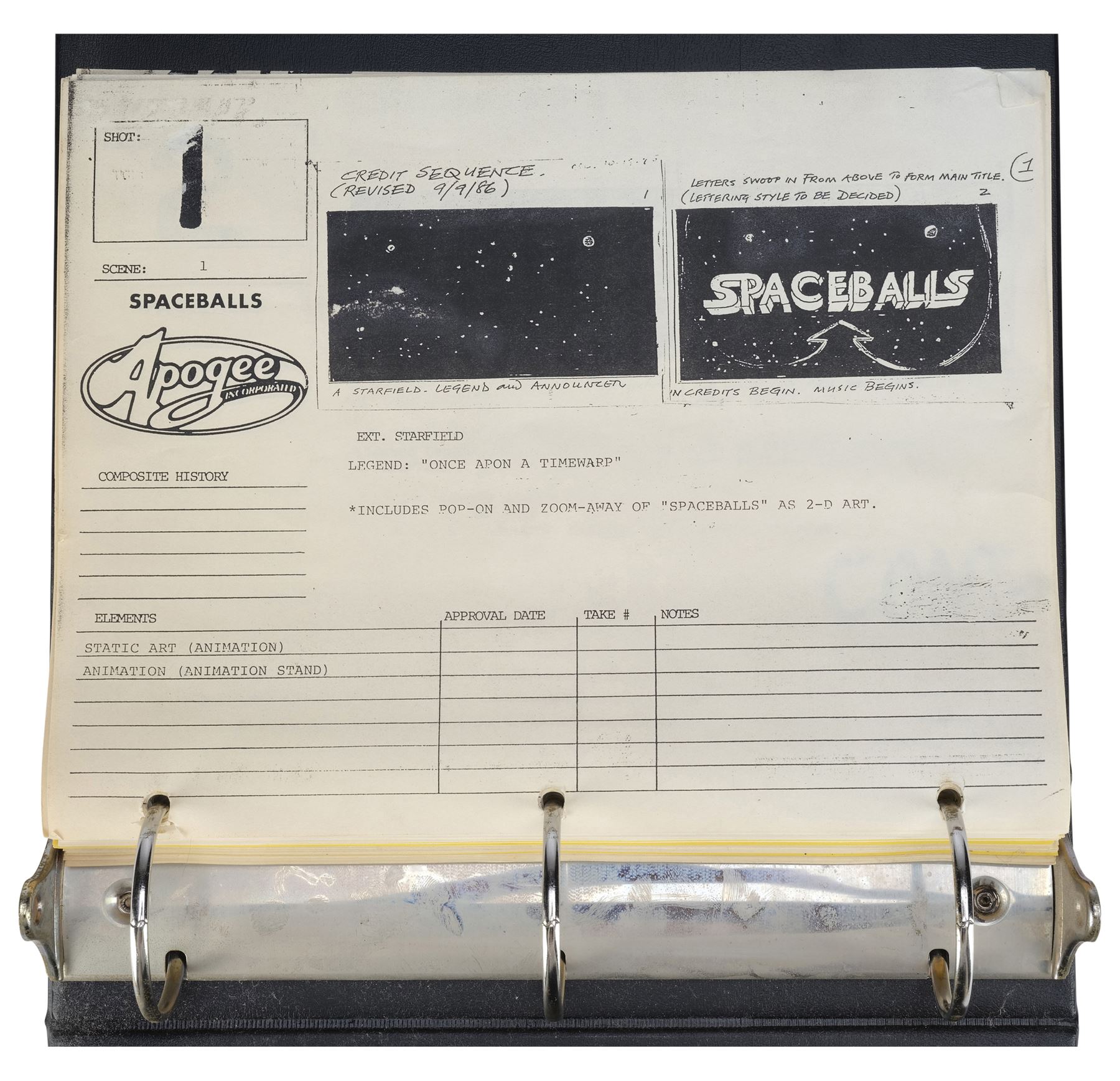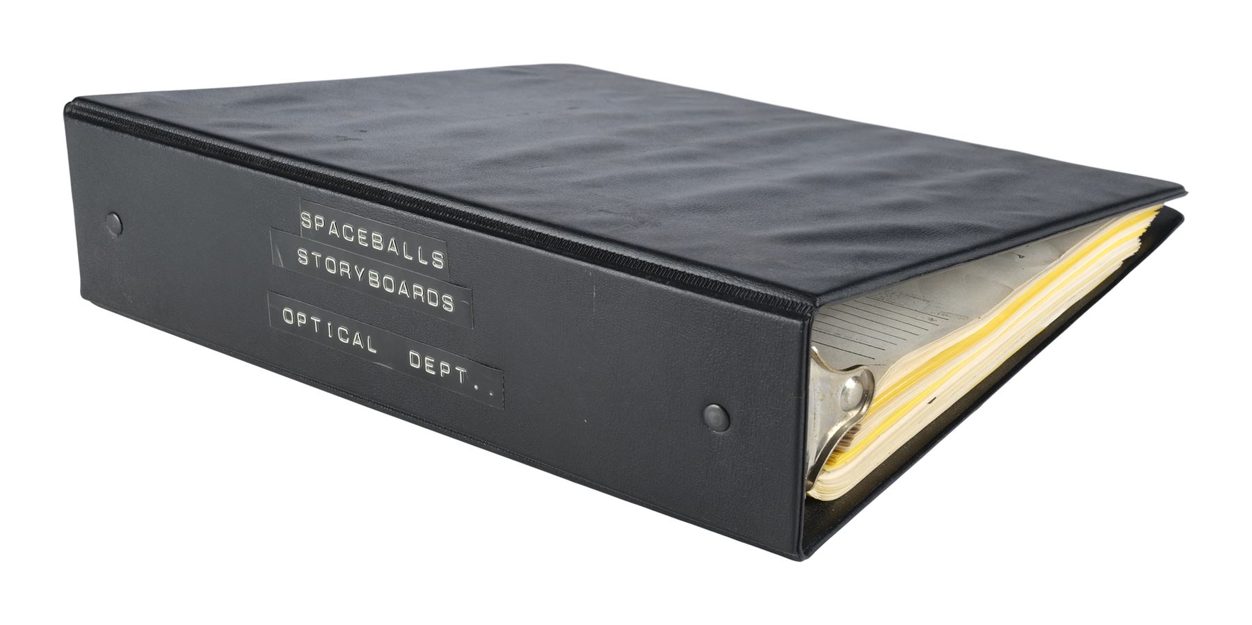 This lot consists of a black vinyl and metal three-ring binder labeled "Spaceballs Storyboards Optical Dept." with 156 pages of printed storyboards printed on white and yellow pages. A majority of the pages feature "LAD" printed along the corner. This lot exhibits sticking pages and discoloration. Dimensions: 11" x 11.5" x 3" (28 cm x 29.25 cm x 7.75 cm)