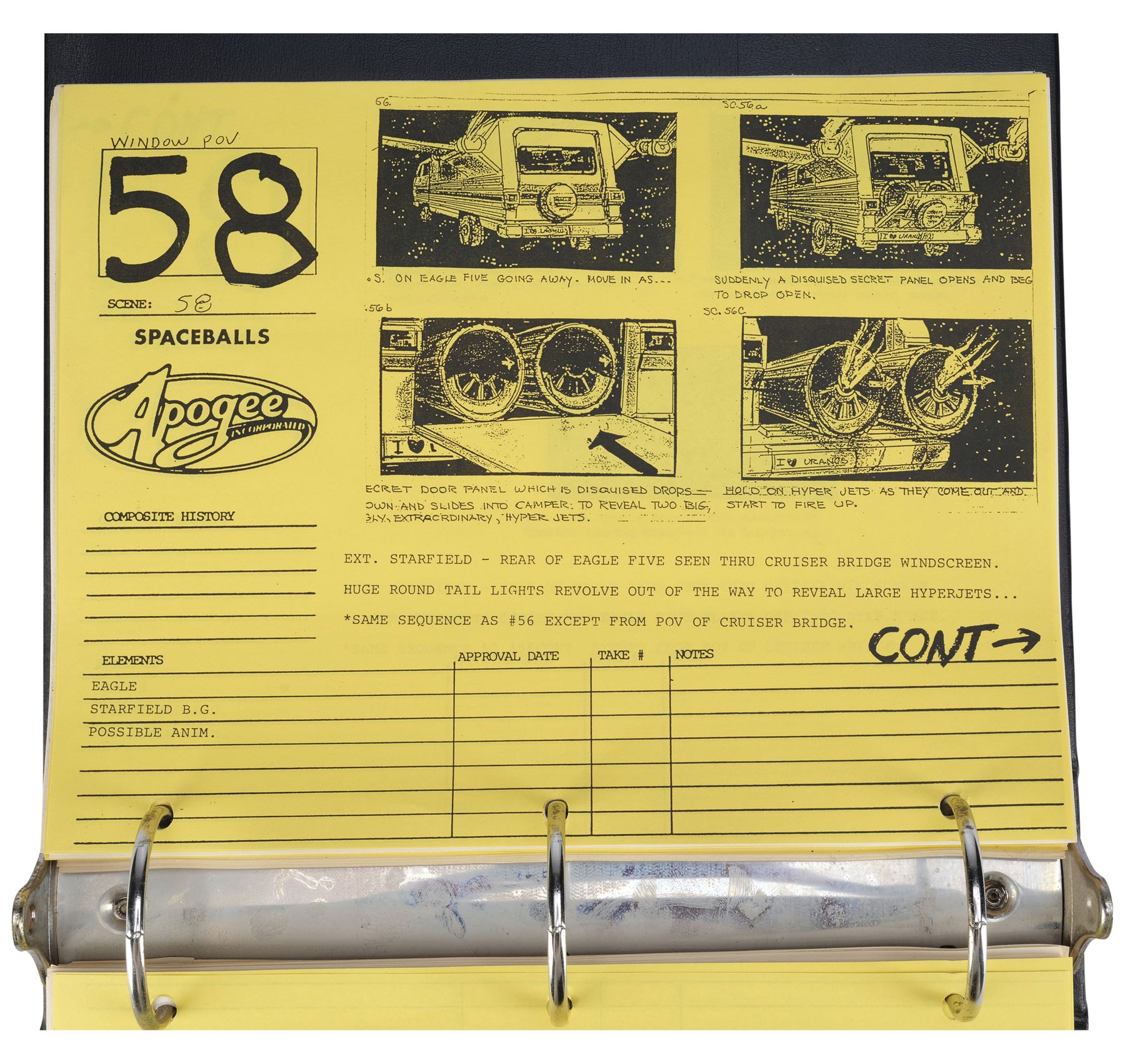 SPACEBALLS (1987) - Optical Department Storyboard Binder - An Optical Department storyboard binder from Mel Brooks' Spaceballs. Star-pilot Lone Starr (Bill Pullman) and his sidekick Barf (John Candy) were sent on a rescue mission to save Princess Vespa (Daphne Zuniga) who was targeted by Dark Helmet (Rick Moranis).