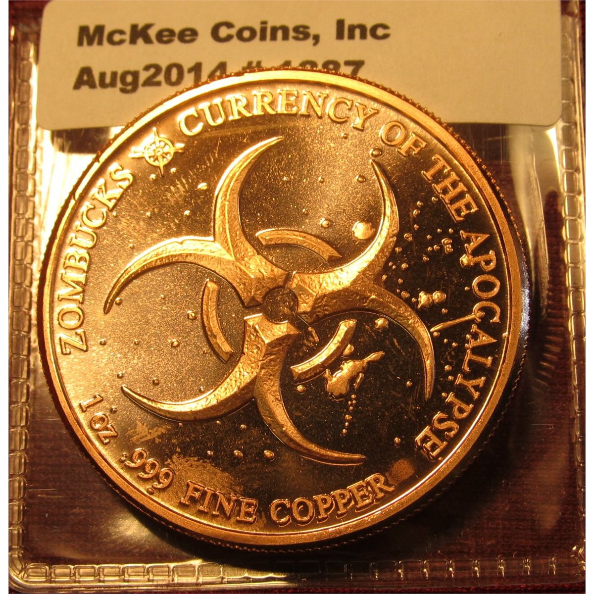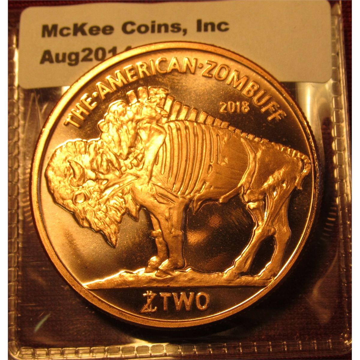 1387. 1 ounce copper round – 2018 ZomBU ff (from the popular ZomBU cks series) design – features a skeletized zombie Buffalo