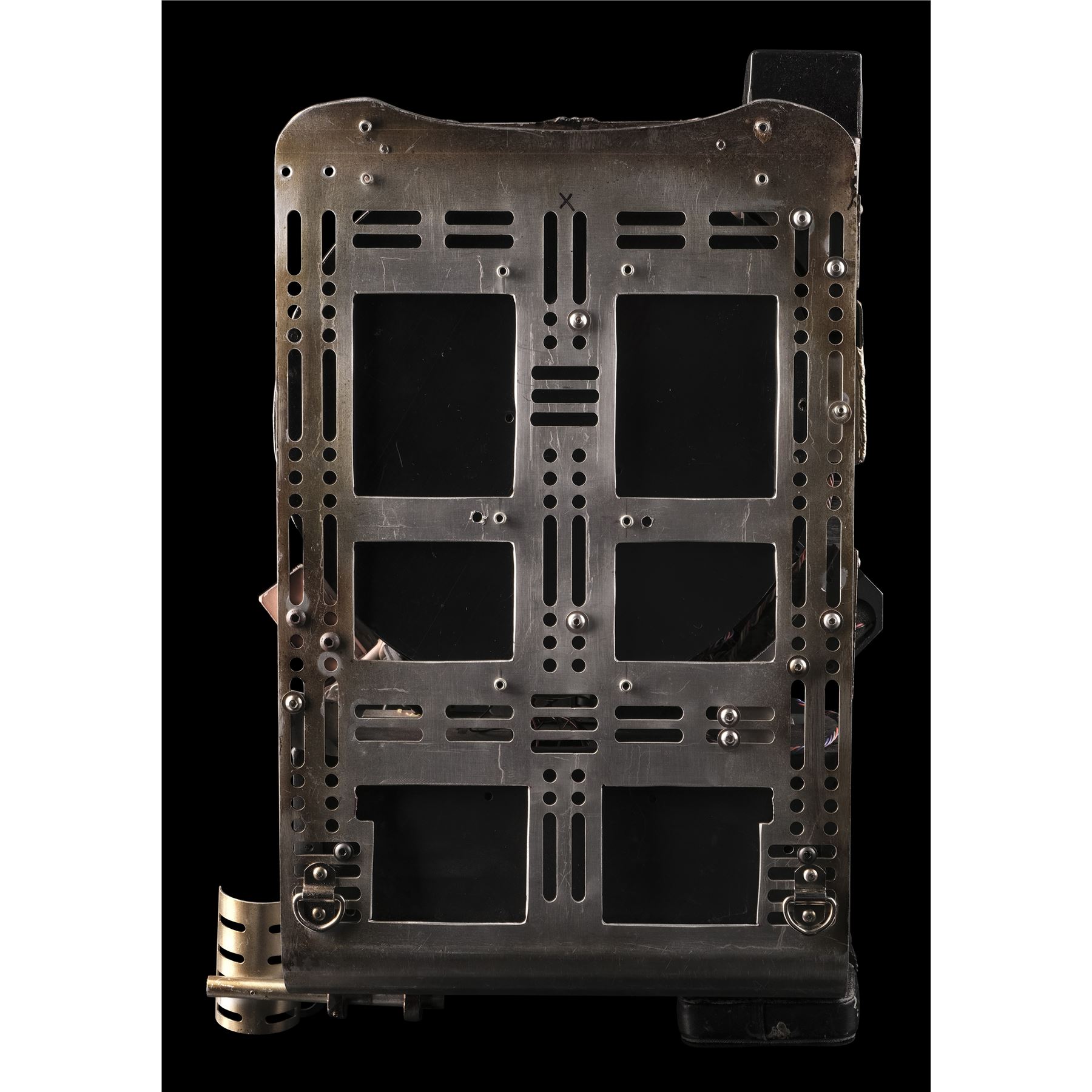 This lot consists of a silver-color metal proton wand with a gray resin casing and metal handles; and a metal, plastic, and rubber proton pack with various metal cables, wires, mesh, and an orange and gray nylon harness marked "3" with fastening strips and plastic buckles. The wand features a wire connector to the pack and a production-applied high-voltage and radiation "Warning" label. Battery-operated switches on the pack cause the coiled cables and control boxes to illuminate, while the illuminated tip of the wand is activated with the press of a button and powered by a 9V battery. Production intentionally distressed the pack and wand. The proton packs are believed to have been used by different actors at different times, though this pack shows evidence of the decal detailing for specifically Yates. The proton pack has a triangular area of adhesive residue present where the triangular caution decal unique to Yates' pack was previously applied. This lot exhibits notable discoloration on the finish from abrasion, chipped paint, and a missing switch on the wand. Dimensions: 30" x 24" x 11.5" (76.25 cm x 61 cm x 29.25 cm)