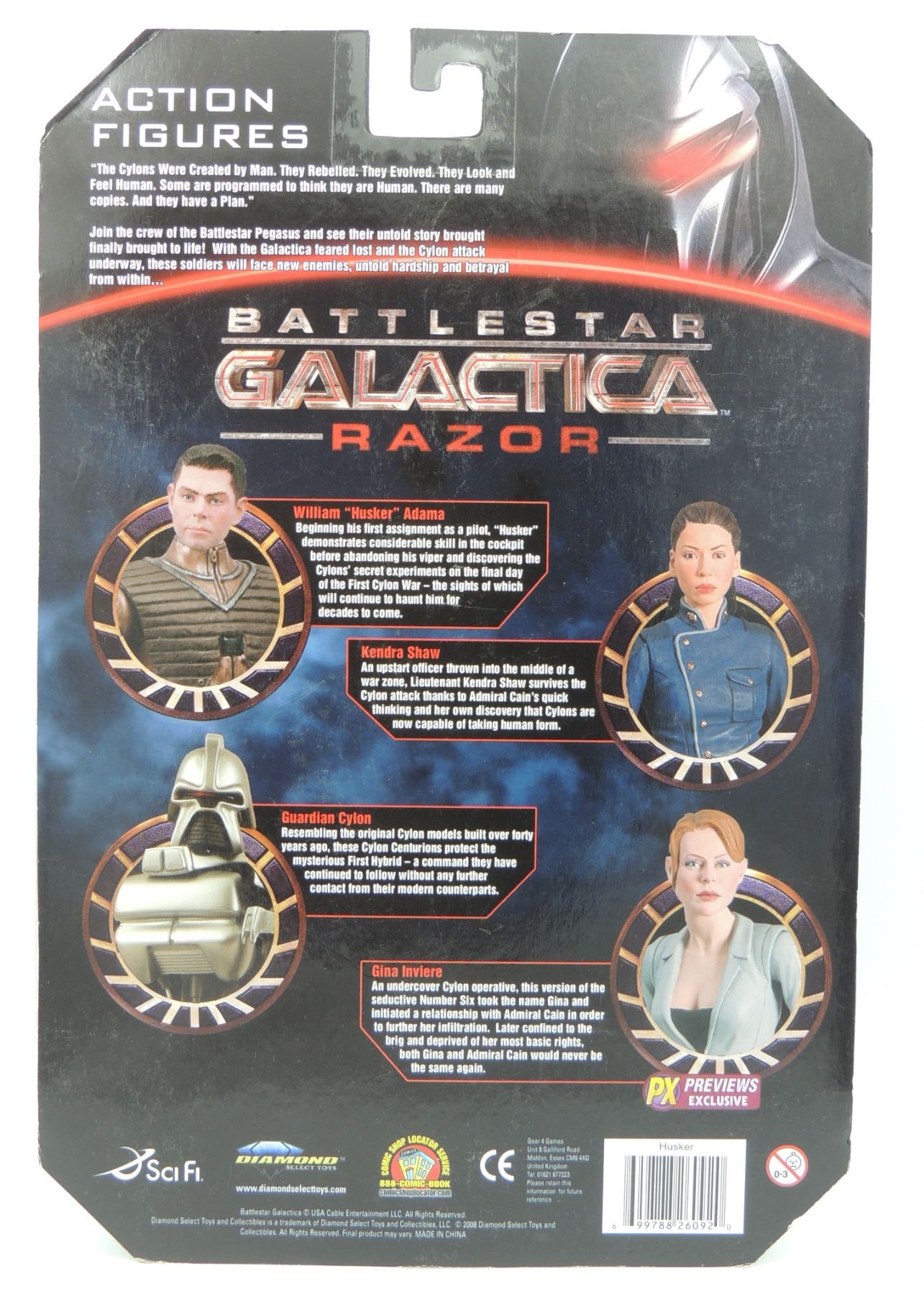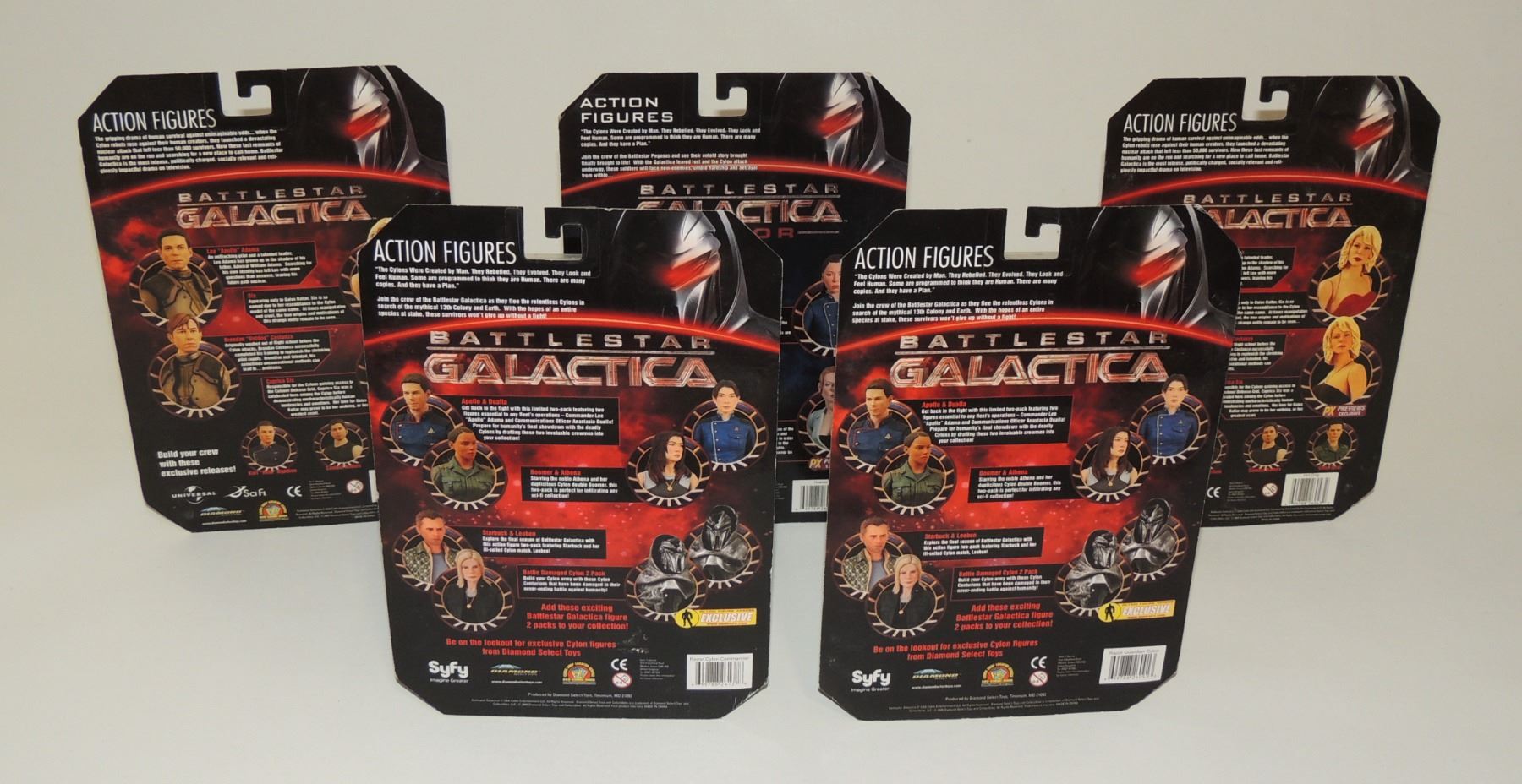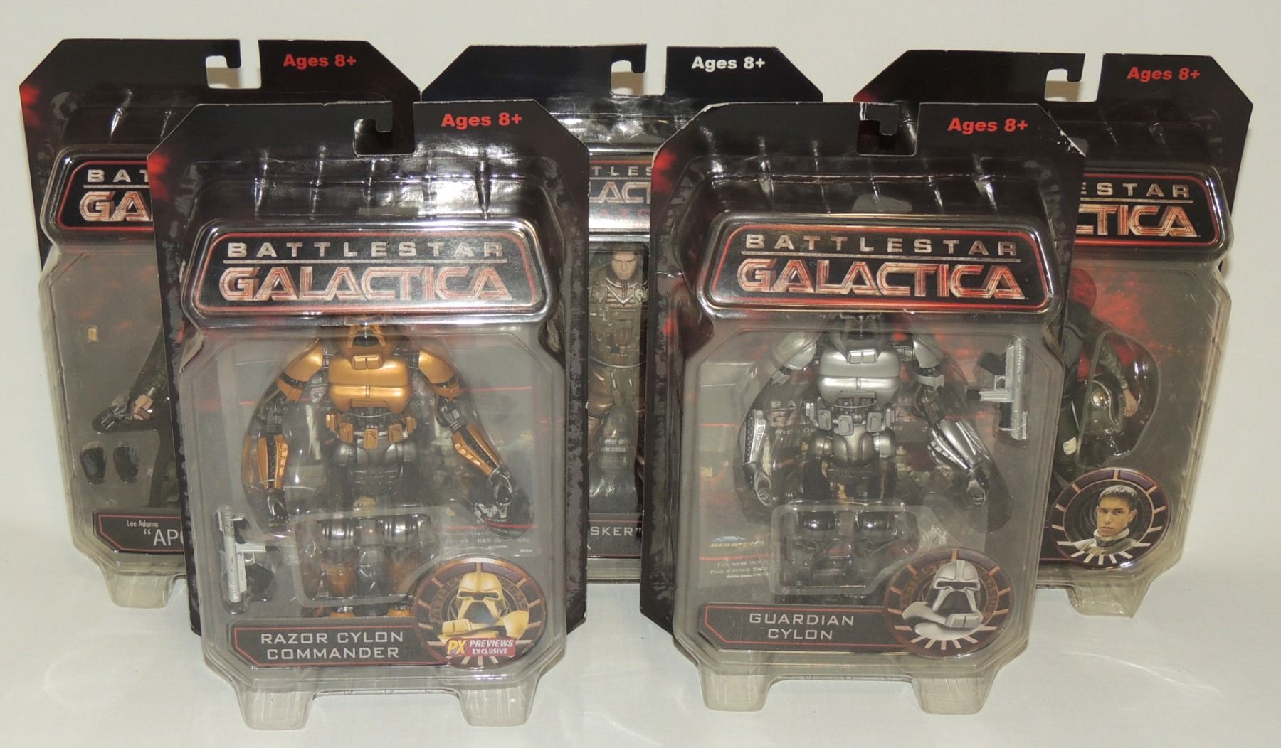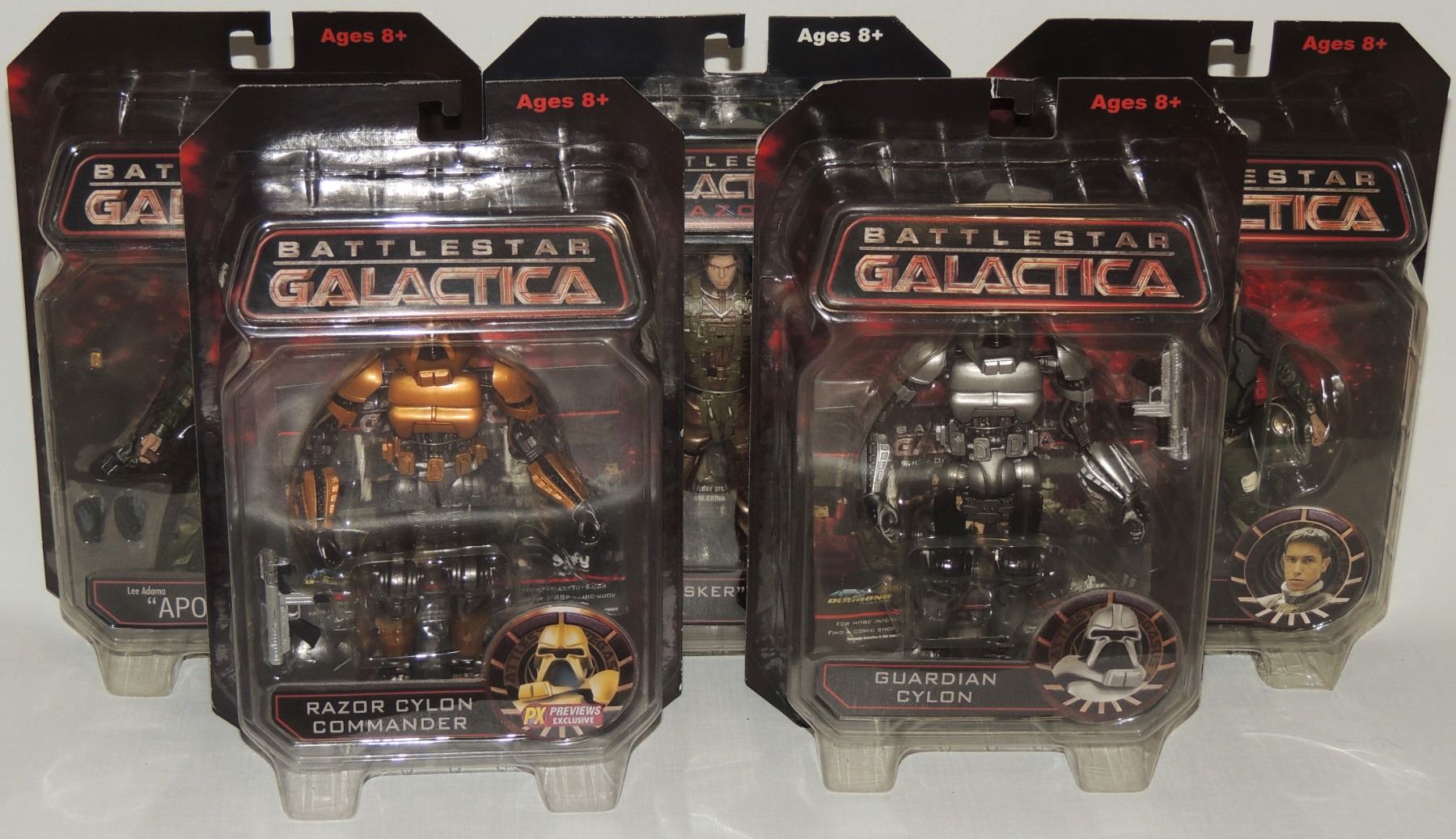 LOT OF 5 2009 ACTION FIGURES INCLUDING GUARDIAN CYLON, RAZOR CYLON COMMANDER PX PREVIEWS EXCLUSIVE, WILLIAM HUSKER ADAMA, APOLLO AND HOT DOG - SEALED ACTION FIGURES FROM 2000'S TV SERIES BATTLESTAR GALACTICA DIAMOND SELECT SCIFI UNIVERSAL