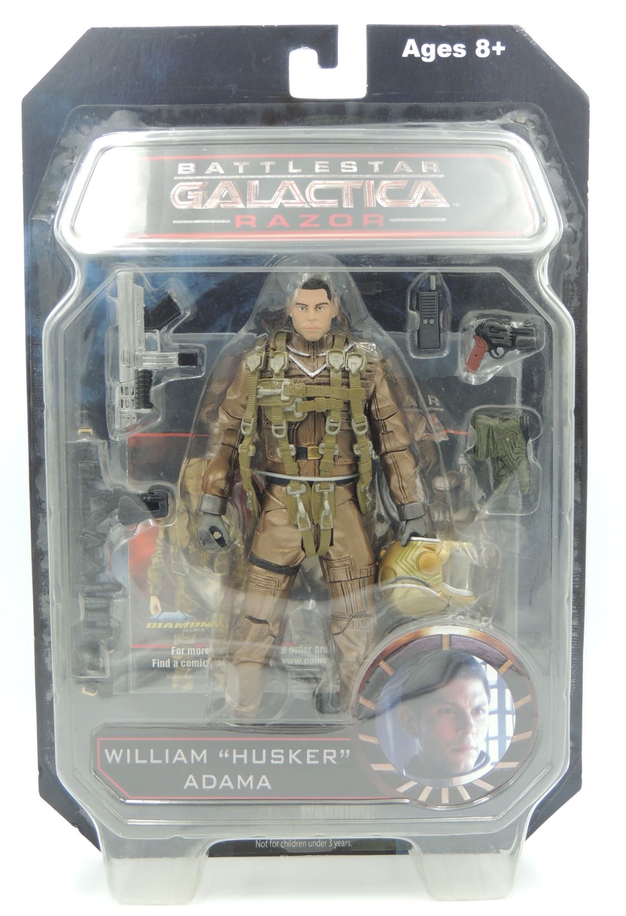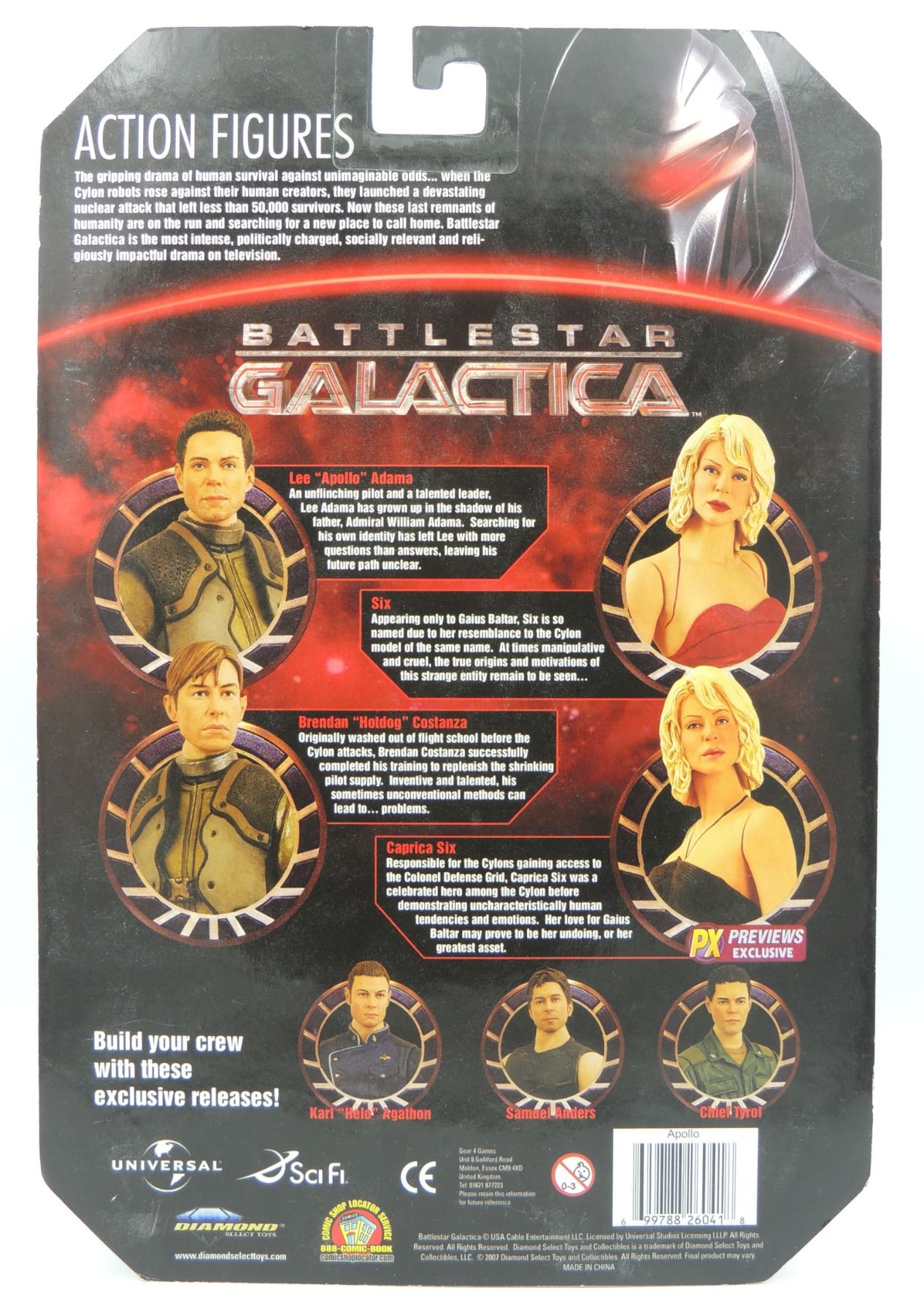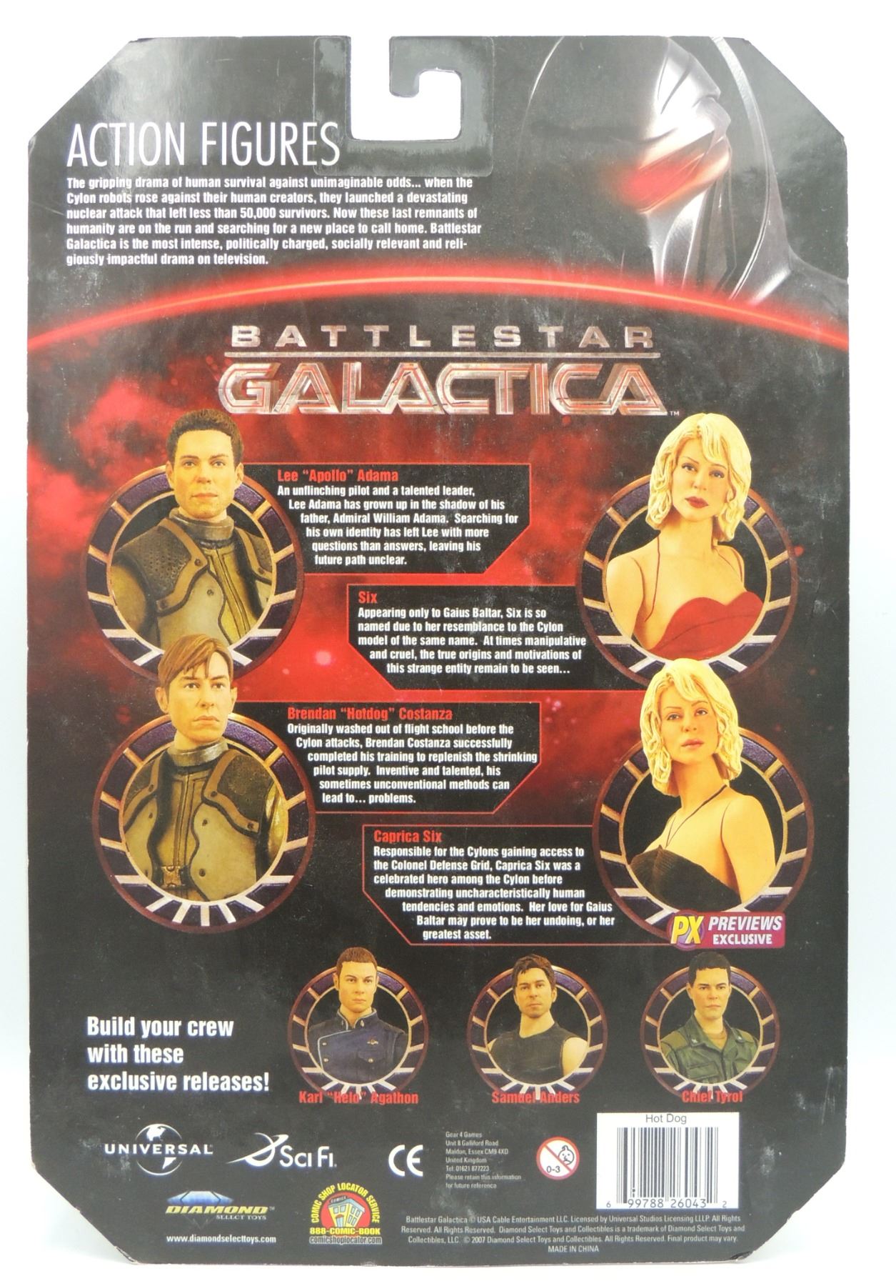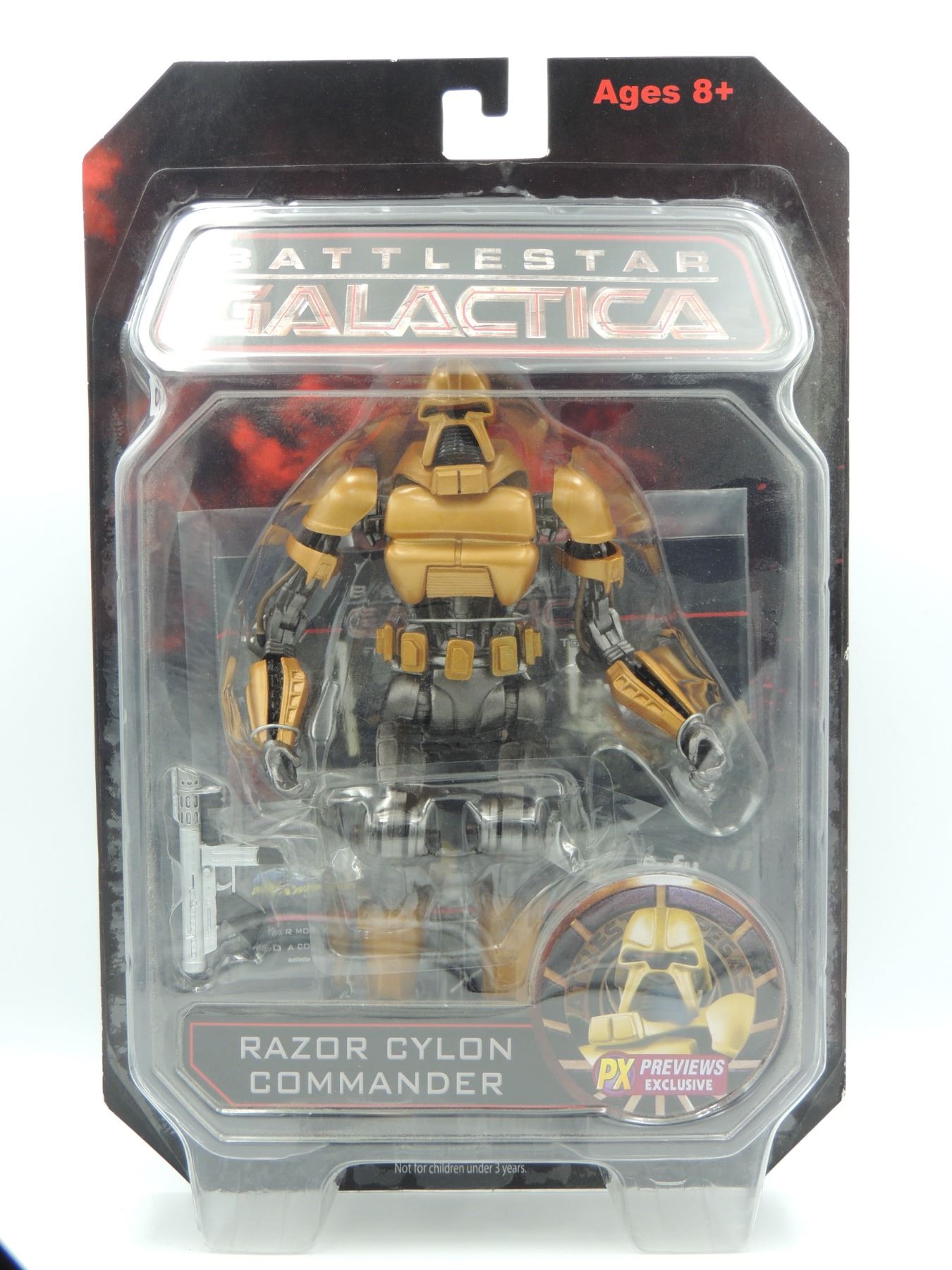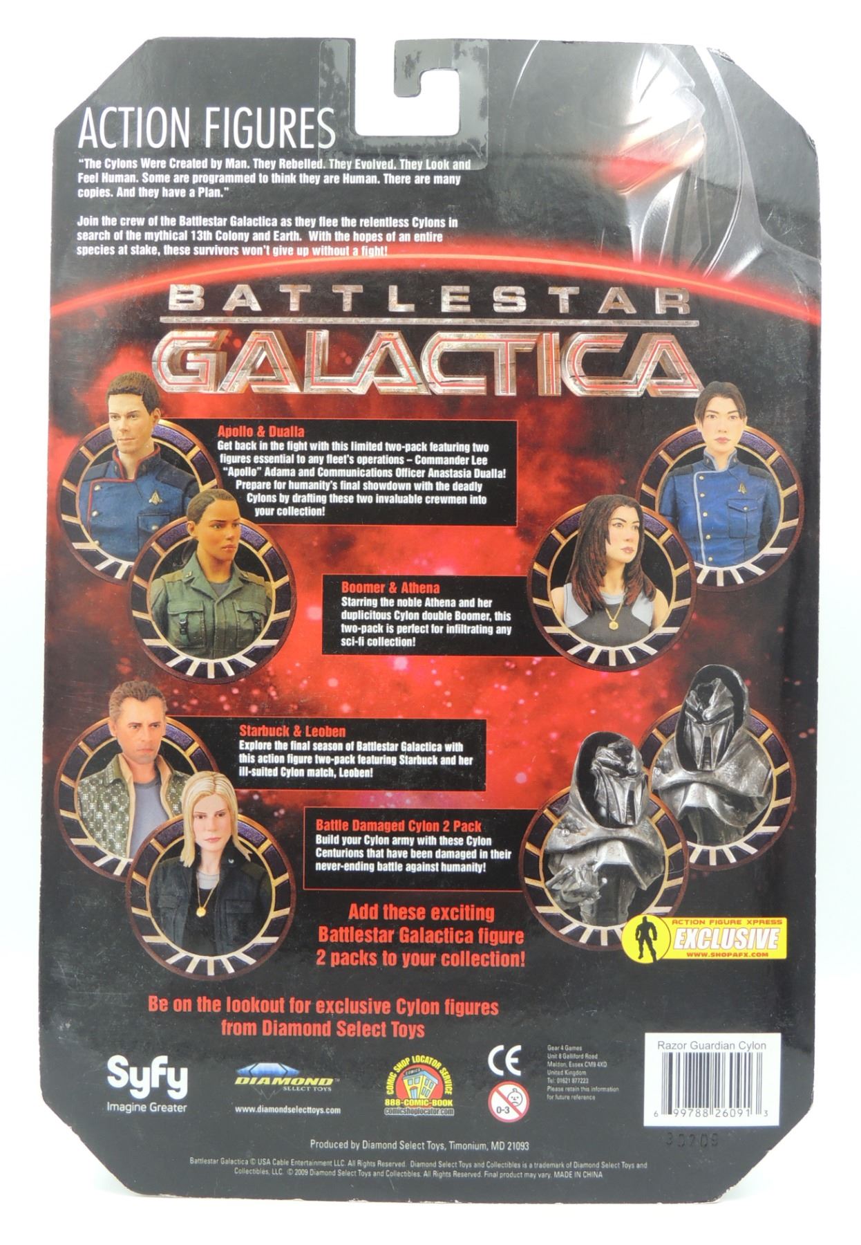 LOT OF 5 2009 ACTION FIGURES INCLUDING GUARDIAN CYLON, RAZOR CYLON COMMANDER PX PREVIEWS EXCLUSIVE, WILLIAM HUSKER ADAMA, APOLLO AND HOT DOG - SEALED ACTION FIGURES FROM 2000'S TV SERIES BATTLESTAR GALACTICA DIAMOND SELECT SCIFI UNIVERSAL