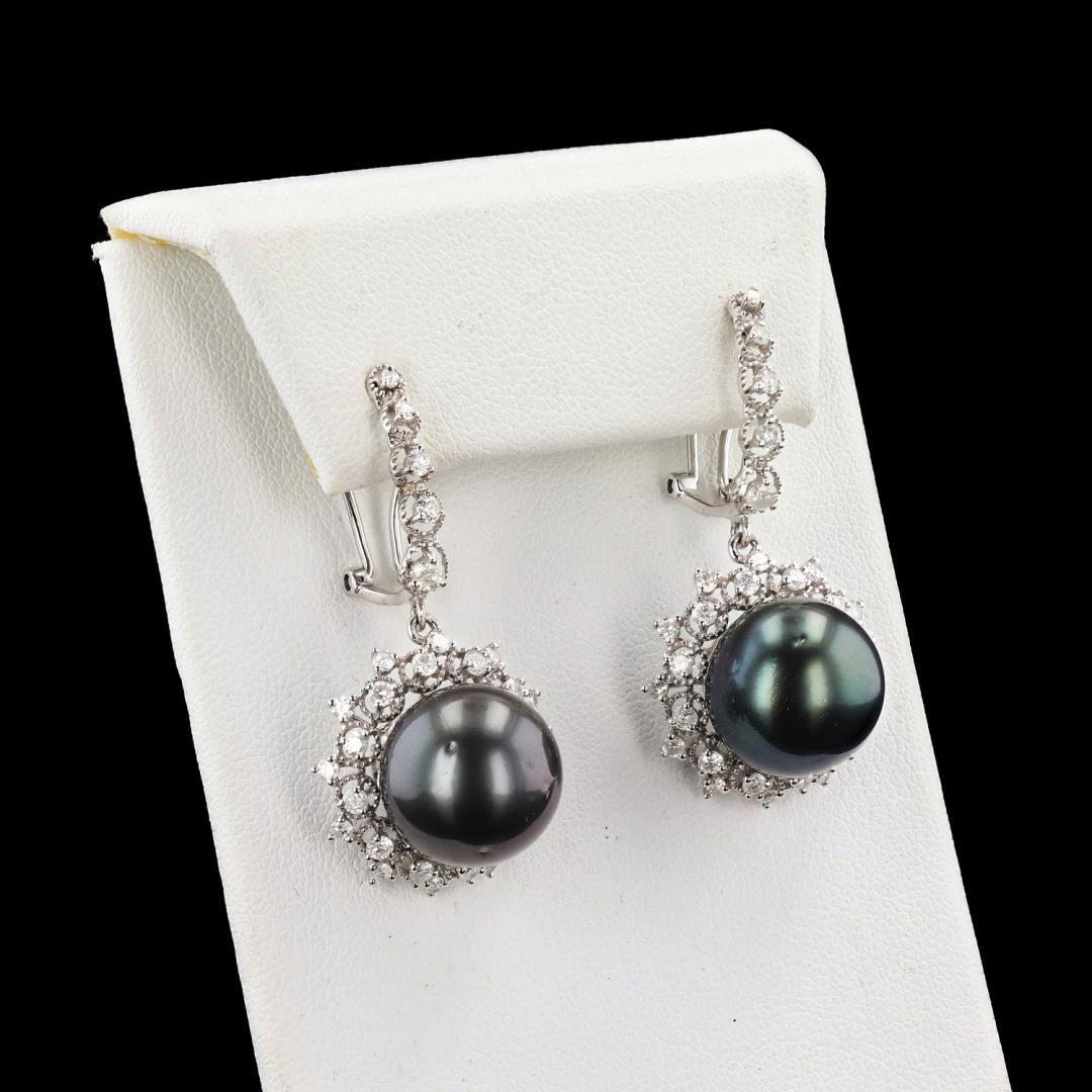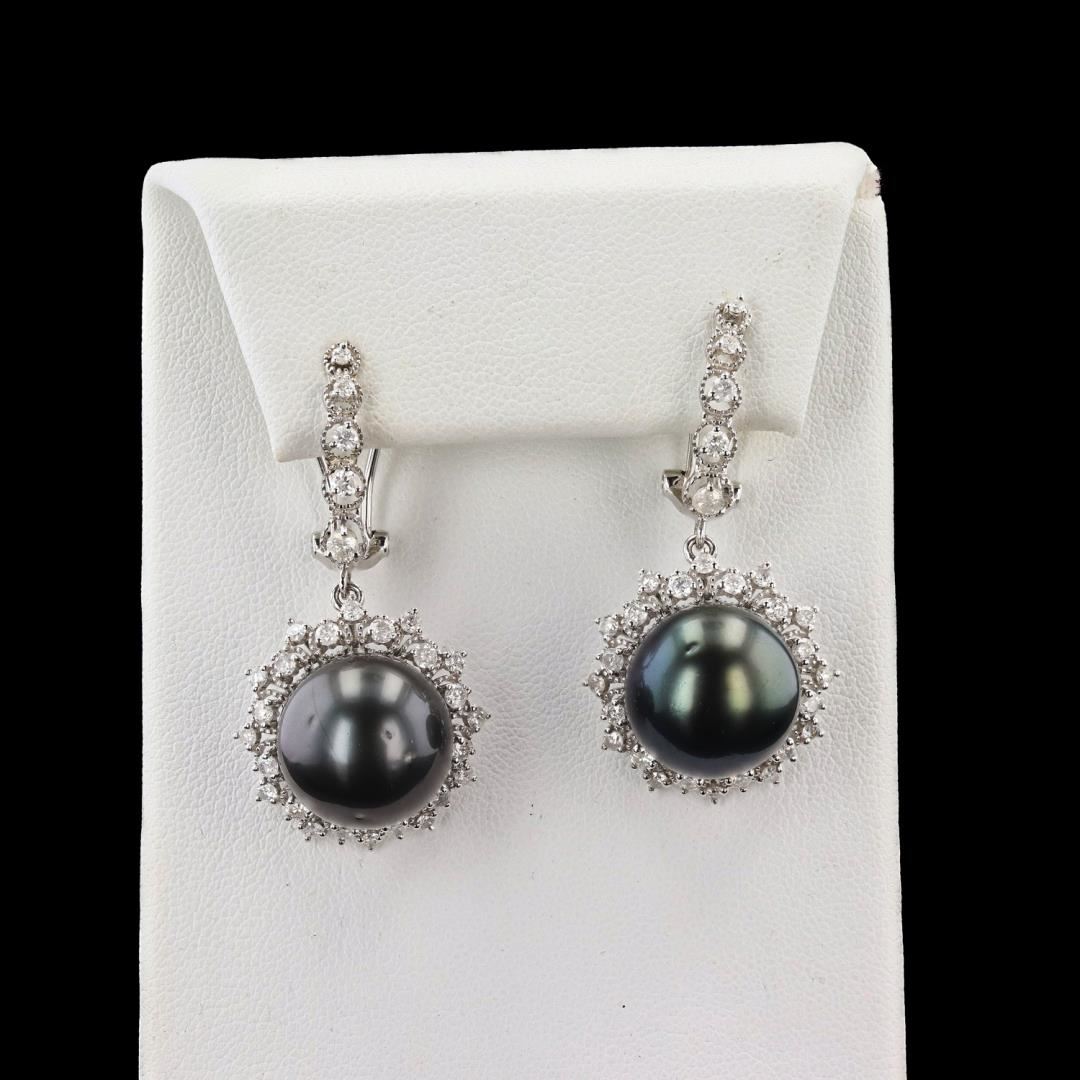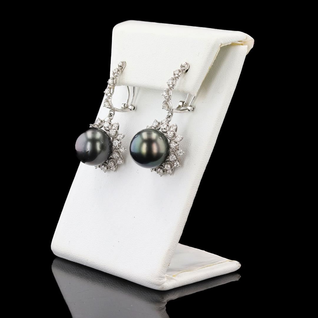Description: Fourteen karat (14K) white gold cultured Tahitian south sea pearl and diamond earrings. Two (2) cultured Tahitian south sea pearls are needle mounted in the center of the earrings. Round brilliant cut diamonds accent the earrings around the center pearls and on the top clasps. The earrings are cast stamped "14K" and have a gross weight of 14.7 Grams. Diamond(s): Shape: Round Brilliant cut Weight: 1.64 carat Average Clarity: I1-I2 Average Color: H-J Symmetry: Very Good Polish: Very Good Pearl(s): Quantity: 2 Nature: Cultured Tahitian South Sea Pearl Size: 13.6-13.8mm Shape: Round Color: Dark Greyish Silver (Aubergine) Blemish: Clean (CI) Nacre: Medium-Thick Luster: Very Good (VG) Orient: Yes Matching: Excellent (E) Metal(s): Metal: Gold, Stamped Purity: 14K Color: White Condition: Excellent Finish: High polish #LREF-3393