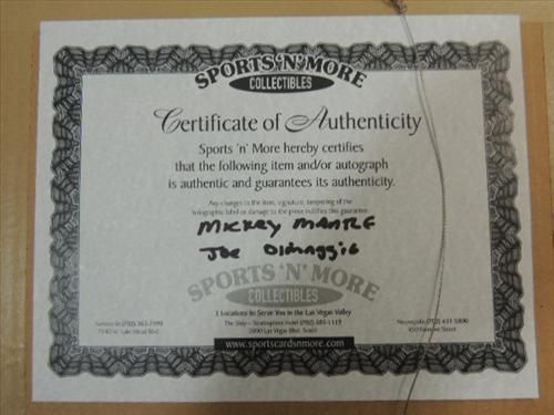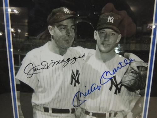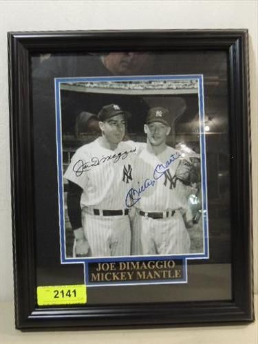 13X16 FRAMED BASEBALL PHOTO 2 AUTOGRAPHS: MICKEY MANTLE & JOE DIMAGGIO. INCLUDES COA FROM SPORTS N MORE. AS SHOWN. VIEW PICTURE FOR DETAIL. PLEASE BE ADVISED, AND INFORMED REGARDING SIGNATURES OR AUTOGRAPHS THAT WE SELL AT AUCTION: WE ARE NOT AUTHENTICATORS, AND WE DO NOT AUTHENTICATE, OR VALIDATE ANY AUTOGRAPHS OR SIGNATURES THAT WE OFFER AT AUCTION. SOME AUTOGRAPHS OR SIGNATURES MAY COME WITH AN AUTHENTICATION FROM ANY ONE OF LITERALLY HUNDREDS OF AUTHENTICATORS ACROSS THE COUNTRY, AND AROUND THE WORLD. WE DO NOT ENDORSE ANY AUTHENTICATOR, NOR DO WE GUARANTEE THAT ANY AUTOGRAPH OR SIGNATURE IS AUTHENTIC, OR THAT IT WILL PASS AUTHENTICATION BY ANY AUTHENTICATOR. ALL AUTOGRAPHS OR SIGNATURES ARE SOLD