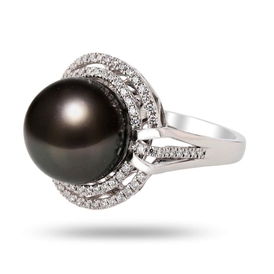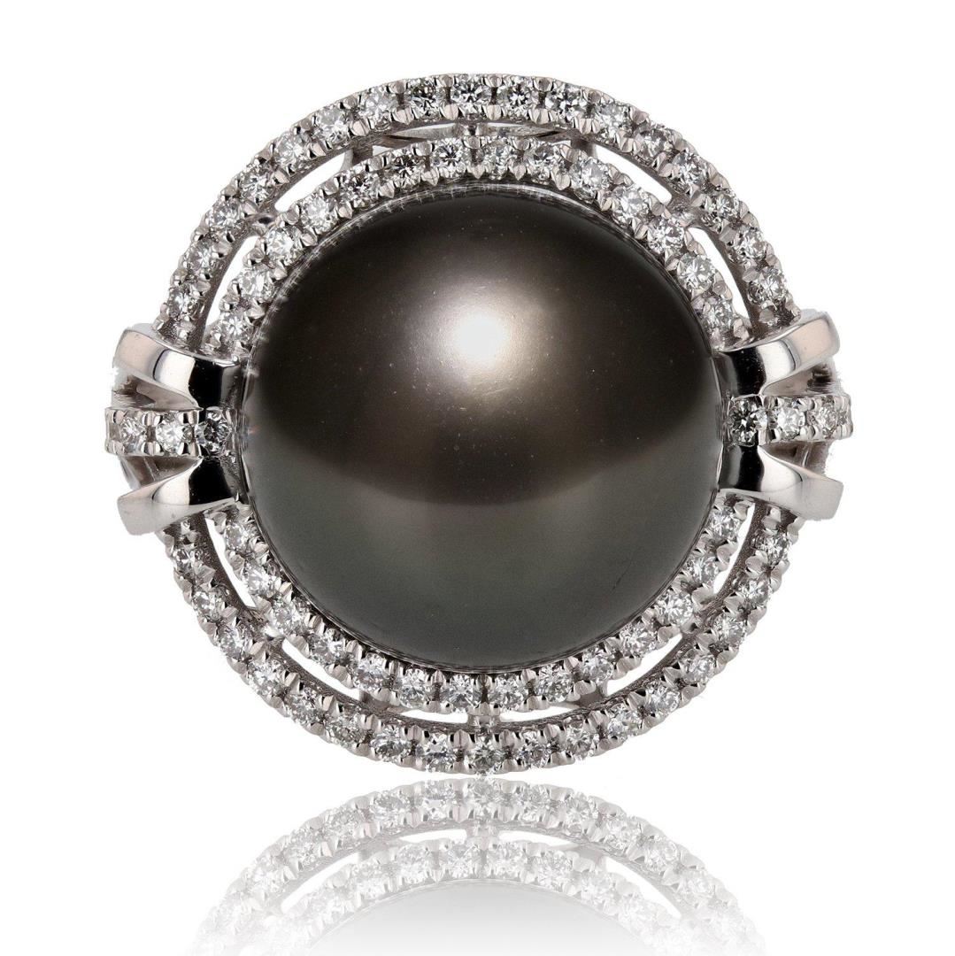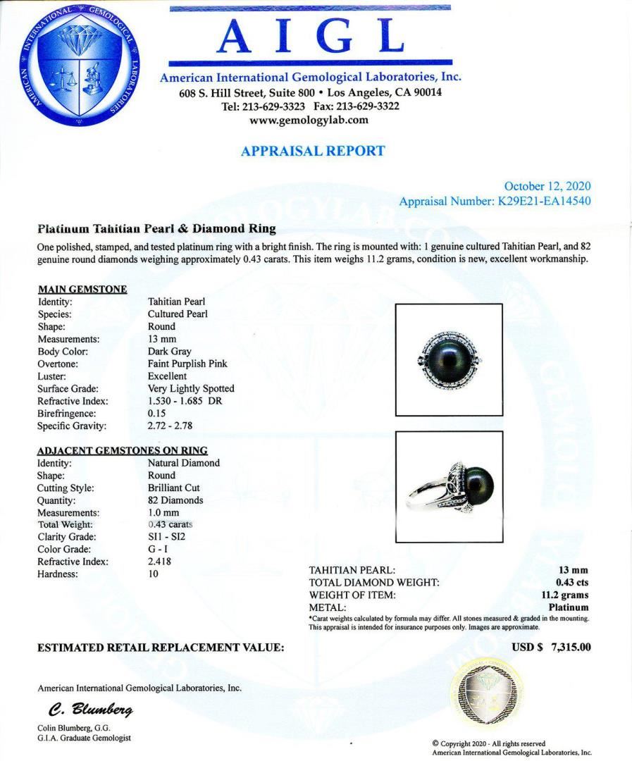 Platinum Tahitian Pearl & Diamond Ring One polished, stamped, and tested platinum ring with a bright finish. The ring is mounted with: 1 genuine cultured Tahitian Pearl, and 82 genuine round diamonds weighing approximately 0.43 carats. This item weighs 11.2 grams, condition is new, excellent workmanship. MAIN GEMSTONE Identity: Tahitian Pearl Species: Cultured Pearl Shape: Round Measurements: 13mm Body Color: Dark Gray Overtone: Faint Purplish Pink Luster: Excellent Surface Grade: Very Lightly Spotted Refractive Index: 1.530 - 1.685 DR Birefringence: 0.15 Specific Gravity: 2.72 - 2.78 ADJACENT GEMSTONES ON RING Identity: Natural Diamond Shape: Round Cutting Style: Brilliant Cut Quantity: 82 Diamonds Measurements: 1.0mm Total Weight: 0.43 carats Clarity Grade: SI1 to SI2 Color Grade: G - I Refractive Index: 2.418 Hardness: 10 TAHITIAN PEARL: 13mm TOTAL DIAMOND WEIGHT: 0.43ctw WEIGHT OF ITEM: 11.2 grams METAL: Platinum #LREF-2921