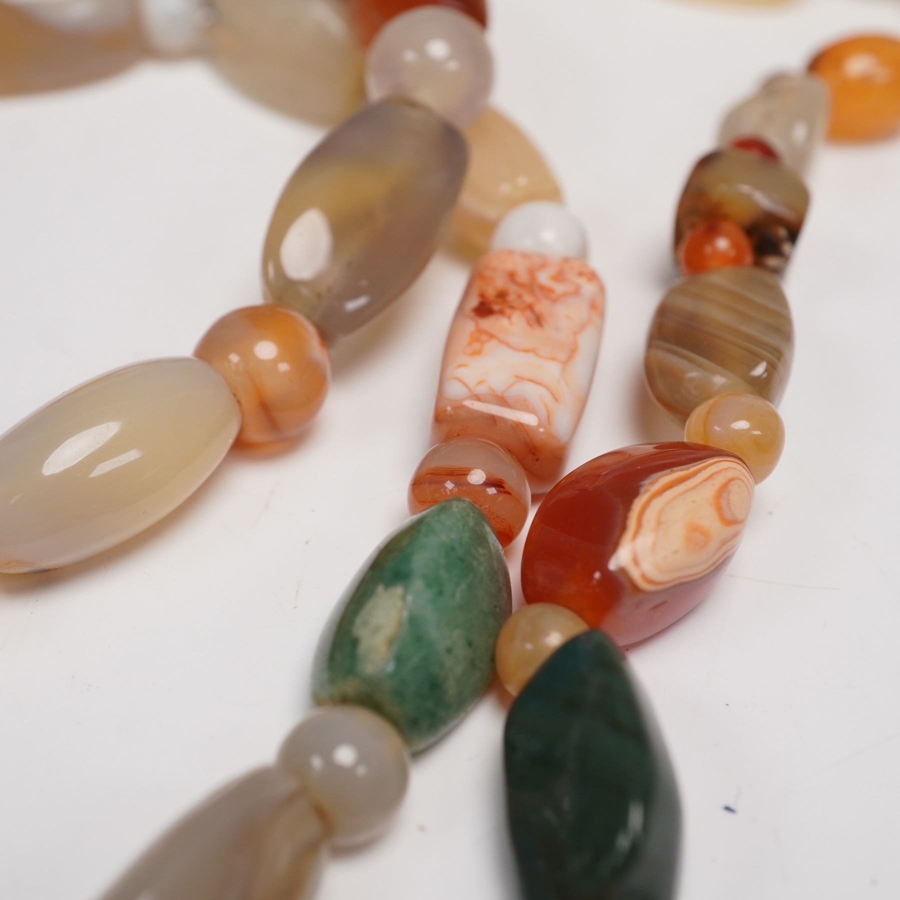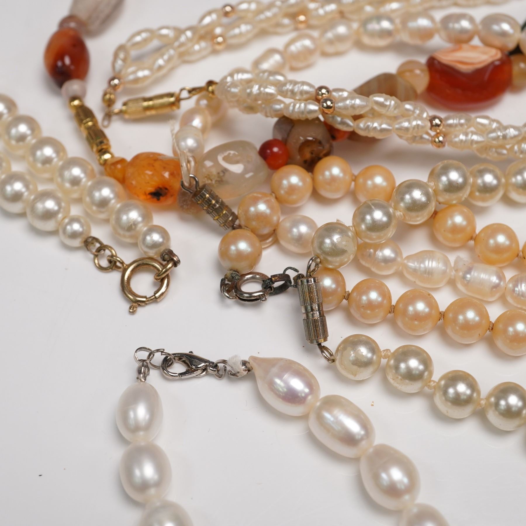 A diverse collection of thirteen beaded necklaces featuring a range of materials and styles, including polished agate and mixed hardstone beads in earth tones and rich green, amber, and carnelian hues, alongside imitation and freshwater pearl strands in cream, blush, and golden tones. Several pieces are accented with metal spacers, including gold-tone and silver-tone findings. One necklace is adorned with a stylized silver and gold-tone heart pendant with inset rhinestone. The group includes choker- to opera-length strands, approximately 18 to 36 inches in length.