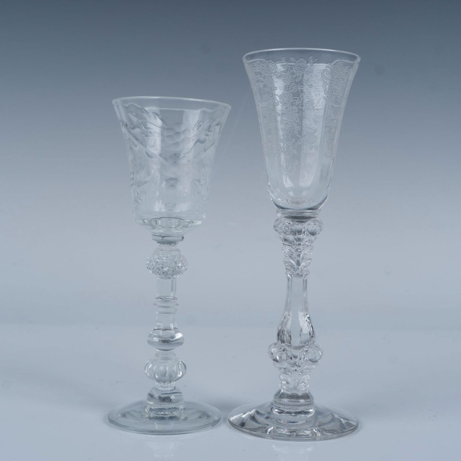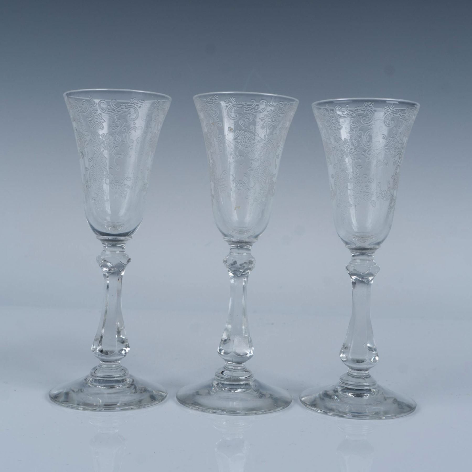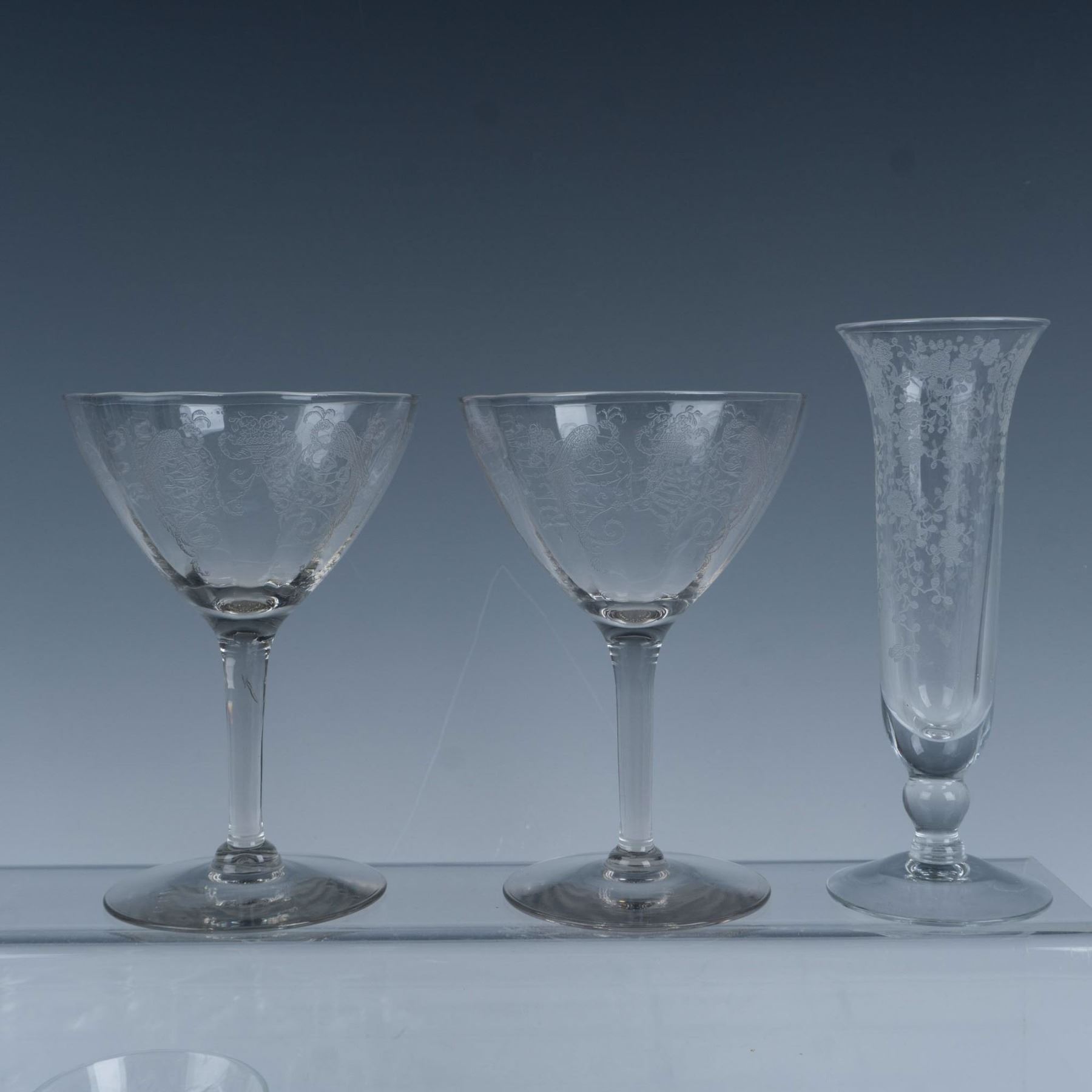 Elegant collection of etched glassware with scroll and floral designs that includes a wine glass, an iced tea glass, two sherbet glasses, six varying height cordial glasses, a bud vase, and a butter dish with a lid. Largest item measures 7.5"H x 3.75" dia.
