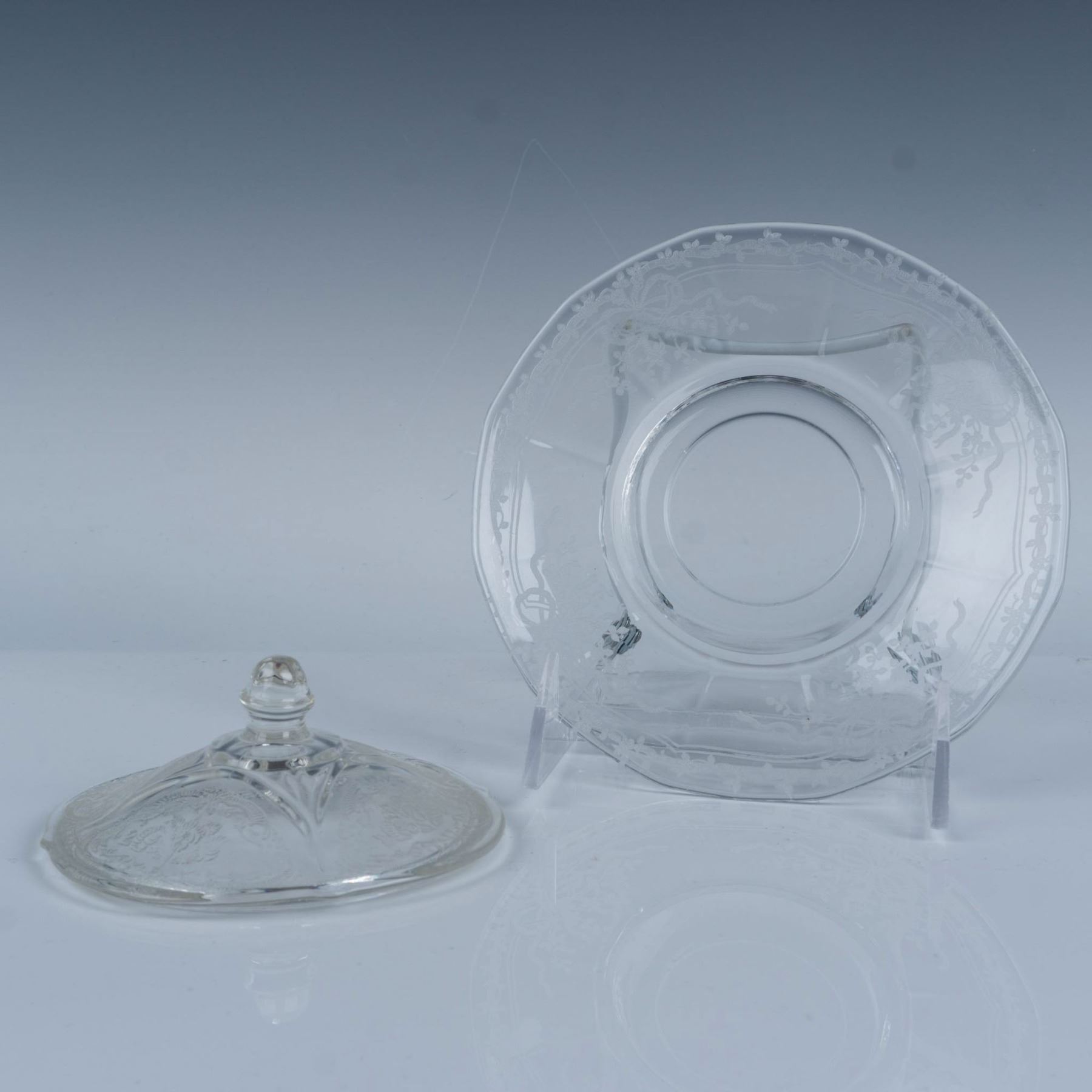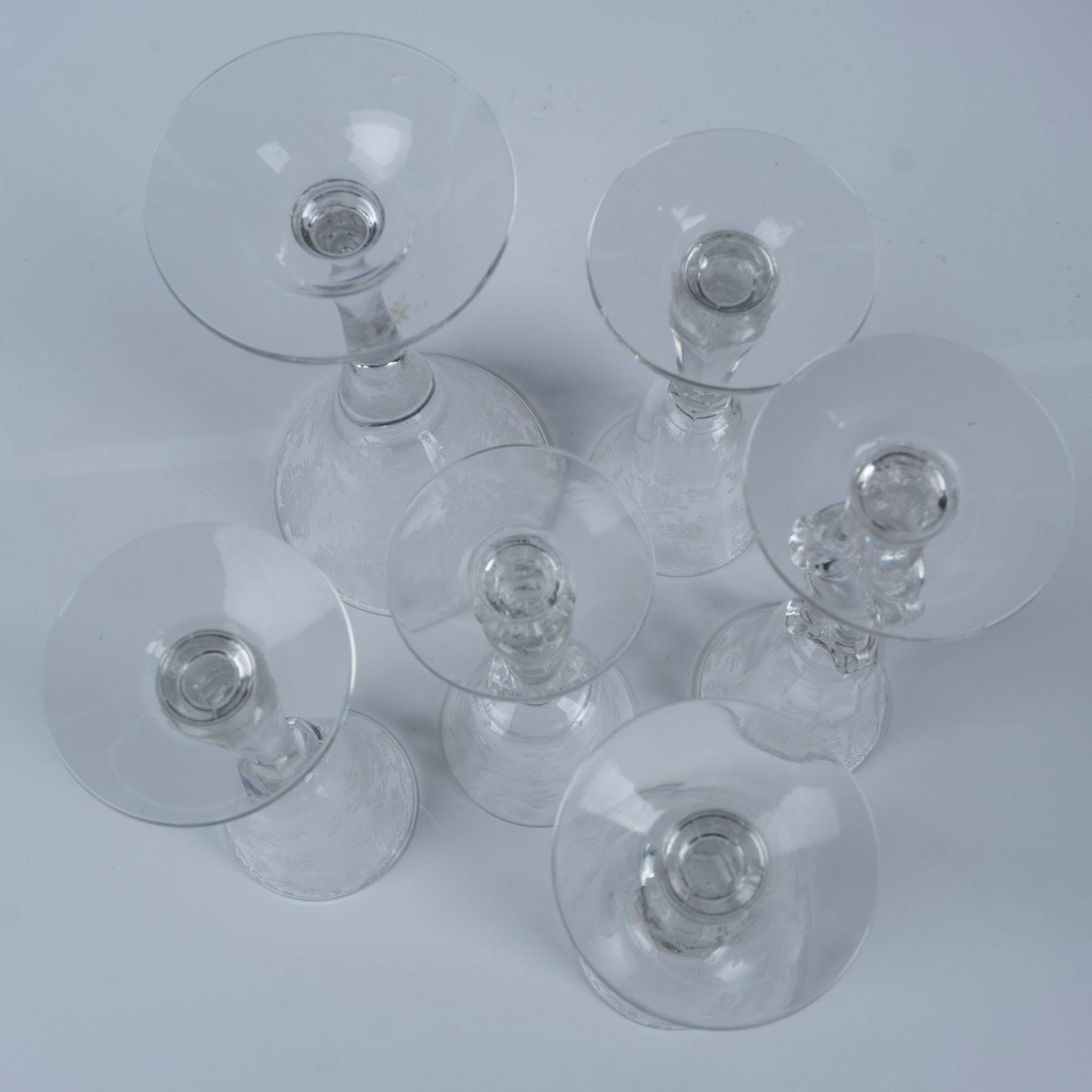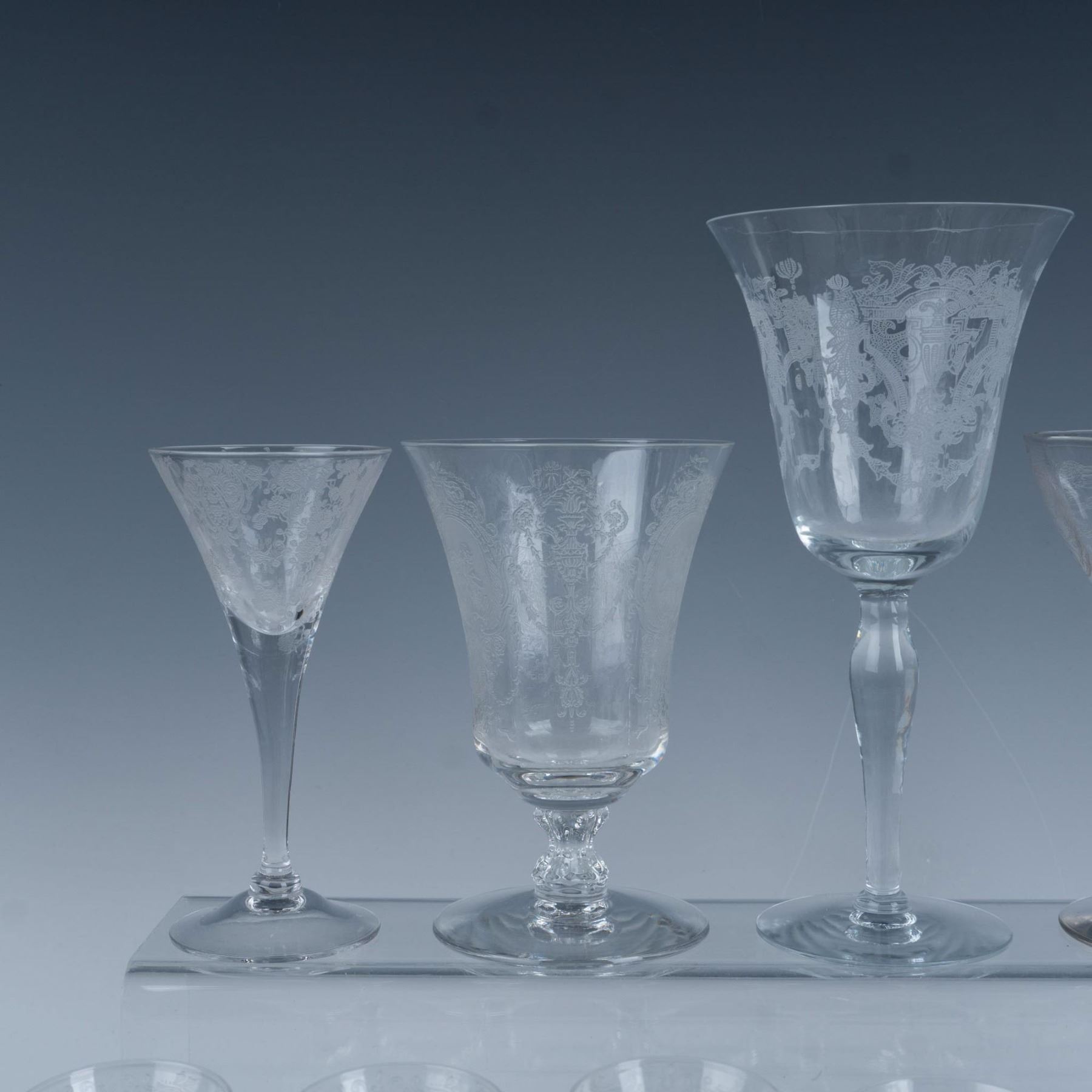 Elegant collection of etched glassware with scroll and floral designs that includes a wine glass, an iced tea glass, two sherbet glasses, six varying height cordial glasses, a bud vase, and a butter dish with a lid. Largest item measures 7.5"H x 3.75" dia.