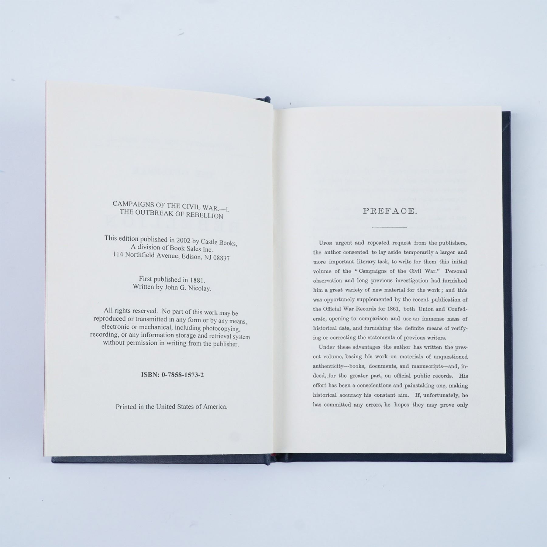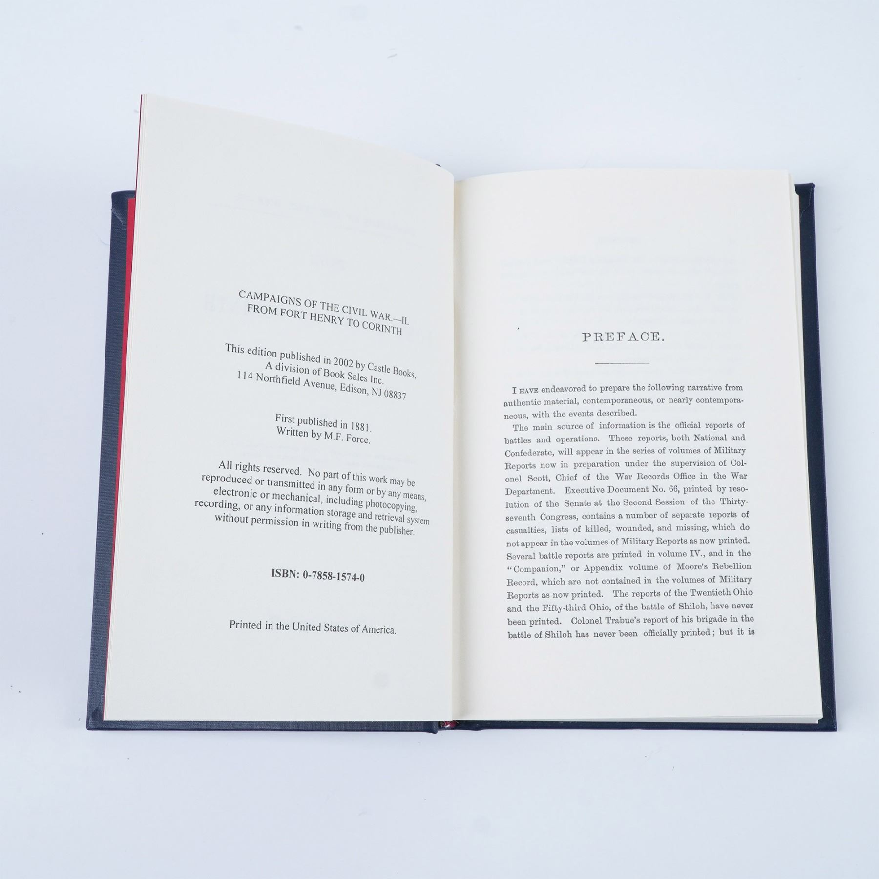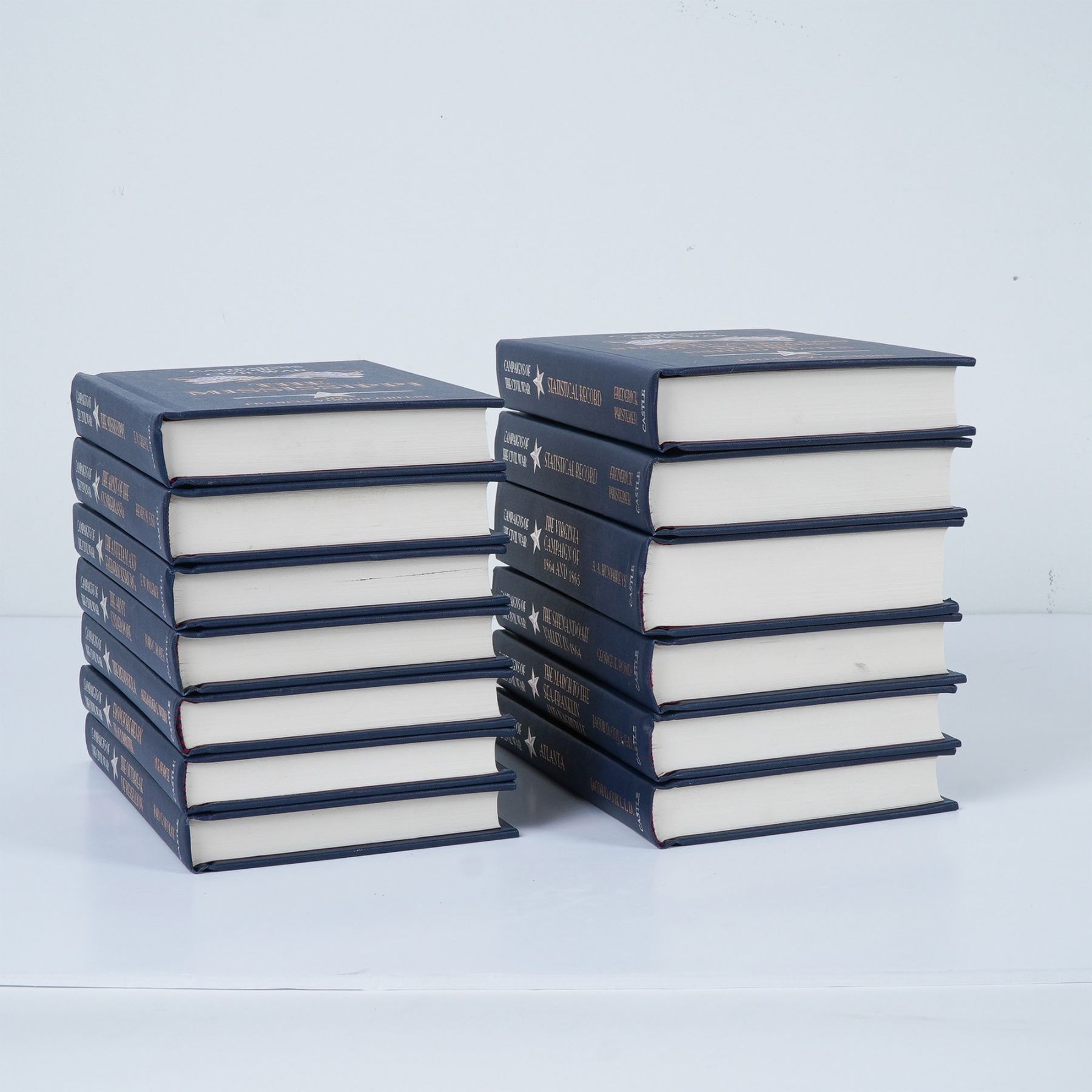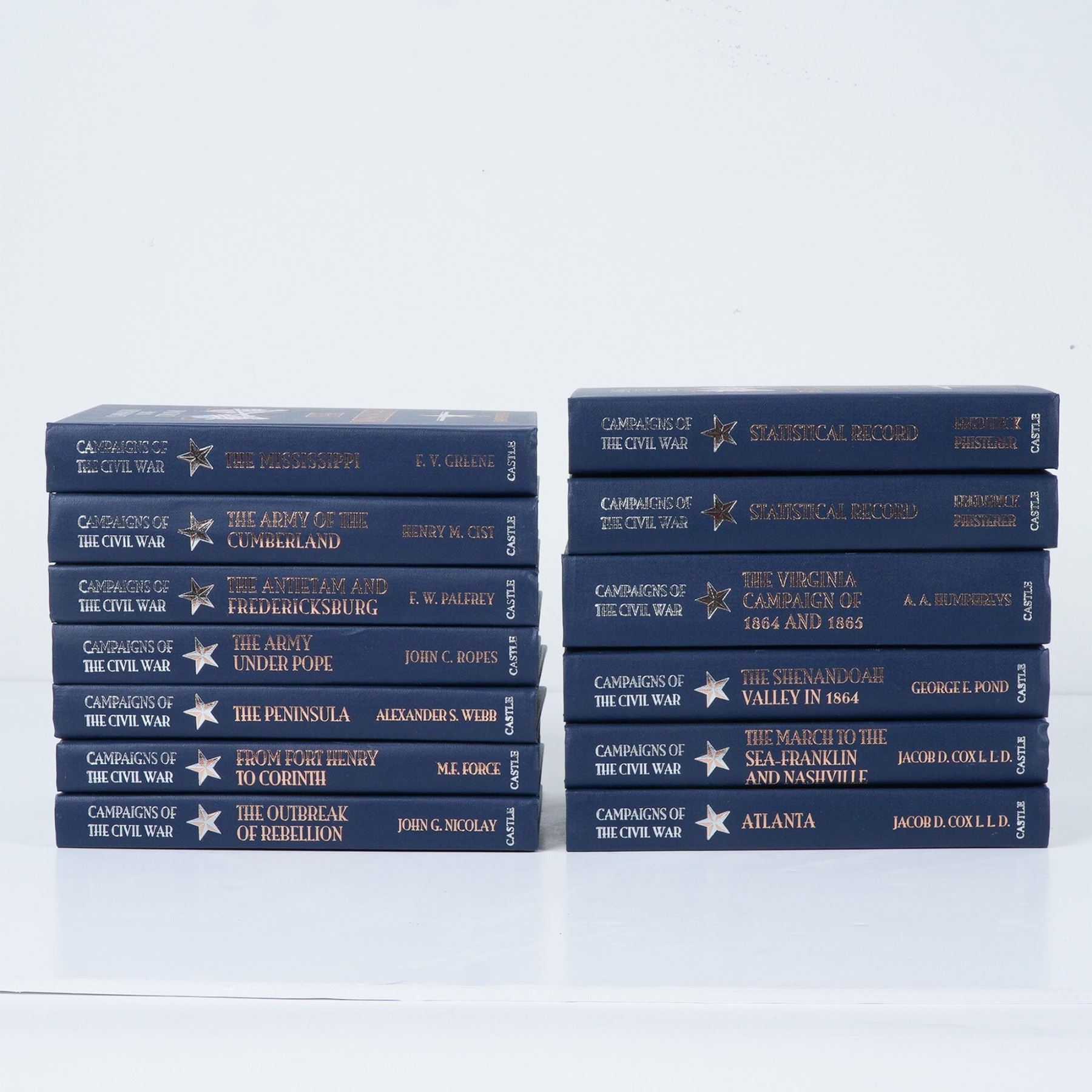 This 13 volume hardcover set from the Campaigns of the Civil War series, published by Castle Books in 2002, presents a detailed historical account of key military campaigns during the American Civil War. Included are books 1-5, 7-12, and two supplemental volumes, covering significant battles, strategies, and military leaders. The books feature navy blue cloth bindings with gold and silver embossed lettering and illustrations, reflecting a classic collector's edition. A valuable resource for historians, military enthusiasts, and Civil War collectors. Each book measures 5.25"L x 7.75"H.