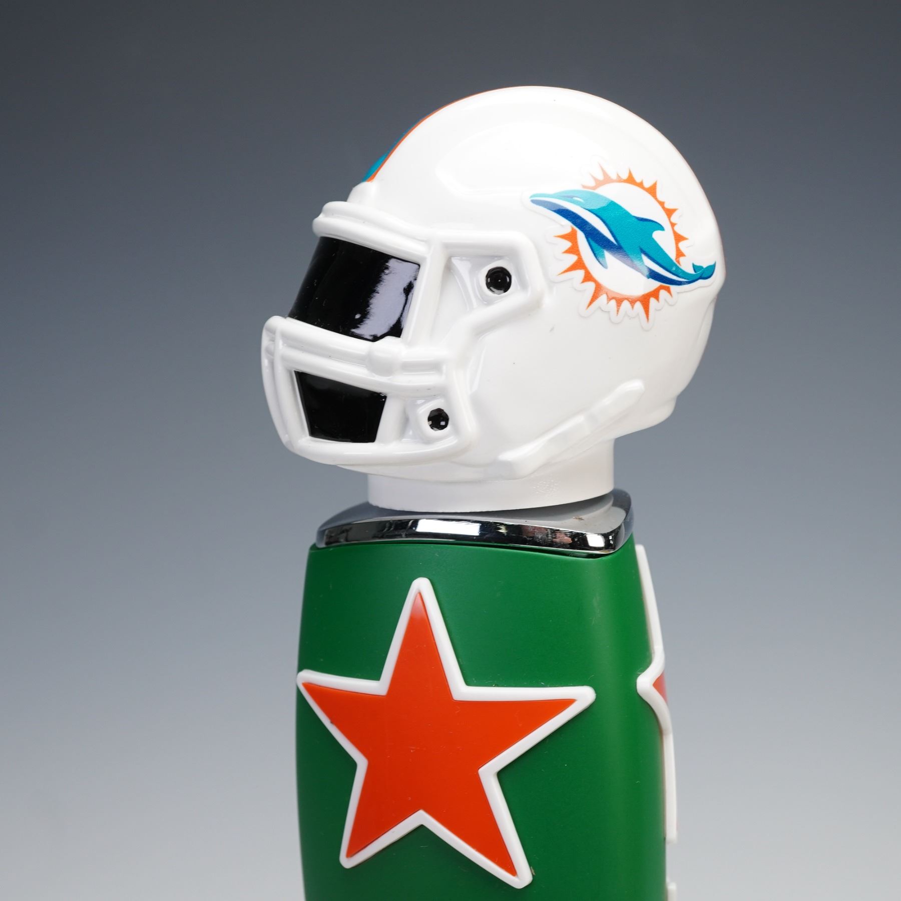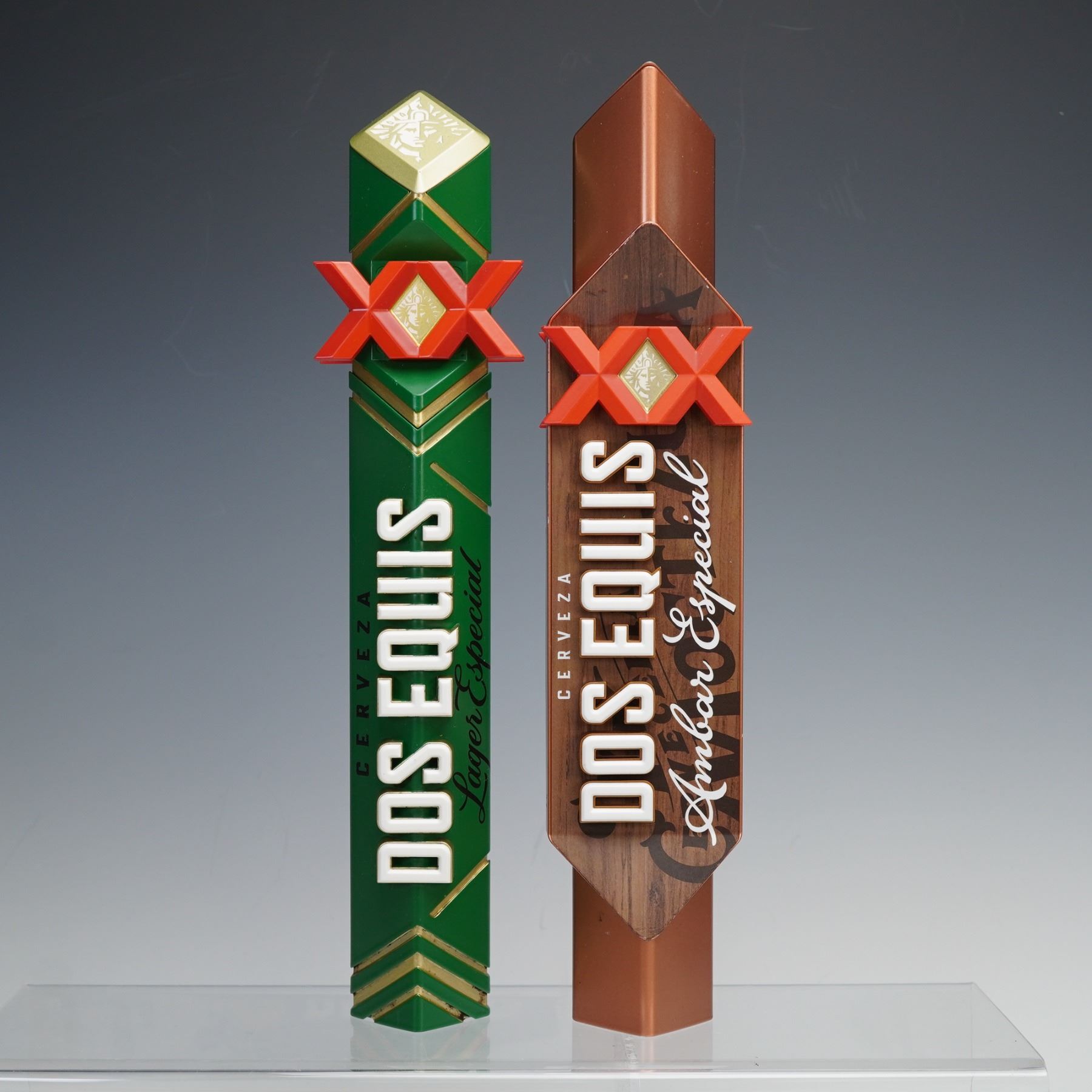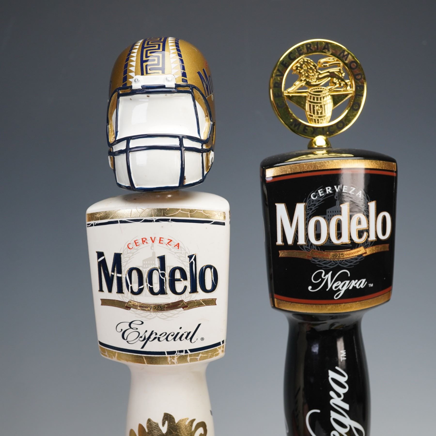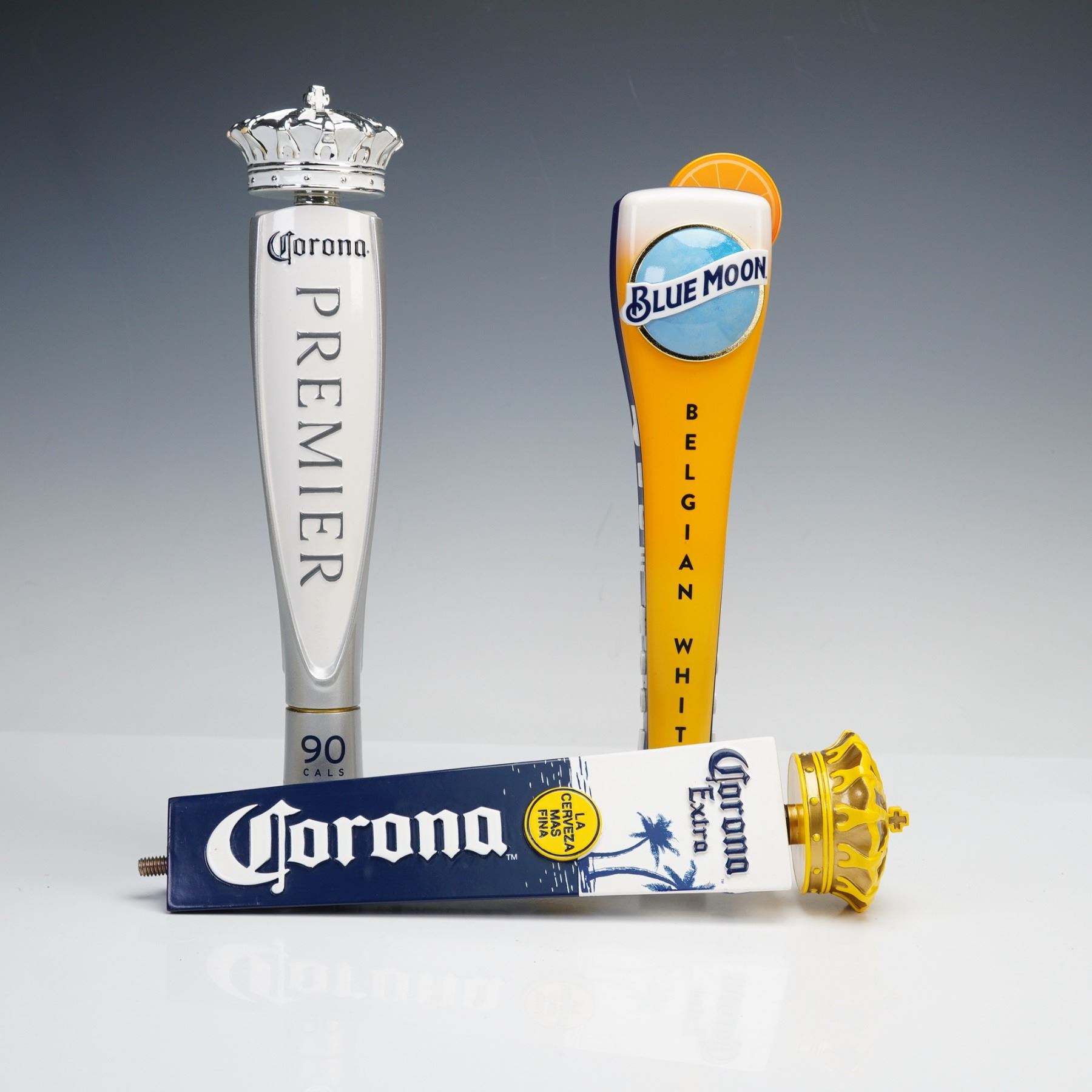 Branded beer tap handles representing a variety of domestic, imported, and specialty brews. Brands include Blue Moon Belgian White, Corona Extra, Corona Premier, Dos Equis Lager Especial, Dos Equis Ambar Especial, Stella Artois, Modelo Especial, Modelo Negra, Pabst Blue Ribbon, Pacifico, La Rubia and a Heineken NFL-themed tap handle featuring a football helmet. Each handle is constructed of painted resin or metal, showcasing distinctive logos, colors, and sculptural designs emblematic of their respective breweries. A striking and colorful collection ideal for home bars or brewery decor.