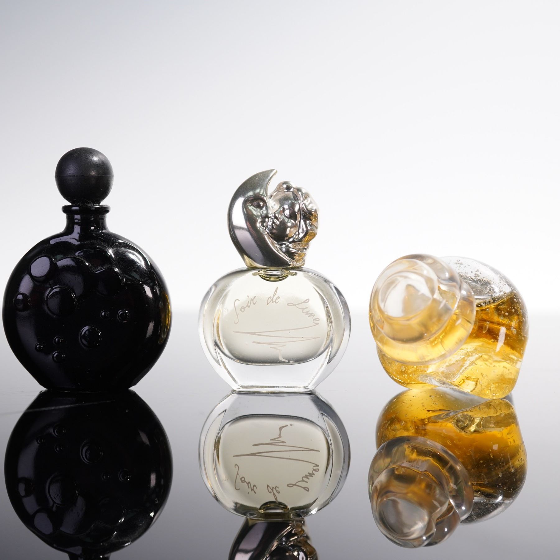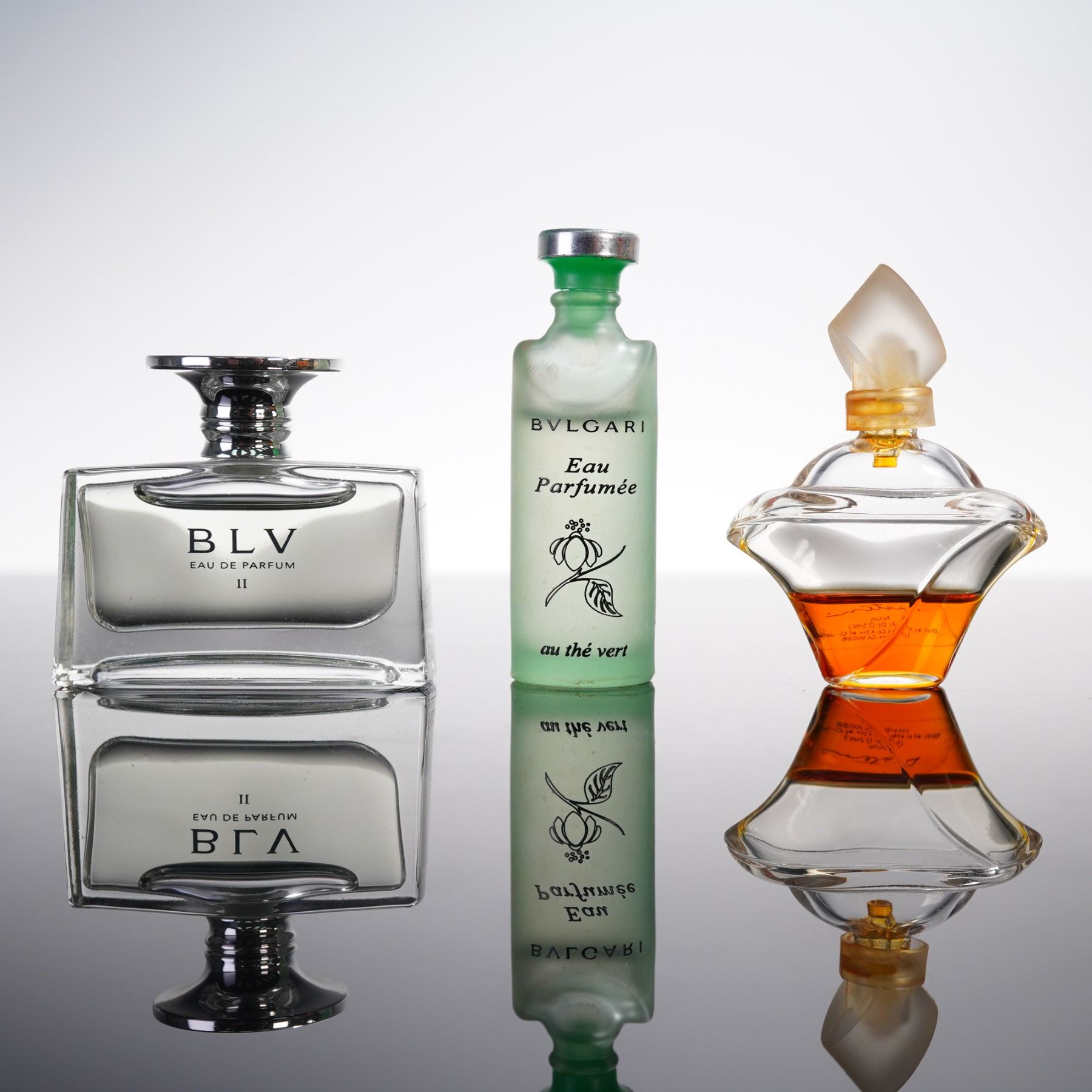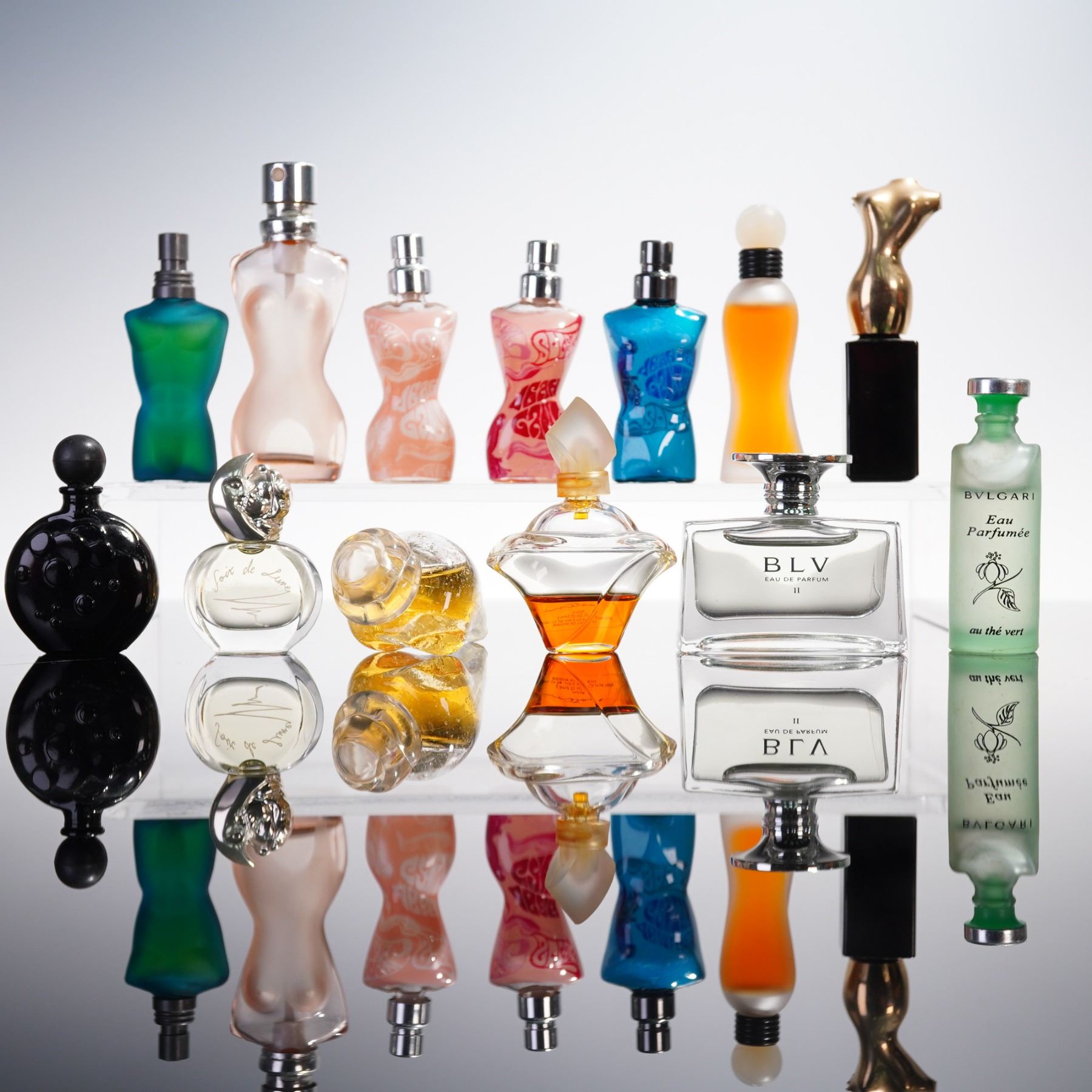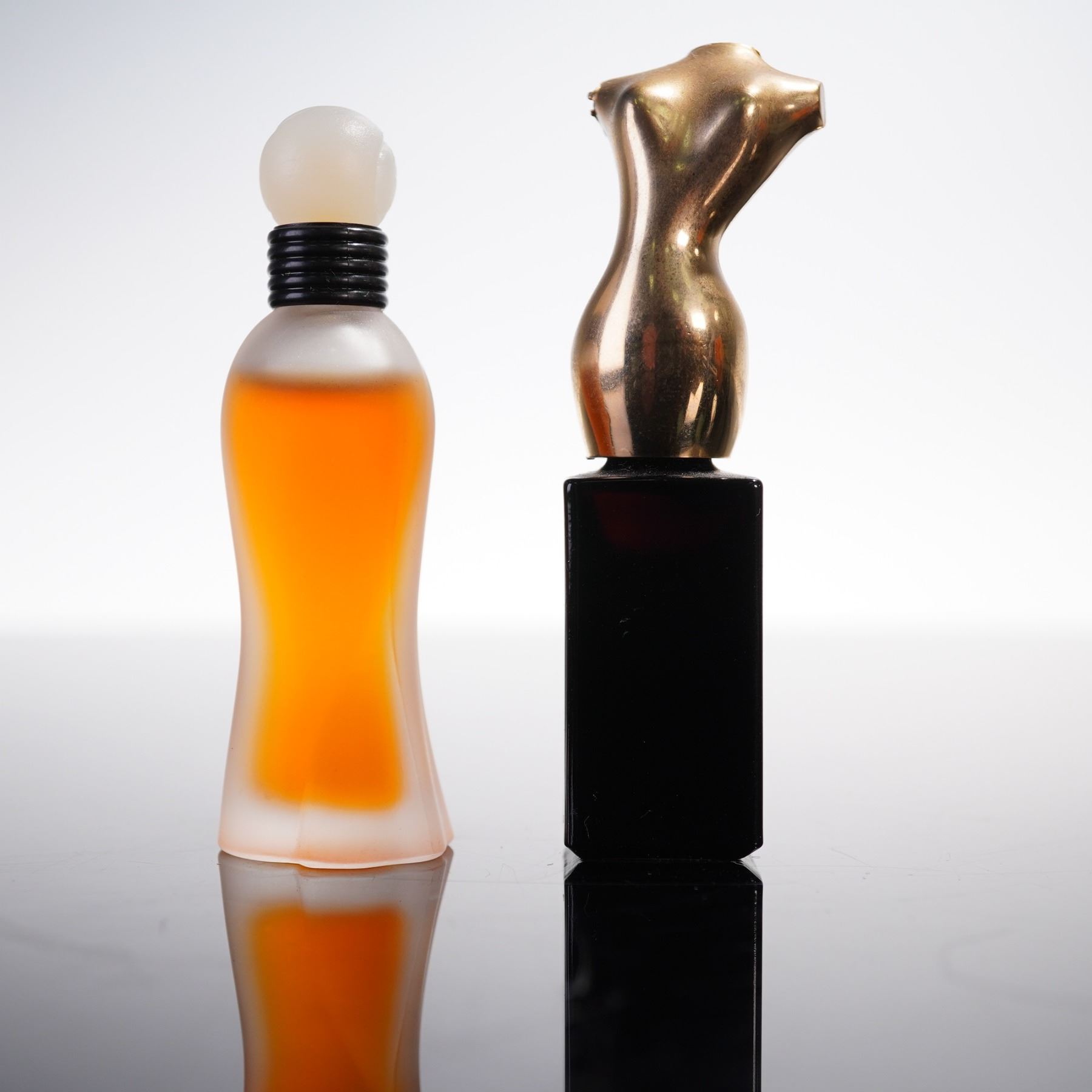 Assorted group of miniature perfume bottles in various shapes and colors. Highlights include sculptural forms with frosted and clear glass, metallic and opaque accents, and unique stoppers. Several bottles are shaped like the female figure with stylized torso silhouettes. Pink torso body is empty. Includes Bvlgari, Jean Paul Gaultier, Sisley, and more. Largest item measures: 1"L x 0.5"W x 3"H.