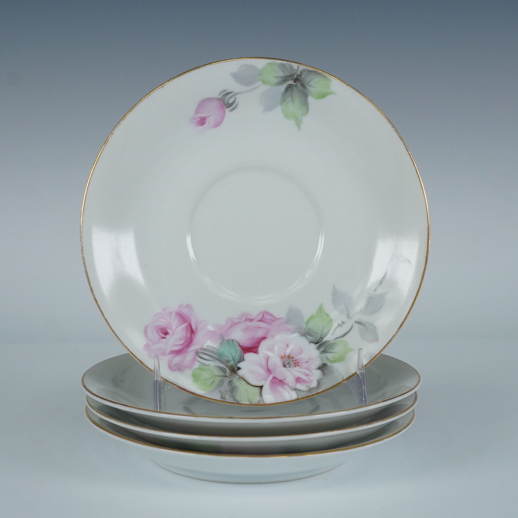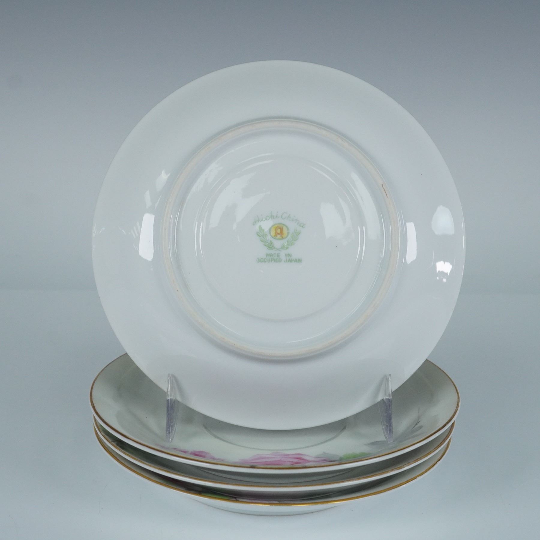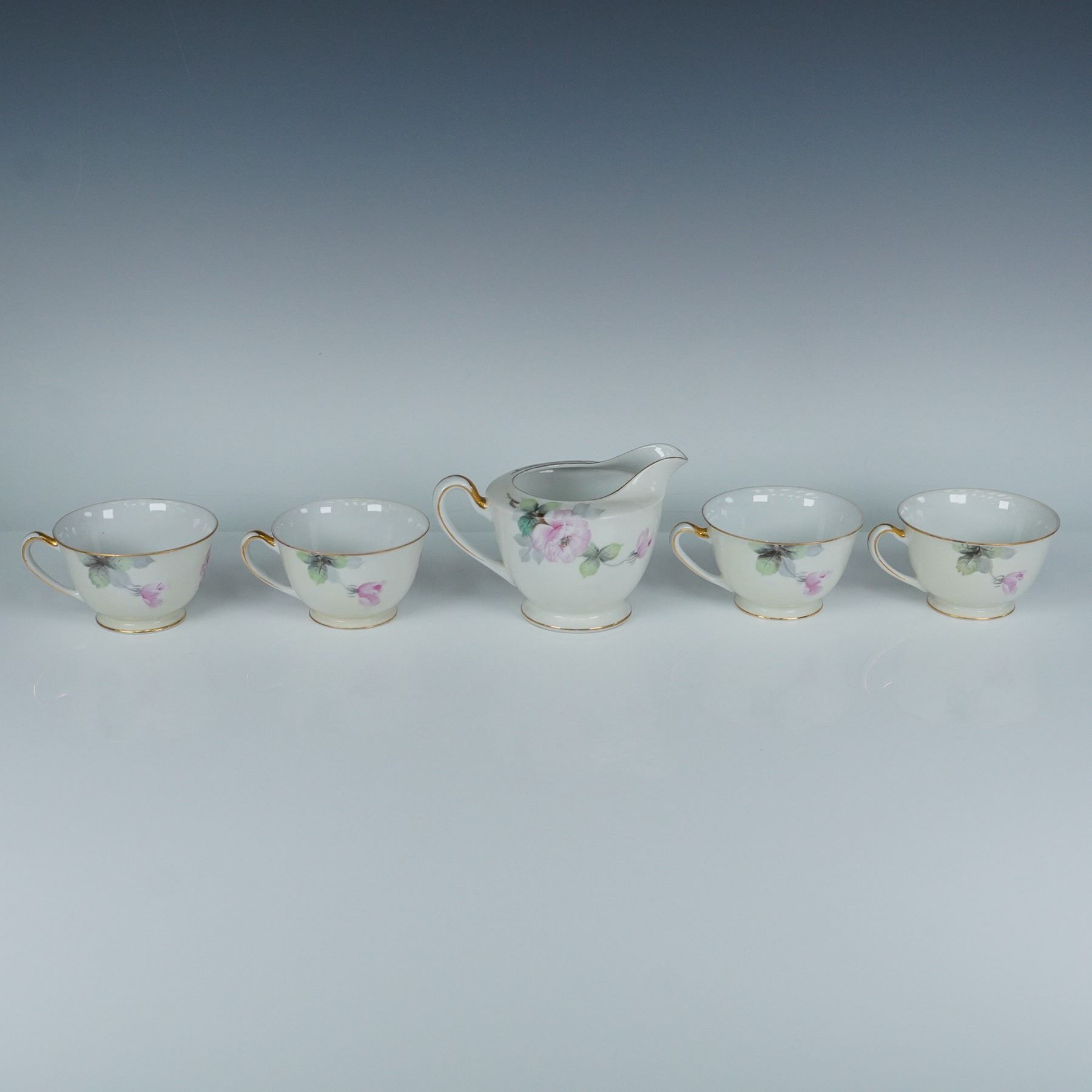 The set includes one creamer, four bread and butter plates, four saucers, and four teacups. Each piece is decorated with transfer-printed rose blossoms in shades of pink with green foliage, accented by delicate gilded edges. Undersides bear the Aichi China hallmark along with the Occupied Japan designation. Creamer: 5.75"L x 4"W x 3.75"H. Bread and butter plate: 7.75"W x 0.75"H. Saucer: 5.5"W x 0.75"H. Cup: 4.5"L x 3.5"W x 2.25"H.