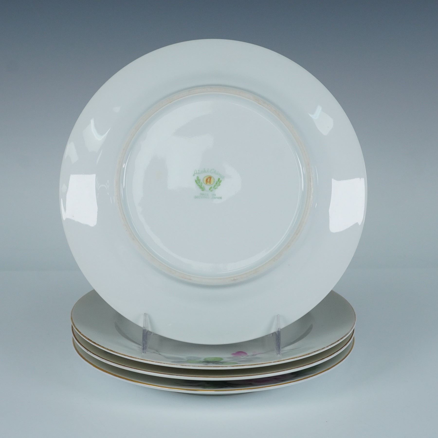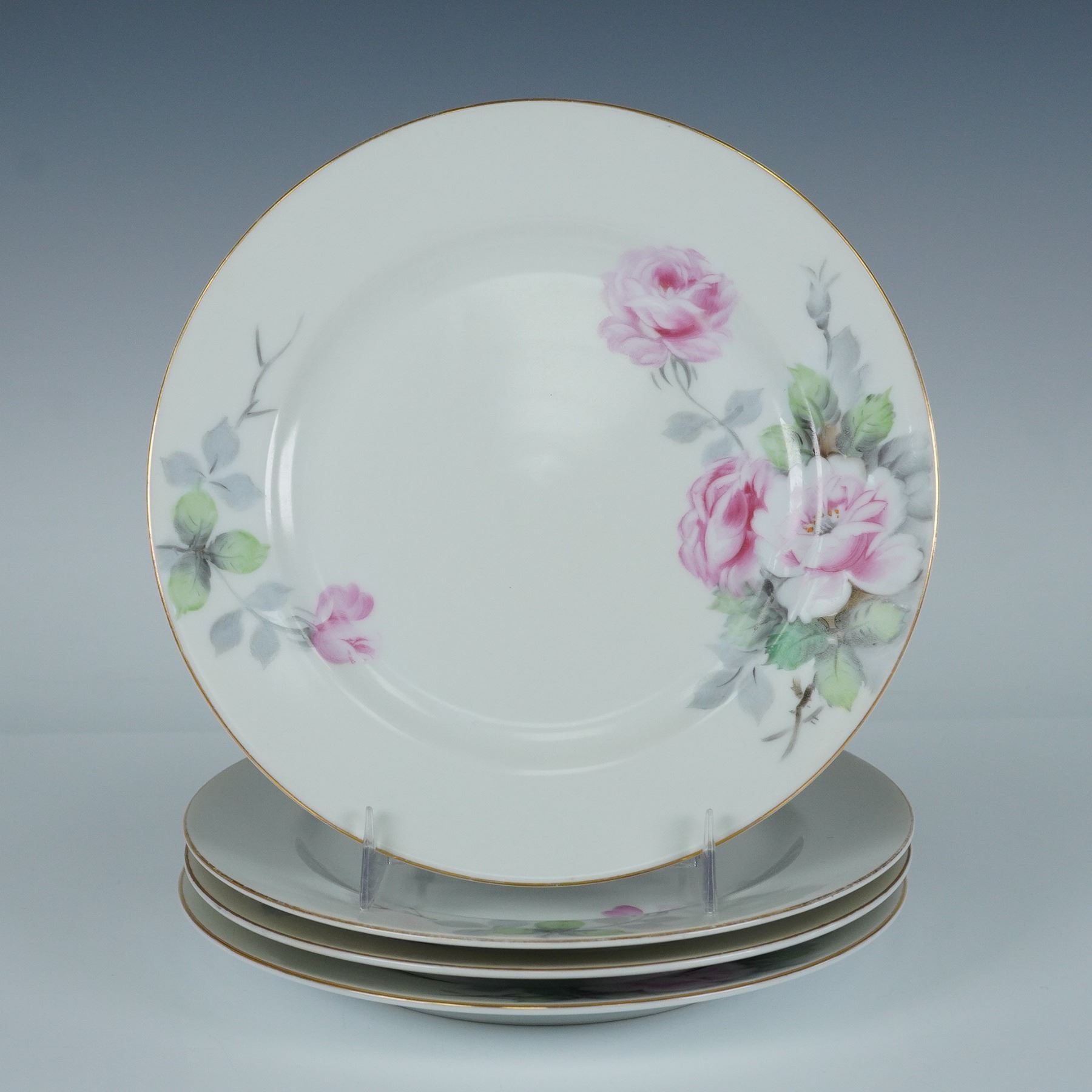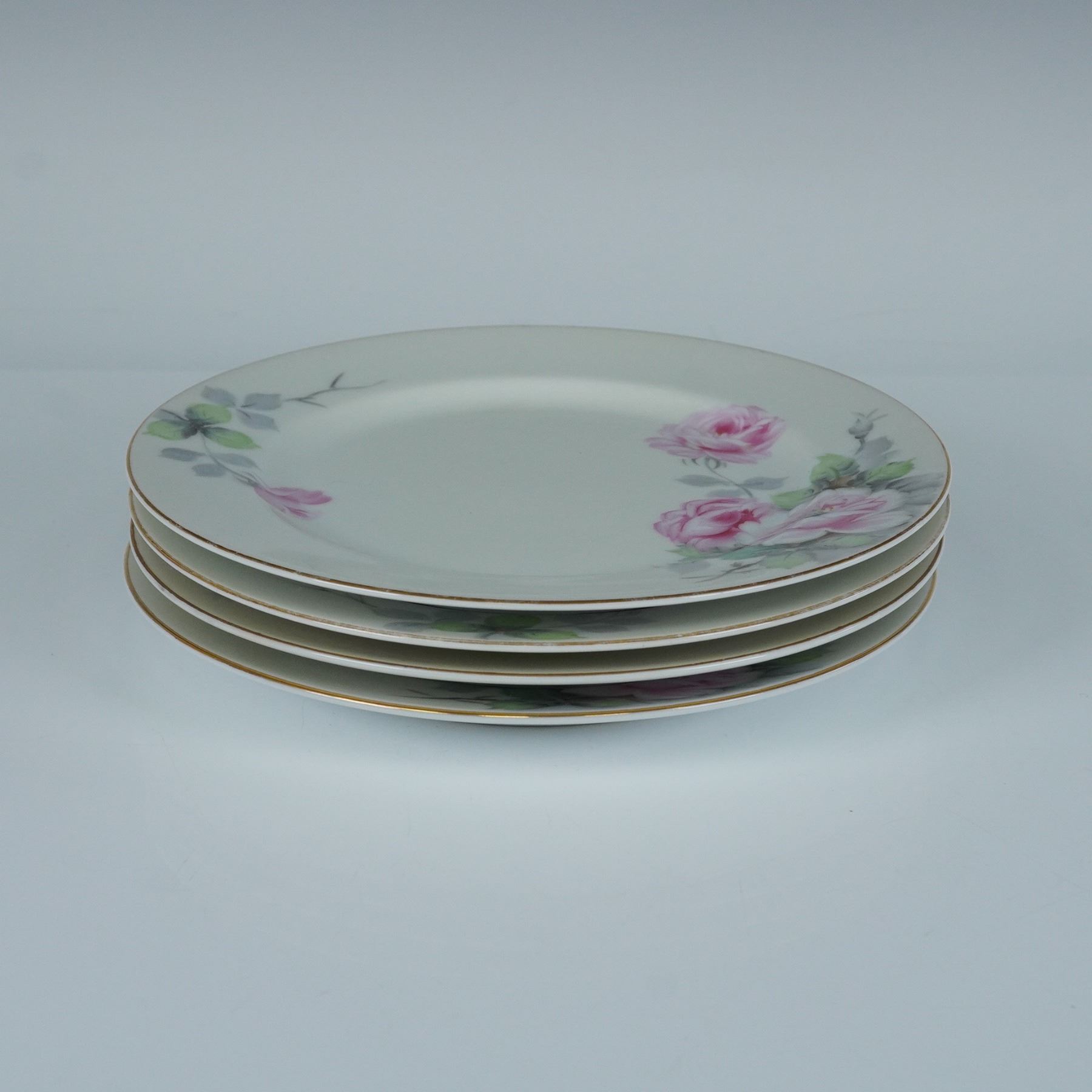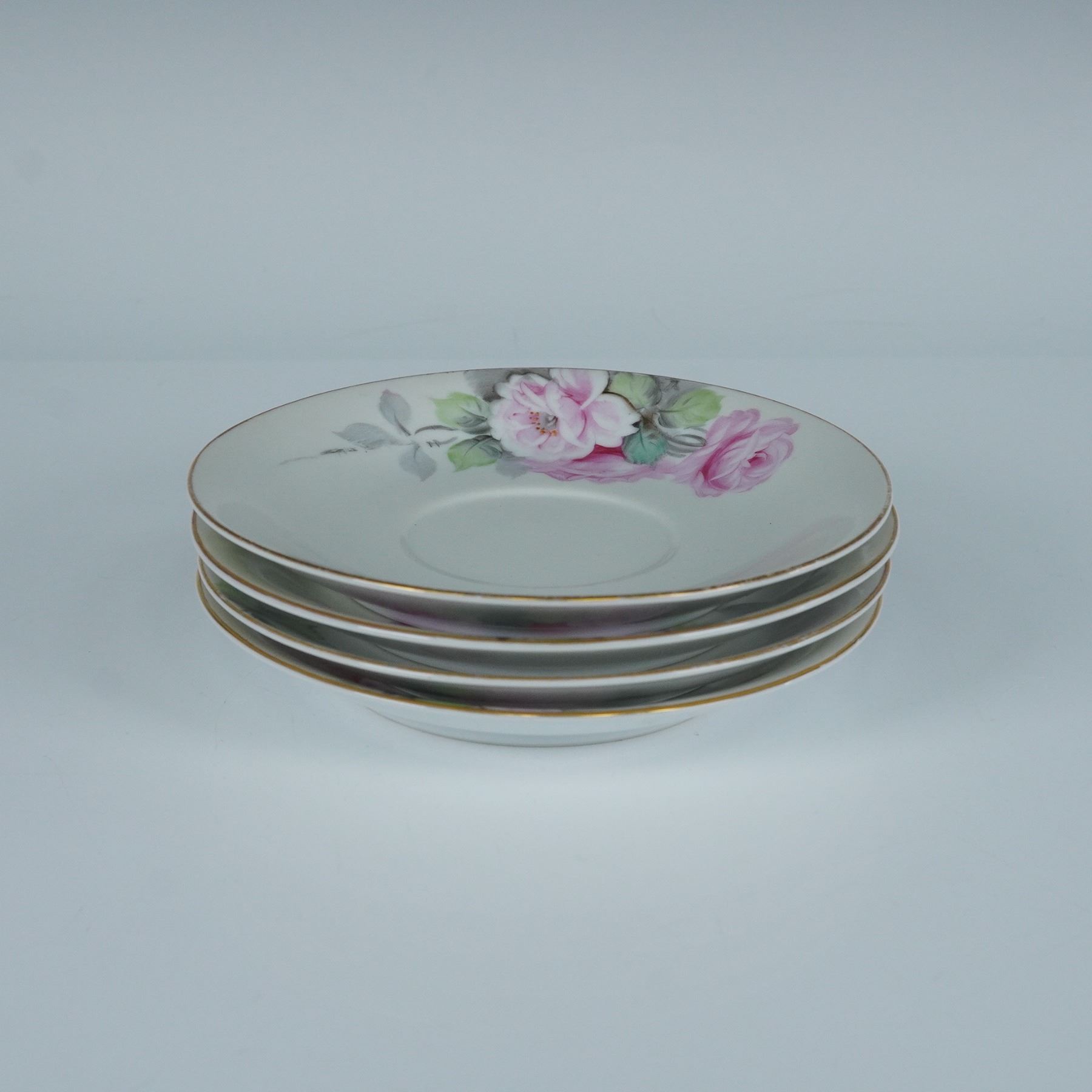 The set includes one creamer, four bread and butter plates, four saucers, and four teacups. Each piece is decorated with transfer-printed rose blossoms in shades of pink with green foliage, accented by delicate gilded edges. Undersides bear the Aichi China hallmark along with the Occupied Japan designation. Creamer: 5.75"L x 4"W x 3.75"H. Bread and butter plate: 7.75"W x 0.75"H. Saucer: 5.5"W x 0.75"H. Cup: 4.5"L x 3.5"W x 2.25"H.