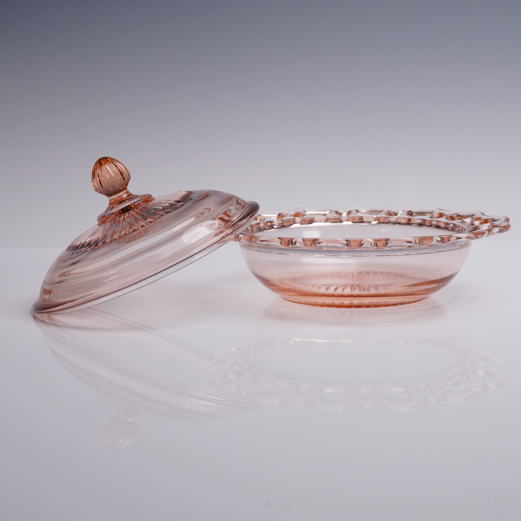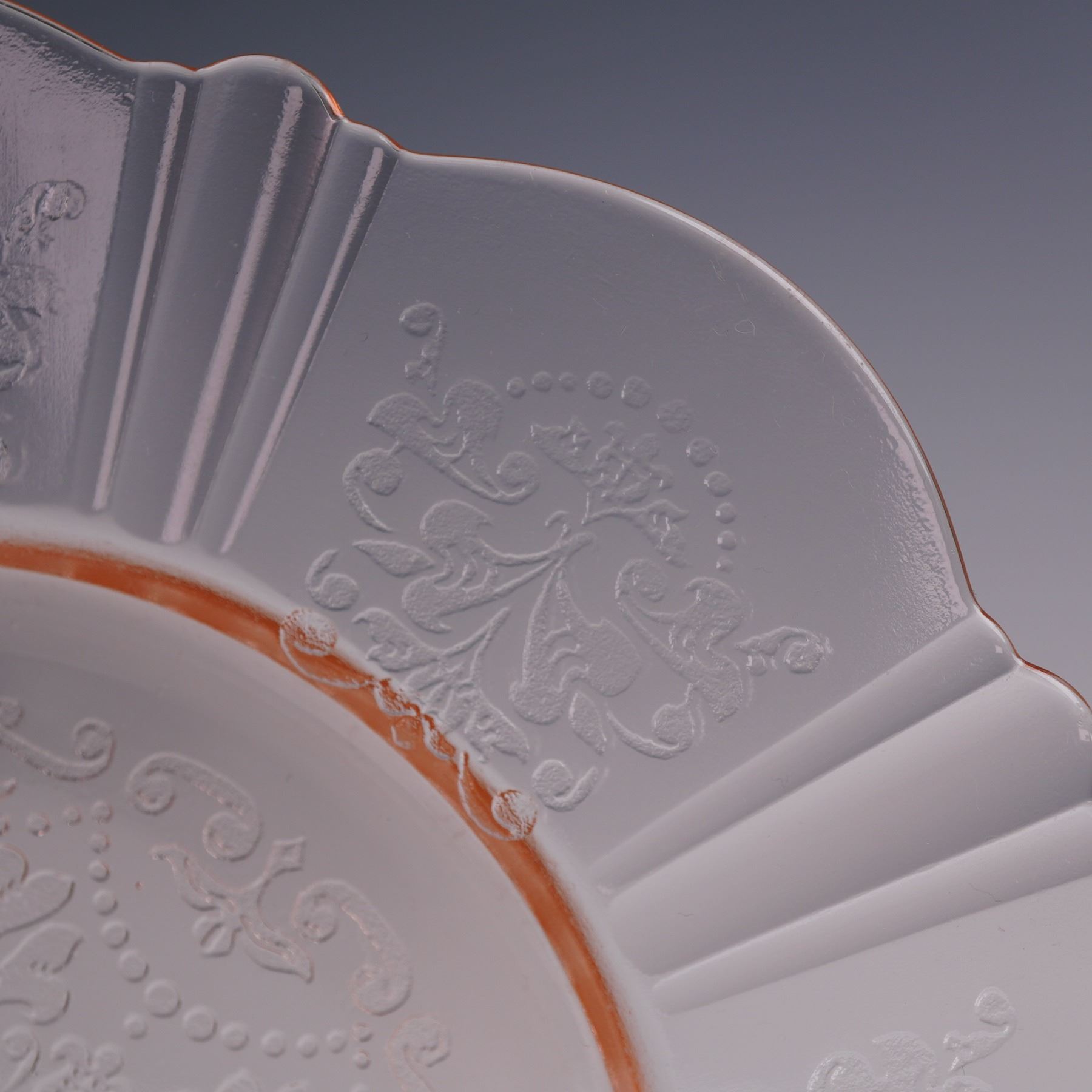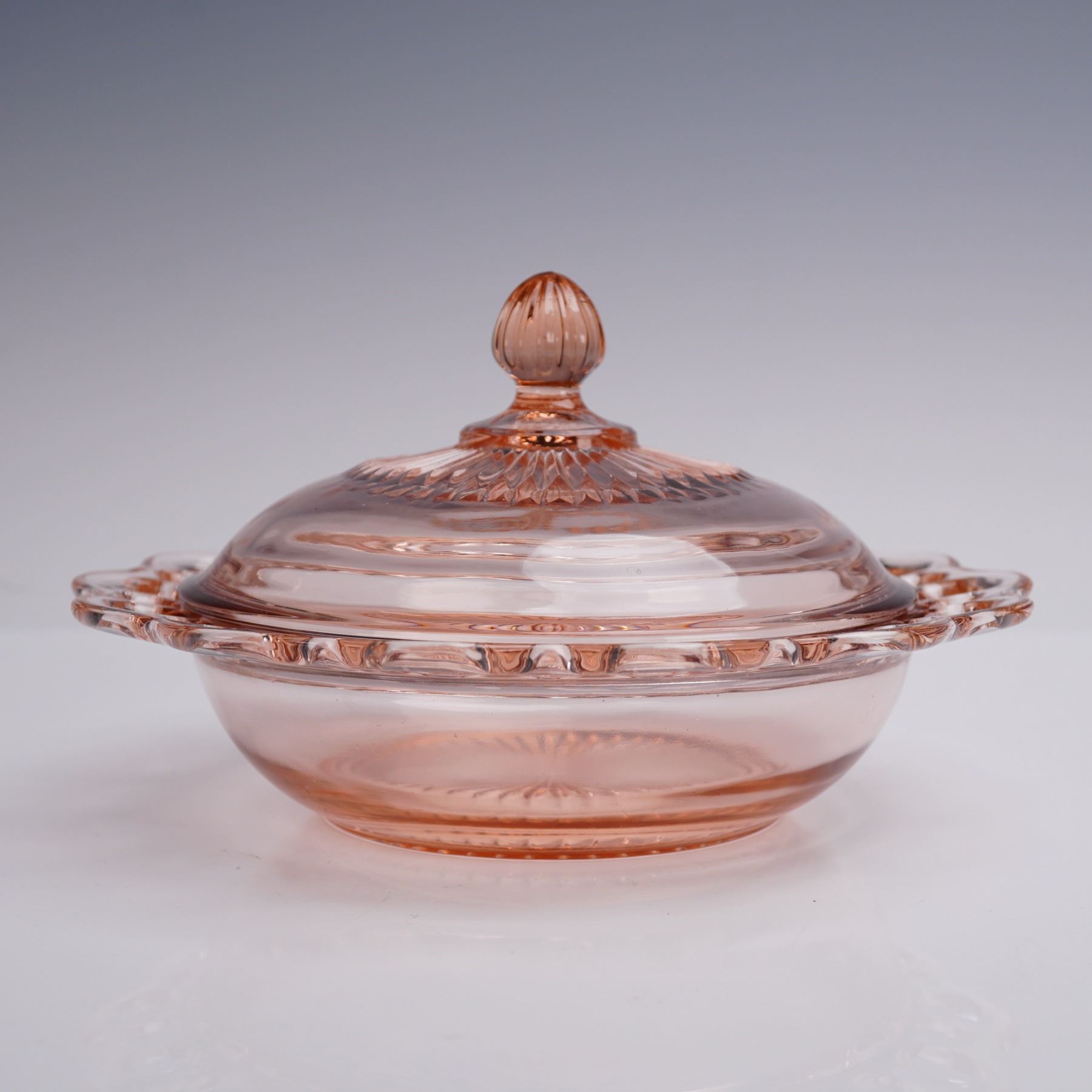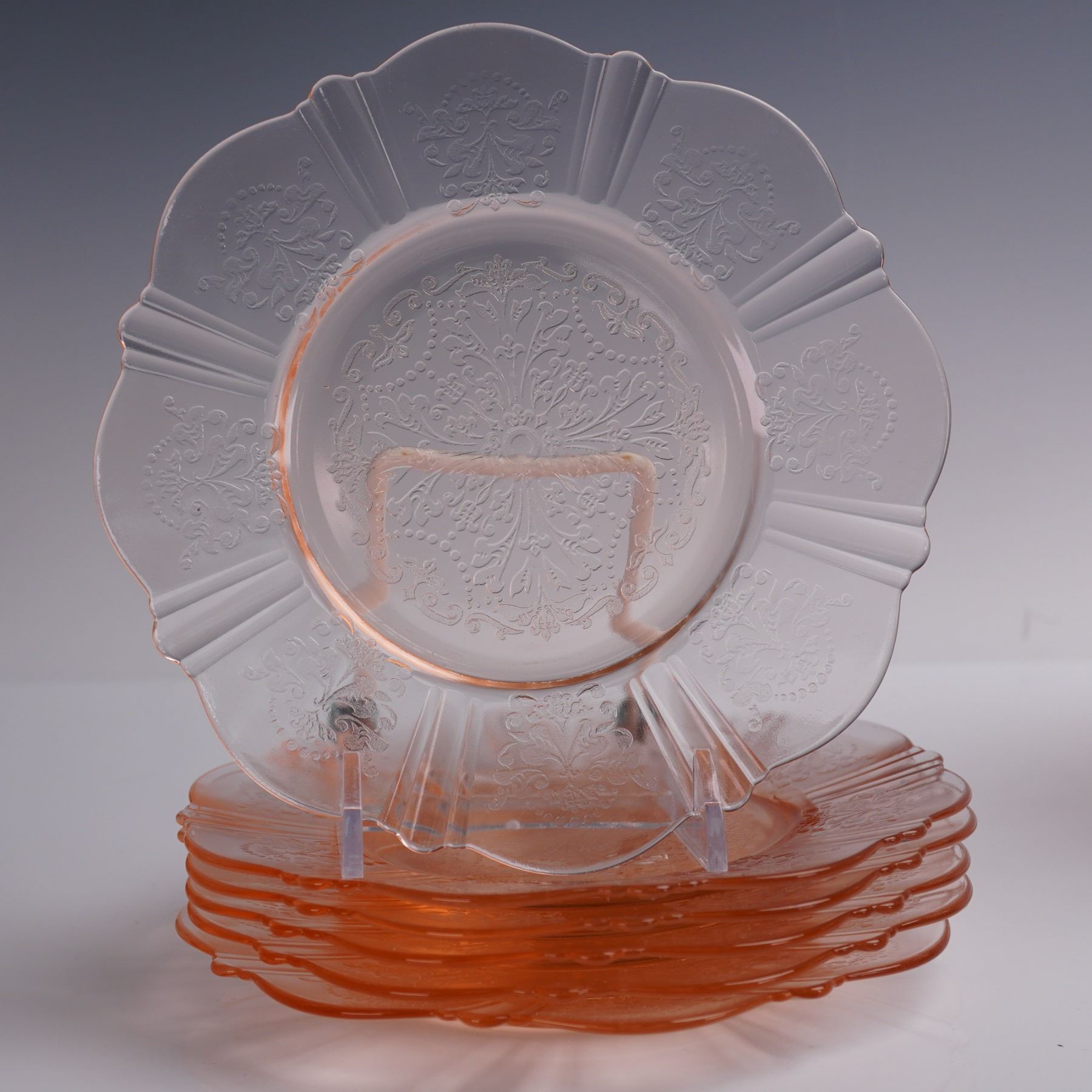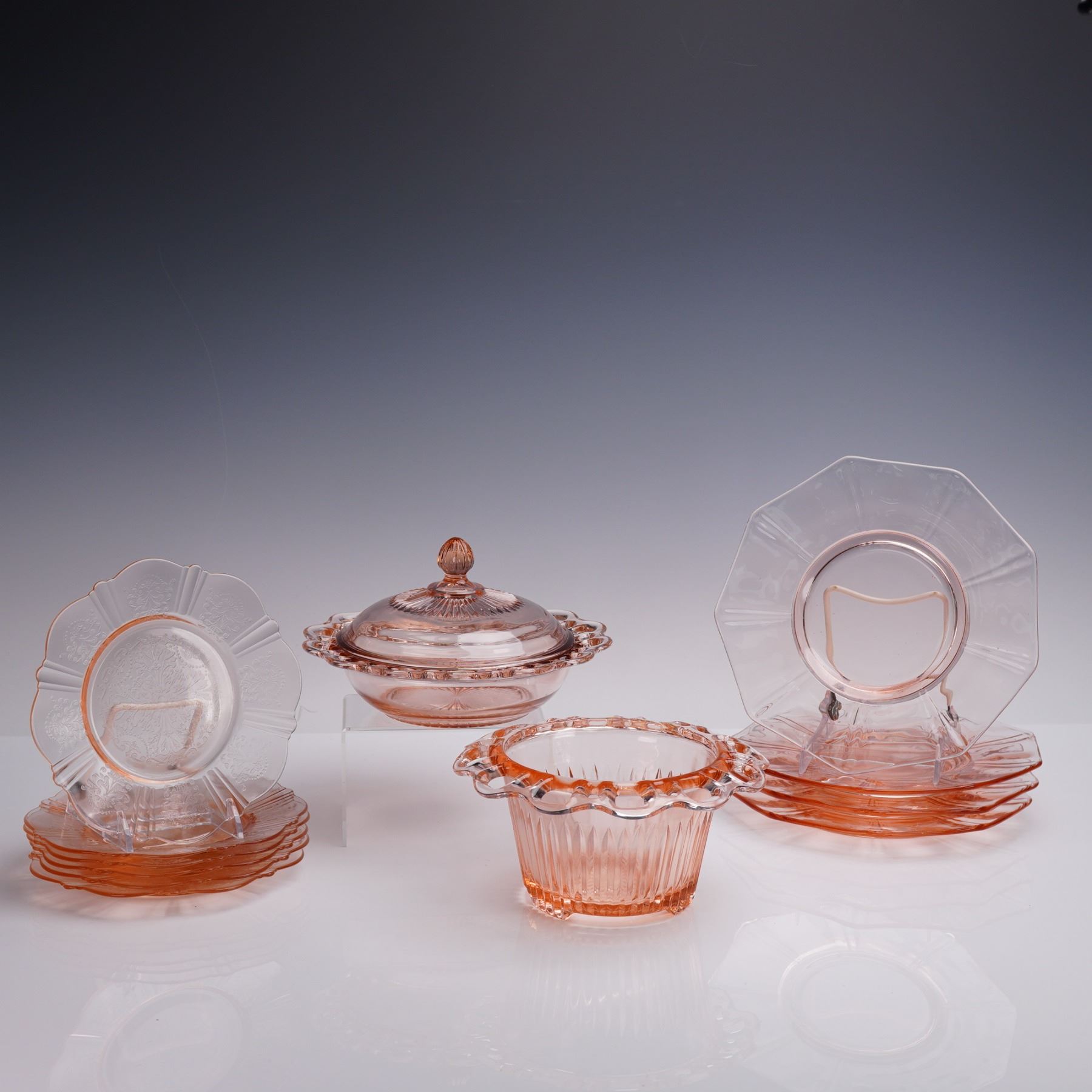 This beautiful 13-piece collection of vintage pink Depression glass showcases a charming variety of patterns and forms from the early-to-mid 20th century. The glassware features a soft pink hue typical of Depression-era production, with a blend of elegant motifs and functional shapes. These pieces are ideal for collectors or vintage tableware enthusiasts seeking to enhance their display with authentic period charm. Set includes 4 octagonal plates featuring a minimalist panel design and measuring 8"dia., 6 small plates with scroll and medallion pattern measuring 6.5"dia., an open footed bowl with looped rim measuring 3.5"H x 7"dia., and a lidded bowl with a matching looped rim measuring 4.25"H x 7.5"dia.