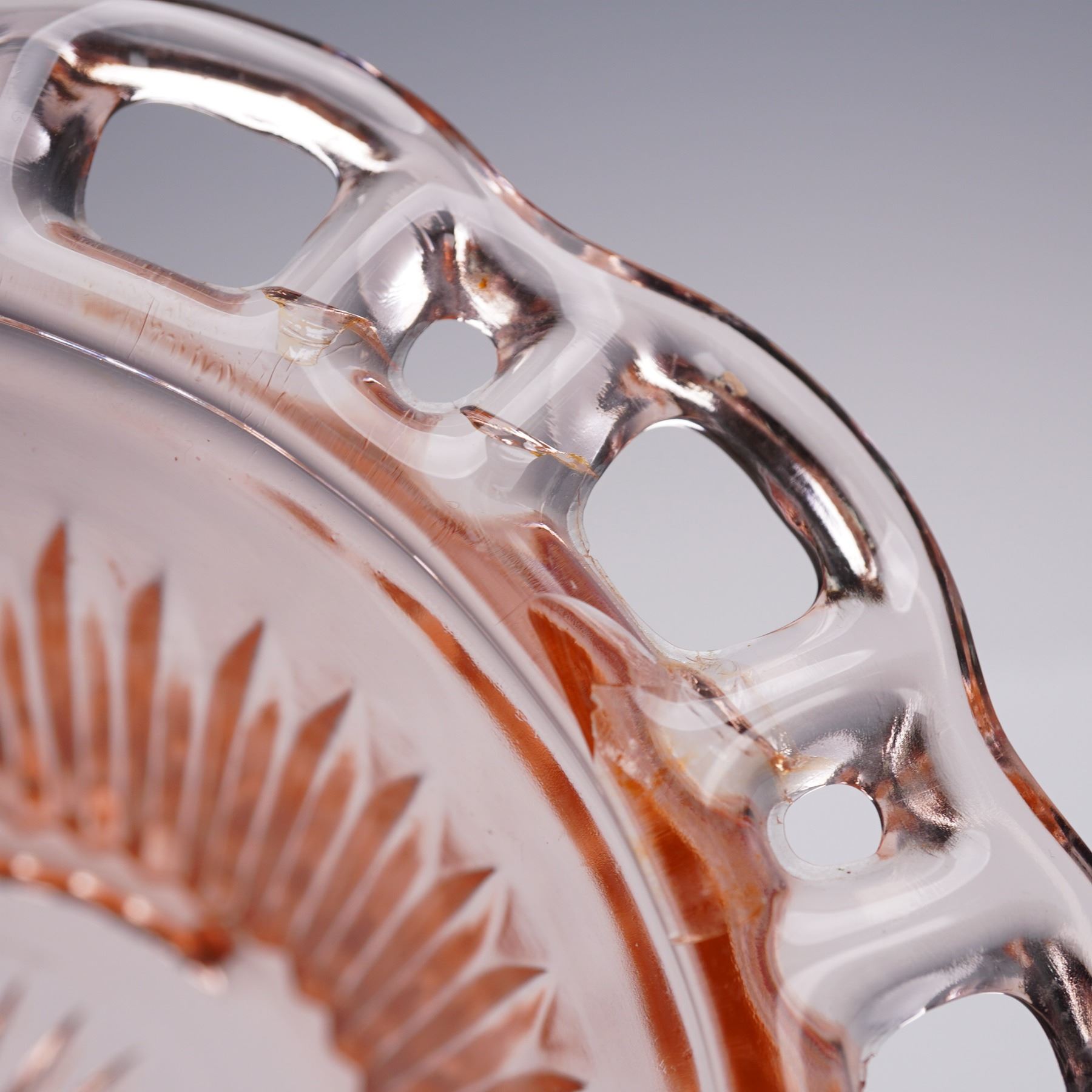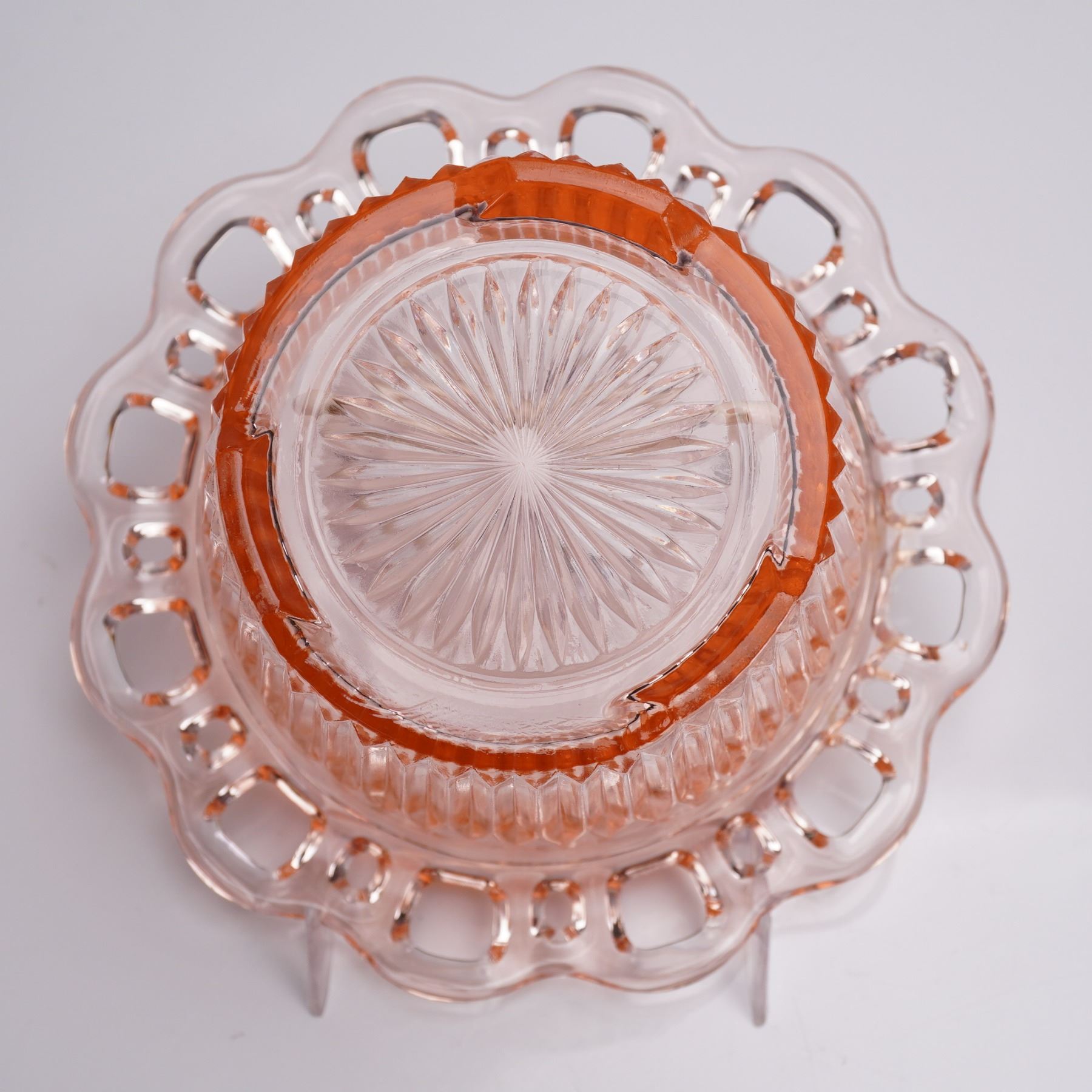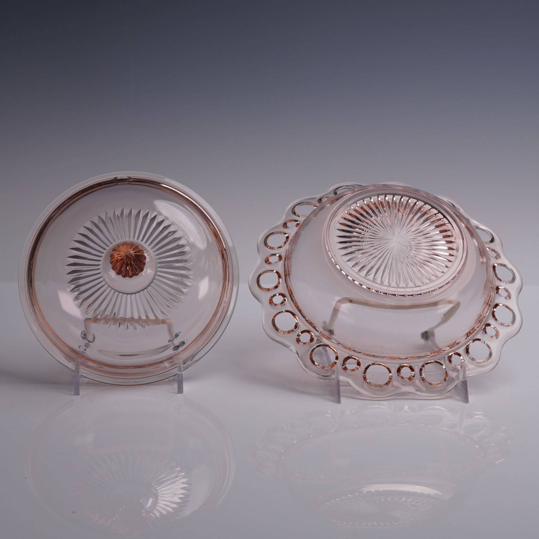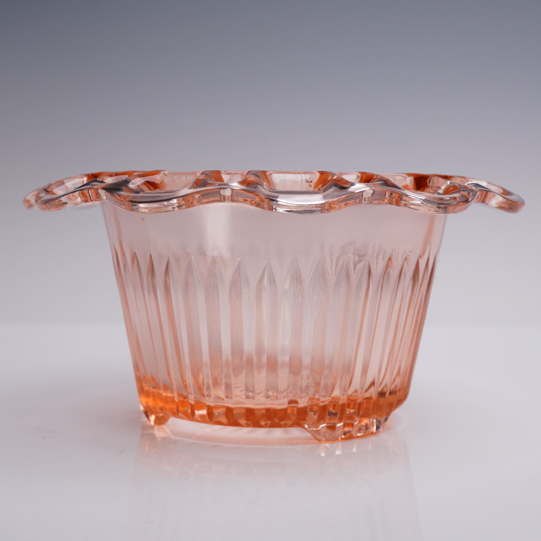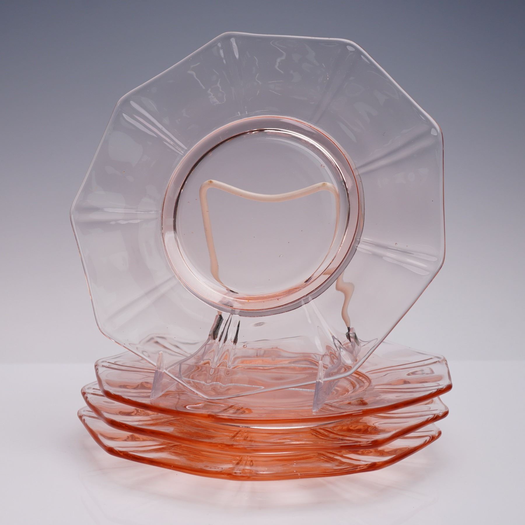 This beautiful 13-piece collection of vintage pink Depression glass showcases a charming variety of patterns and forms from the early-to-mid 20th century. The glassware features a soft pink hue typical of Depression-era production, with a blend of elegant motifs and functional shapes. These pieces are ideal for collectors or vintage tableware enthusiasts seeking to enhance their display with authentic period charm. Set includes 4 octagonal plates featuring a minimalist panel design and measuring 8"dia., 6 small plates with scroll and medallion pattern measuring 6.5"dia., an open footed bowl with looped rim measuring 3.5"H x 7"dia., and a lidded bowl with a matching looped rim measuring 4.25"H x 7.5"dia.