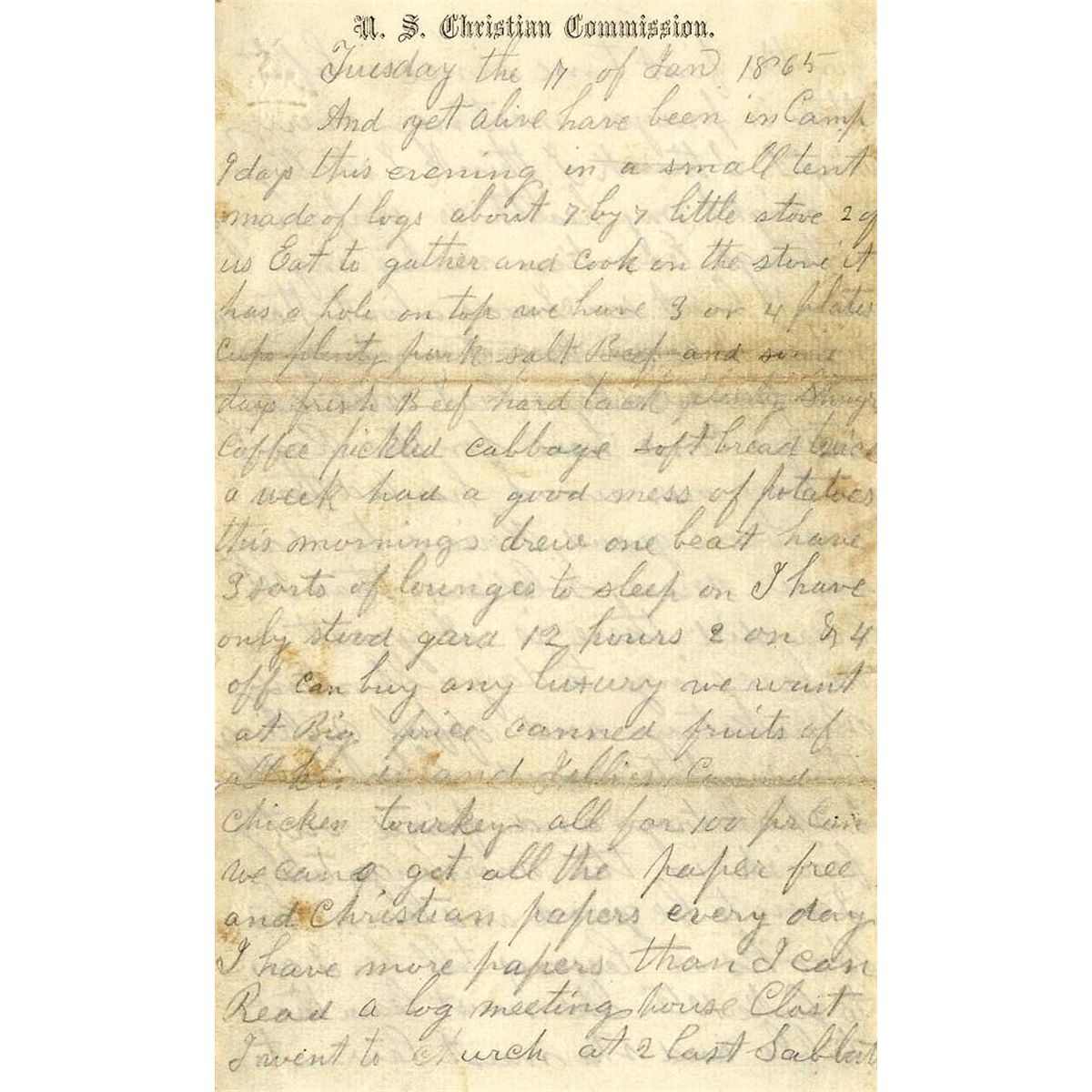 4pp. letter from John W. Shepard of the 13th Indiana Infantry, Company E. Dated 17 January 1865, letter reads in part: ''…yet alive. have been in Camp 9 days this evening in a small tent made of logs…2 of us Eat together and cook in the stove…We have 3 or 4 plates, cups plenty, pork, salt Beef, and some days fresh Beef…We can get…Christian papers every day. I have more papers than I can read…I went to Church…last Sabbath for the first time since I left. There is prayer meeting every night. I think I shall go tonight. My health is improving although exertion makes my heart beat so. I was about Starved when I came here…There has been a grand Review today. Saw more Soldiers than I ever did. There is a great rejoicing today. Shooting musketry, and offal Yelling…over the capture of ft. fisher in N.C. that our Boys failed to take the first trip they made…'' Shepard mustered into Company E on 12 November 1864 and was mustered out on 5 September 1865 at Goldsboro, North Carolina. During his service, the regiment saw duty in the Shenandoah Valley and at Fort Marshall in Baltimore, Maryland. Pencil letter measures approximately 4.5'' x 7.75''. Overall toning and soiling; some separation at folds, otherwise very good condition.