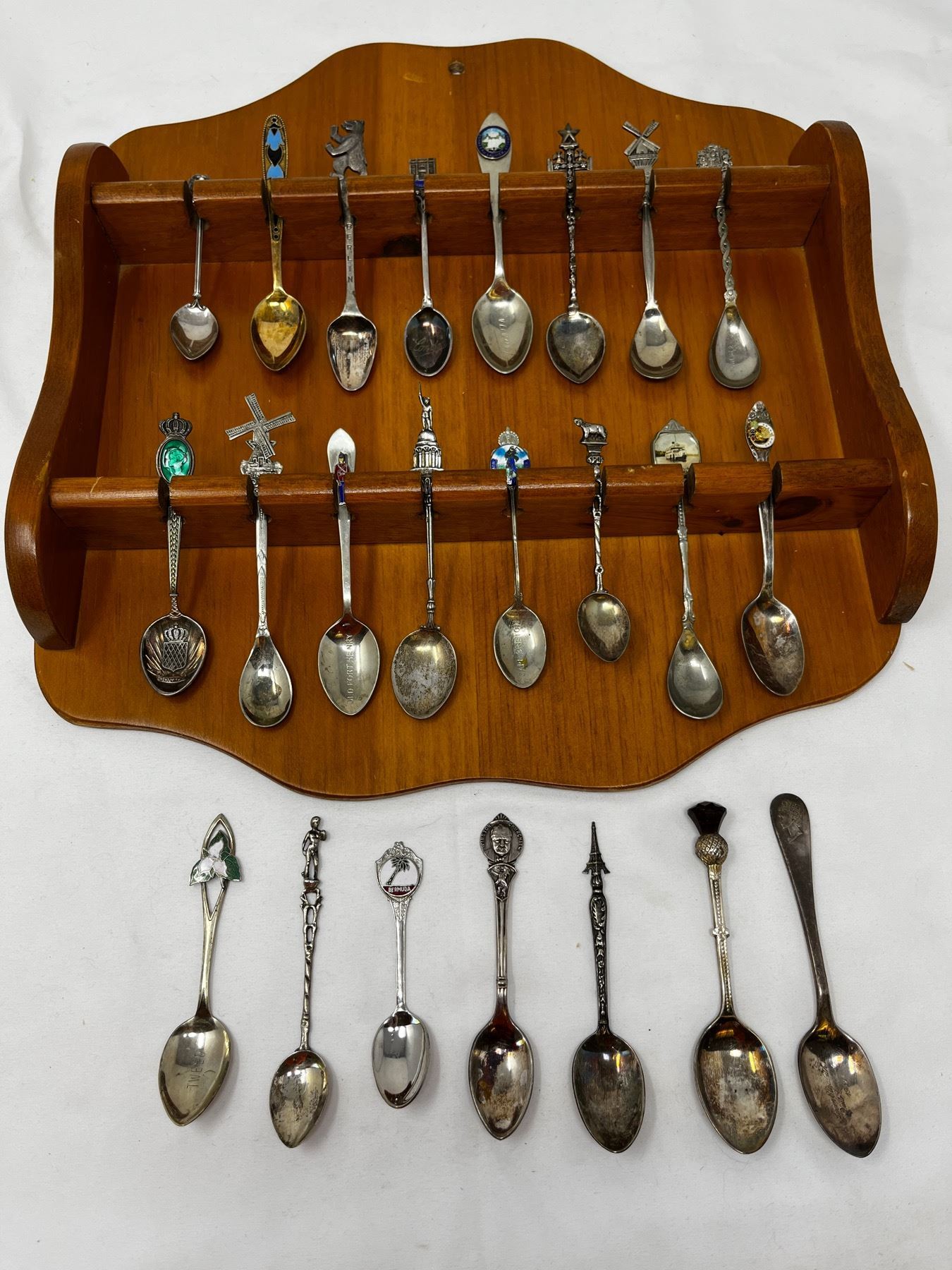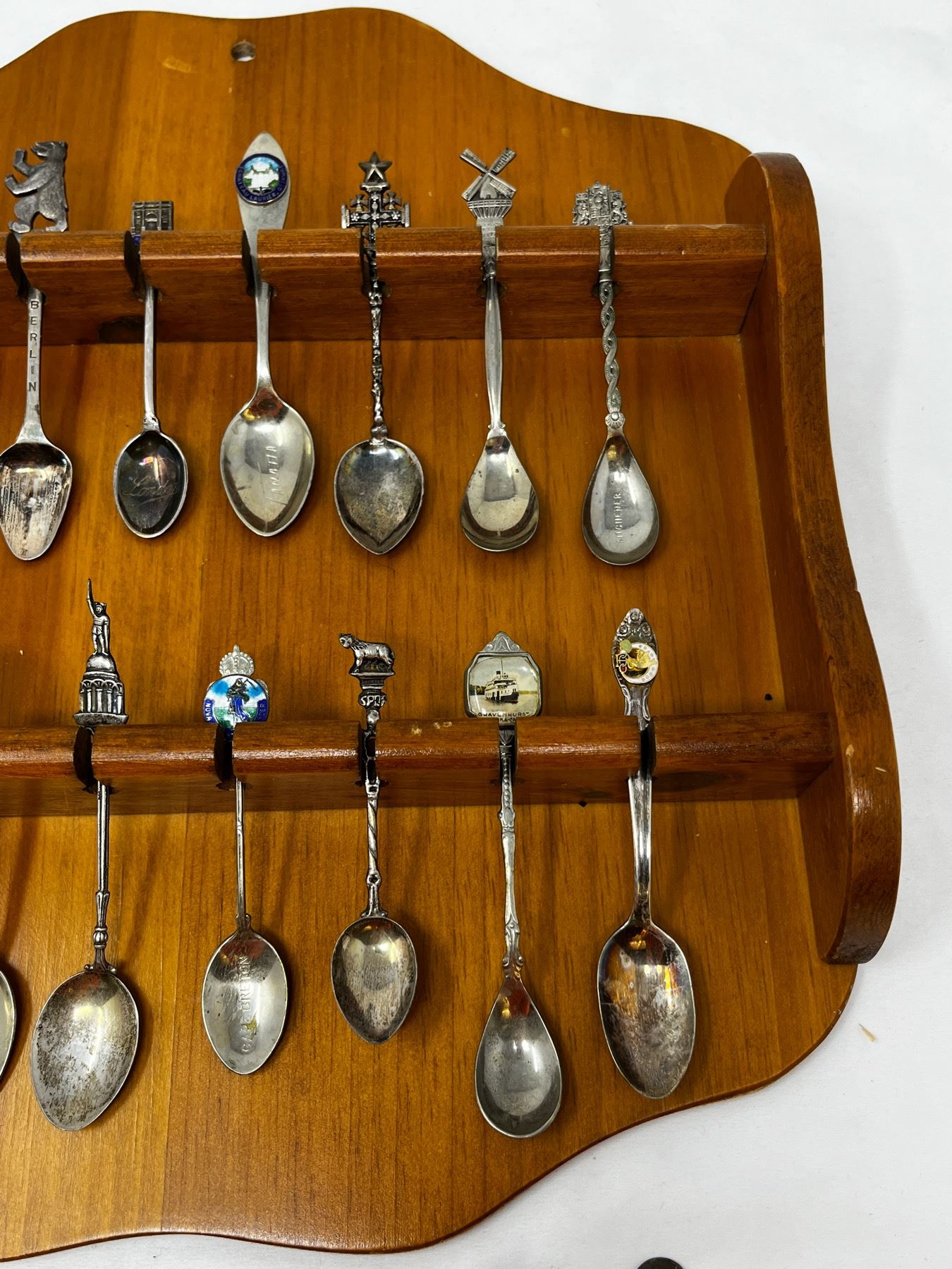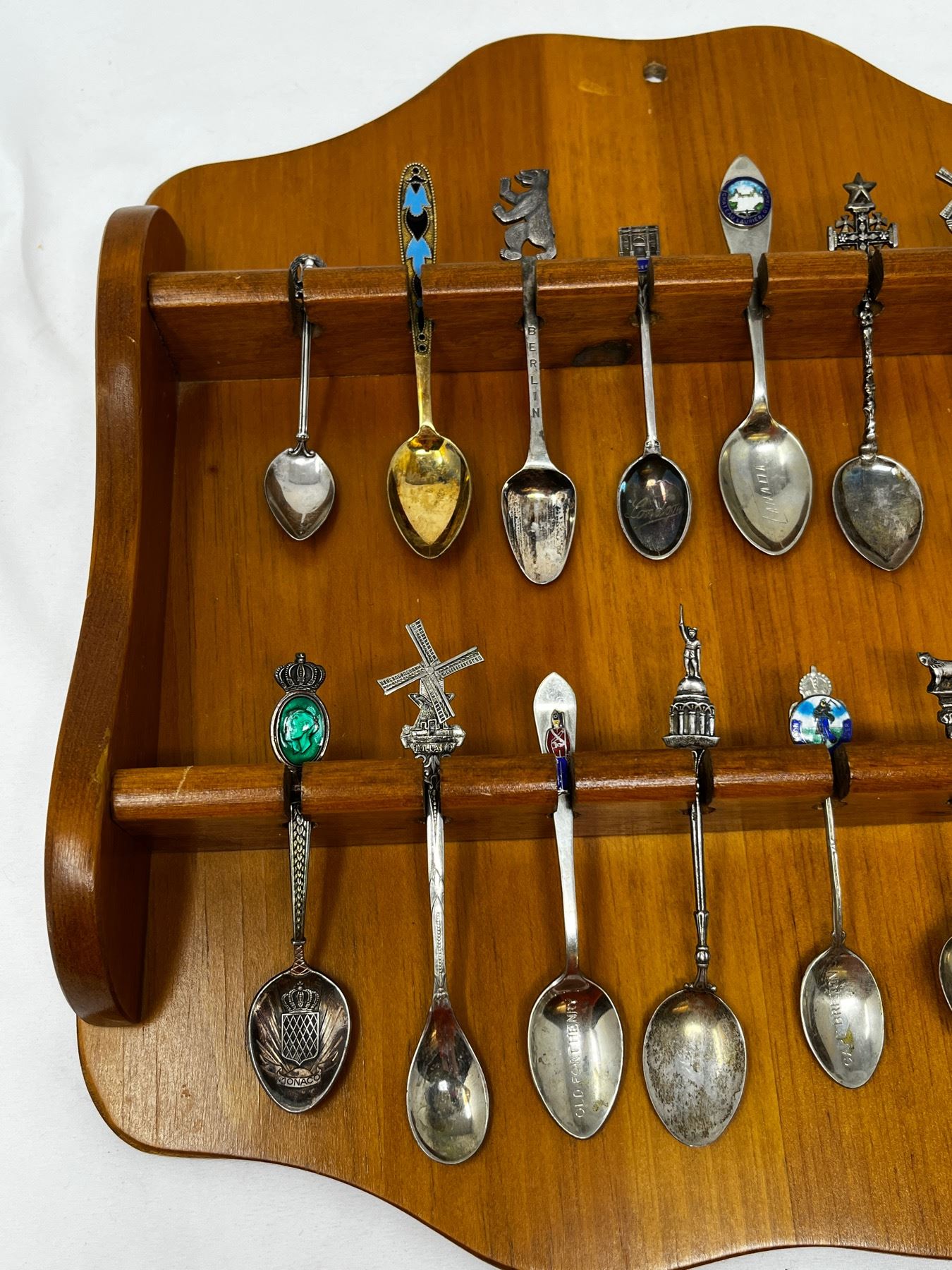Various collector spoons from around the world in wooden wall mountable holder.