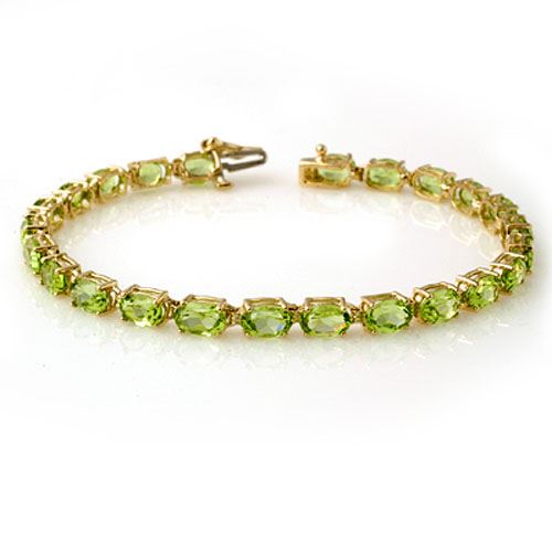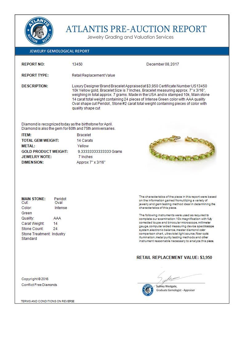 REF-55K3W -13450 ---- 14.0 CTW Peridot Bracelet 10K Yellow Gold ---- Luxury Designer Brand Bracelet Appraised at $3,950 Certificate Number US13450 10k Yellow gold, Bracelet Size is 7 Inches, Bracelet measuring approx. 7" x 3/16", weighing in total approx. 7 grams. Made in the USA and is stamped 10k, Main stone 14 carat total weight containing 24 pieces of Intense Green color with AAA quality Oval shape cut Peridot , Stone #2 carat total weight containing pieces of color with quality shape cut