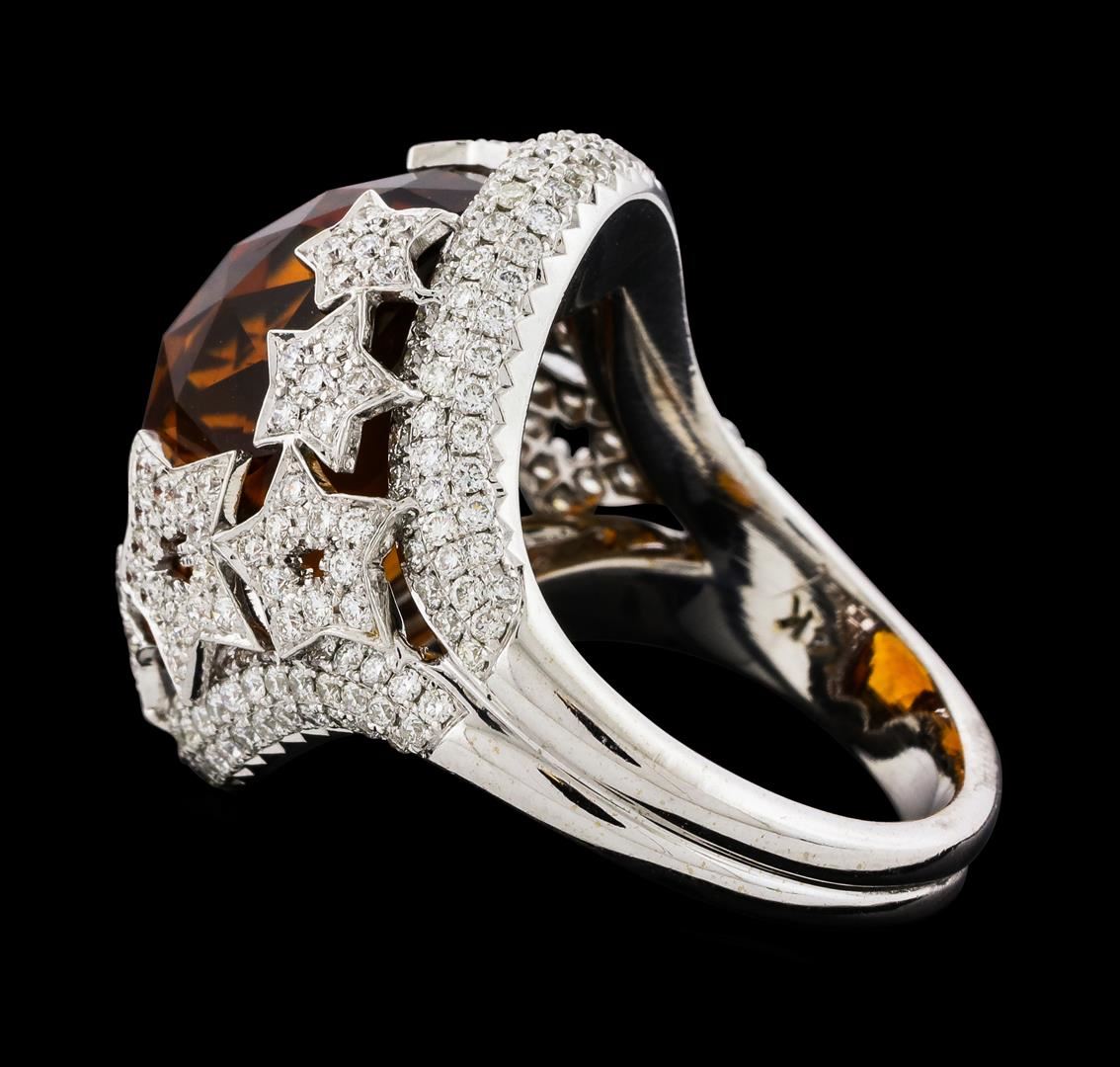 One Citrine and Diamond Ring featuring: 14KT White Gold with a total weight of 12.12 grams, Citrine with a total weight of 14.00ct, and side diamonds with a total weight of 1.42ctw.