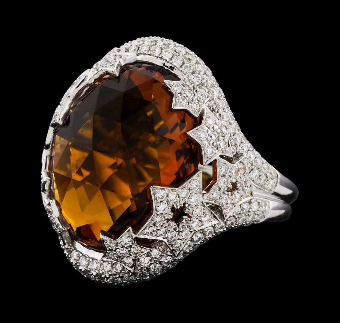 One Citrine and Diamond Ring featuring: 14KT White Gold with a total weight of 12.12 grams, Citrine with a total weight of 14.00ct, and side diamonds with a total weight of 1.42ctw.