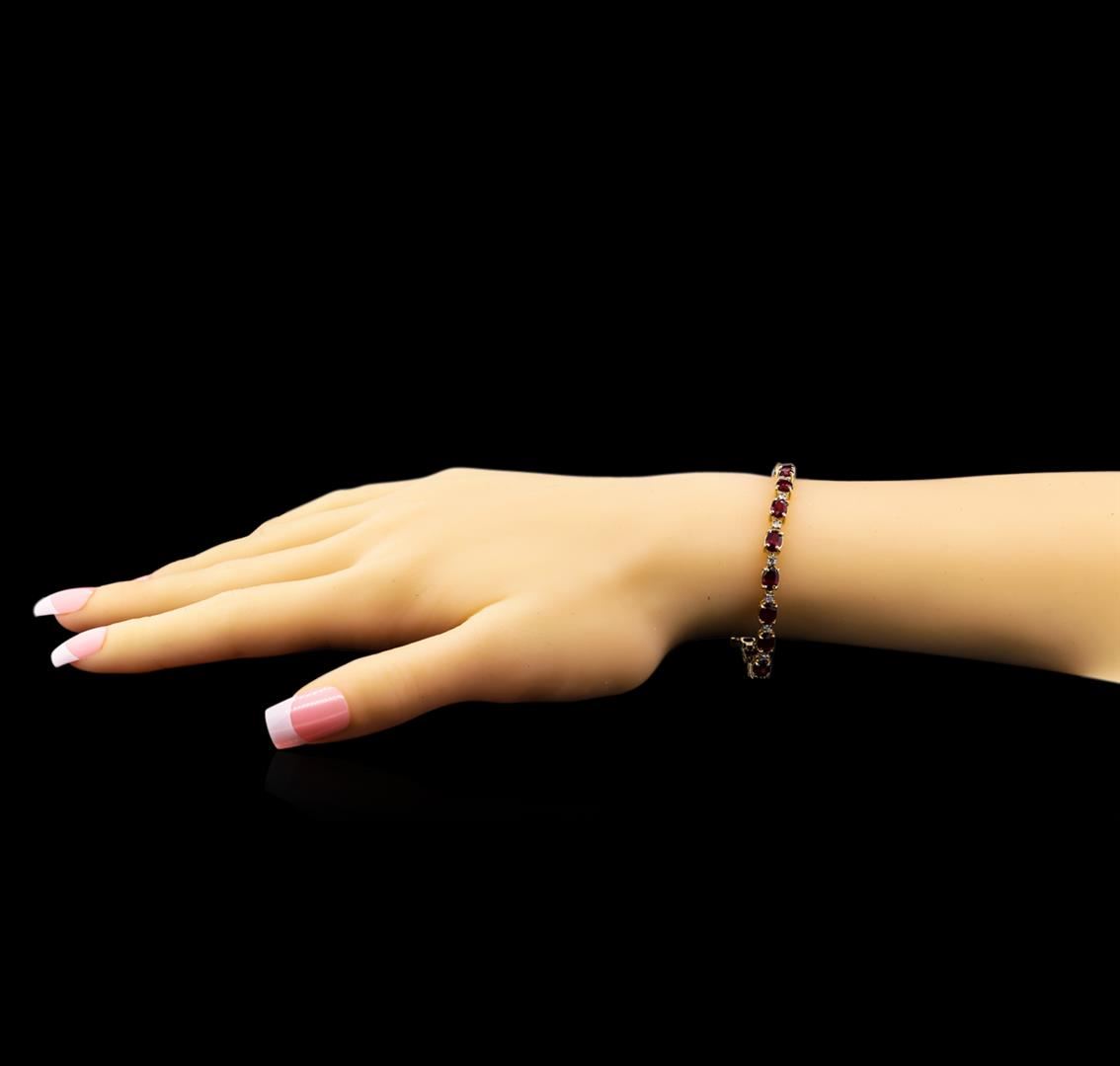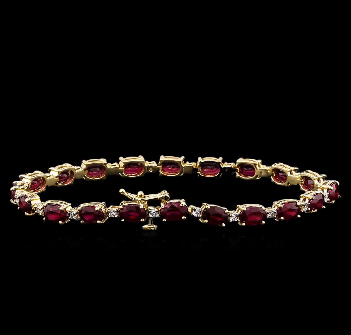 One electronically tested 14KT yellow gold lady's combination cast & assembled fashion bracelet with a tongue clasp with foldover safety with a bright polish finish. The featured lady's bracelet measures approximately 7 inches in length. Identified with markings of "14K". Condition is new, good workmanship. Containing: Twenty prong set oval modified brilliant cut natural rubies, measuring 6.05 x 4.15 x 3.30mm, approximate total weight of 14.00ct., clarity is heavily included, type II, medium dark, moderately strong, red color, (GIA R 6/4), cut is good. Naturally occurring internal & external characteristics are present. Indications of laboratory high temperature heat treatment, with glass & flux additives. Colored gemstones are presumed to have been subjected to commonly used enhancement processes. Graded in the setting. Twenty prong set round brilliant cut diamonds, measuring 1.90 - 1.80 x 1.17mm (depth est.) approximate total weight of 20 Stones = 0.50ct. Graded in the setting. Clarity: SI-1 to SI-2. Color: G - Good. Total Weight of Colored Stones 14.00ct. Total Weight of Diamonds 0.50ct. Total Weight of Bracelet 12.30gm. GAS Appraised at $8,365.00.