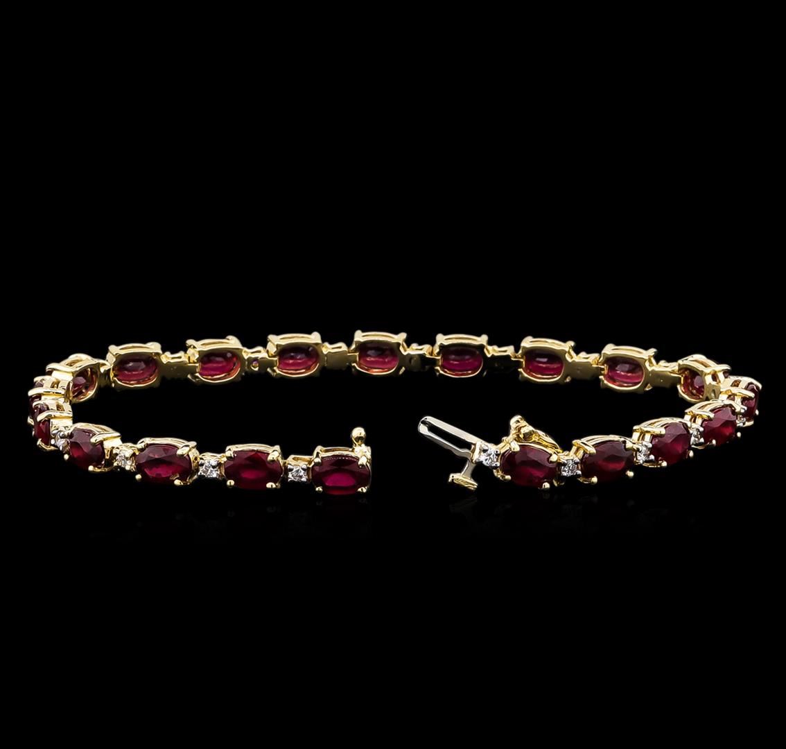 One electronically tested 14KT yellow gold lady's combination cast & assembled fashion bracelet with a tongue clasp with foldover safety with a bright polish finish. The featured lady's bracelet measures approximately 7 inches in length. Identified with markings of "14K". Condition is new, good workmanship. Containing: Twenty prong set oval modified brilliant cut natural rubies, measuring 6.05 x 4.15 x 3.30mm, approximate total weight of 14.00ct., clarity is heavily included, type II, medium dark, moderately strong, red color, (GIA R 6/4), cut is good. Naturally occurring internal & external characteristics are present. Indications of laboratory high temperature heat treatment, with glass & flux additives. Colored gemstones are presumed to have been subjected to commonly used enhancement processes. Graded in the setting. Twenty prong set round brilliant cut diamonds, measuring 1.90 - 1.80 x 1.17mm (depth est.) approximate total weight of 20 Stones = 0.50ct. Graded in the setting. Clarity: SI-1 to SI-2. Color: G - Good. Total Weight of Colored Stones 14.00ct. Total Weight of Diamonds 0.50ct. Total Weight of Bracelet 12.30gm. GAS Appraised at $8,365.00.