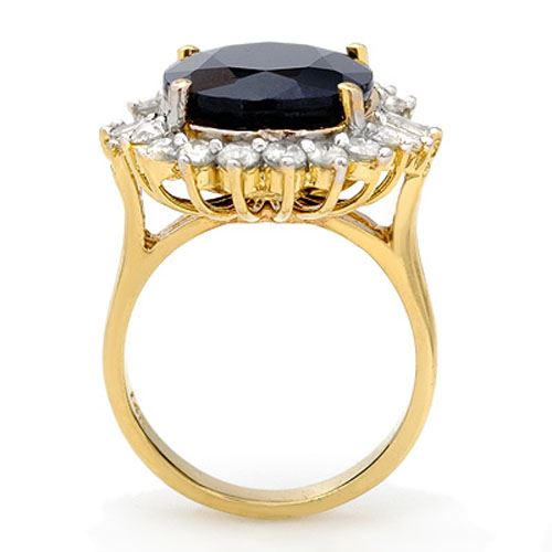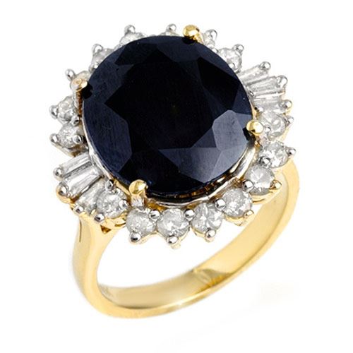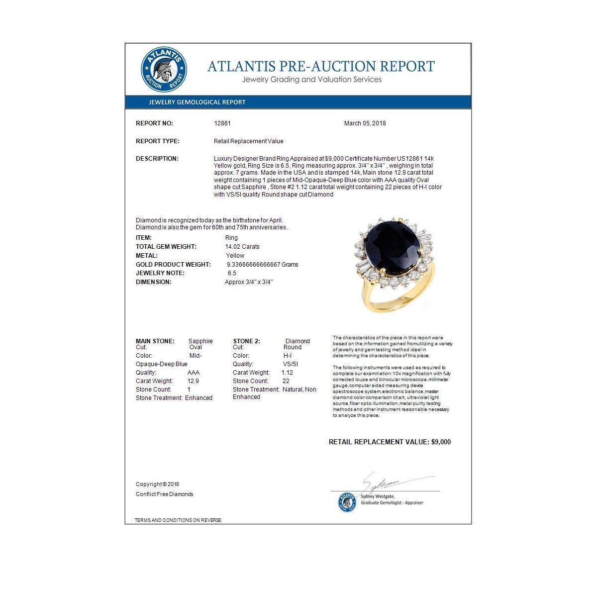 REF-125X6T -12861 ---- 14.02 CTW Blue Sapphire & Diamond Ring 14K Yellow Gold ---- Luxury Designer Brand Ring Appraised at $9,000 Certificate Number US12861 14k Yellow gold, Ring Size is 6.5, Ring measuring approx. 3/4" x 3/4" , weighing in total approx. 7 grams. Made in the USA and is stamped 14k, Main stone 12.9 carat total weight containing 1 pieces of Mid-Opaque-Deep Blue color with AAA quality Oval shape cut Sapphire , Stone #2 1.12 carat total weight containing 22 pieces of H-I color with VS/SI quality Round shape cut Diamond
