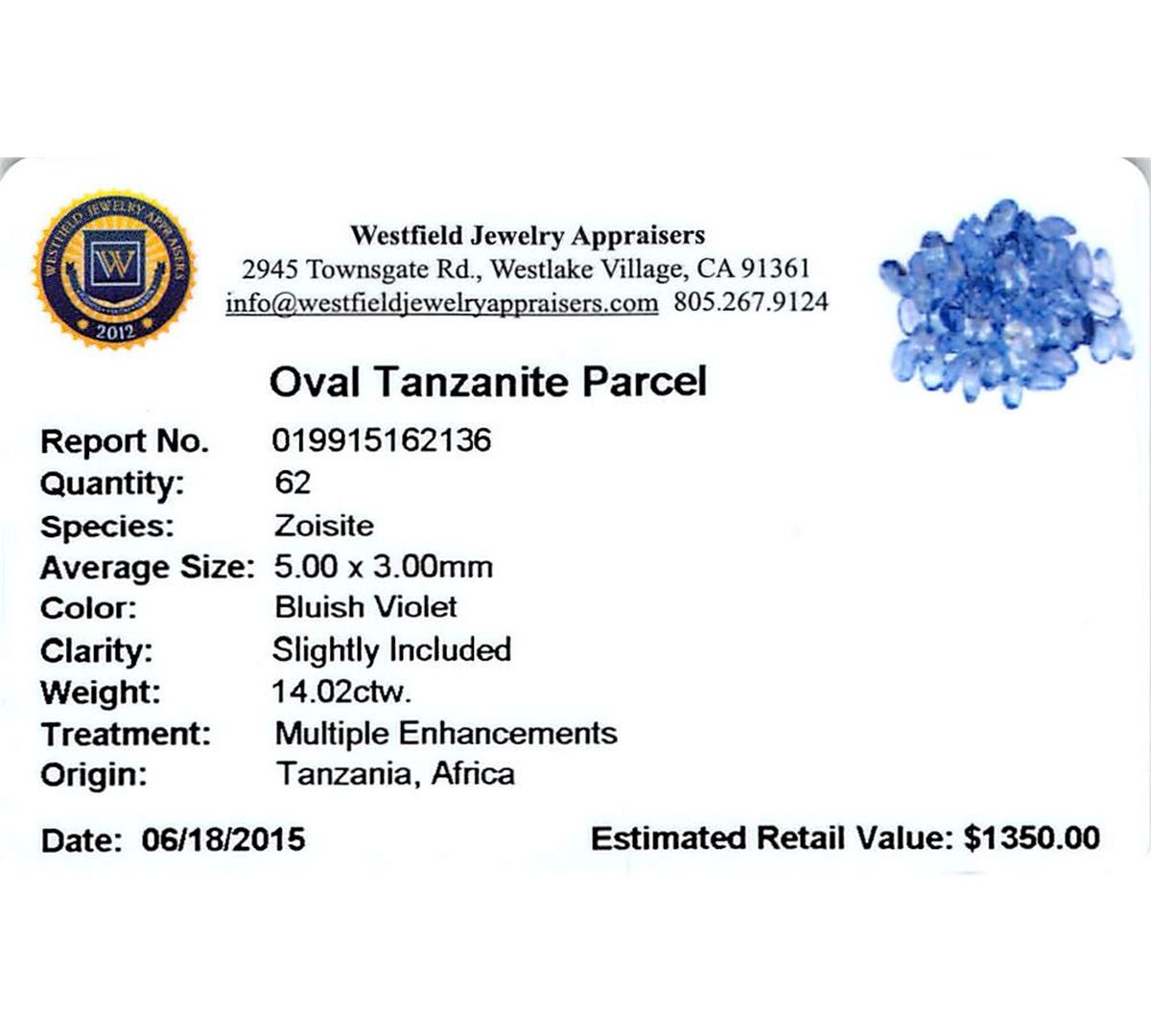 Sixty-two oval mixed cut natural tanzanites, measuring 5.00 x 3.00 x 1.95mm, exact total weight 14.02ct., clarity is slightly included, type I, medium, very slightly grayish, bluish violet color, (GIA bV 5/3), cut is good. Transmitting light with a minimum of distortion, transparent. Naturally occurring internal & external characteristics are present. Measurements & the color grade are an average for the group. Tanzanite is a very rare gemstone that is only found in the country of Tanzania. Originally discovered in 1967. Tiffany & Company, named the stone Tanzanite. It is found in the Usumburu Mountains that border the Umba Valley of northern Tanzania. Tanzanite occurs in gray, brown, violet, blue, reddish-purple, & green. The gem is interesting because of its exceptional pleochroism. Rotated in different directions a tanzanite will exhibit multiple changes of color. Tanzanite has a low tolerance to ultrasonic cleaning, and should not be cleaned using this method. Westfield Appraised at $1,350.00.