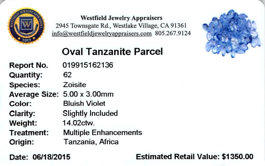 Sixty-two oval mixed cut natural tanzanites, measuring 5.00 x 3.00 x 1.95mm, exact total weight 14.02ct., clarity is slightly included, type I, medium, very slightly grayish, bluish violet color, (GIA bV 5/3), cut is good. Transmitting light with a minimum of distortion, transparent. Naturally occurring internal & external characteristics are present. Measurements & the color grade are an average for the group. Tanzanite is a very rare gemstone that is only found in the country of Tanzania. Originally discovered in 1967. Tiffany & Company, named the stone Tanzanite. It is found in the Usumburu Mountains that border the Umba Valley of northern Tanzania. Tanzanite occurs in gray, brown, violet, blue, reddish-purple, & green. The gem is interesting because of its exceptional pleochroism. Rotated in different directions a tanzanite will exhibit multiple changes of color. Tanzanite has a low tolerance to ultrasonic cleaning, and should not be cleaned using this method. Westfield Appraised at $1,350.00.