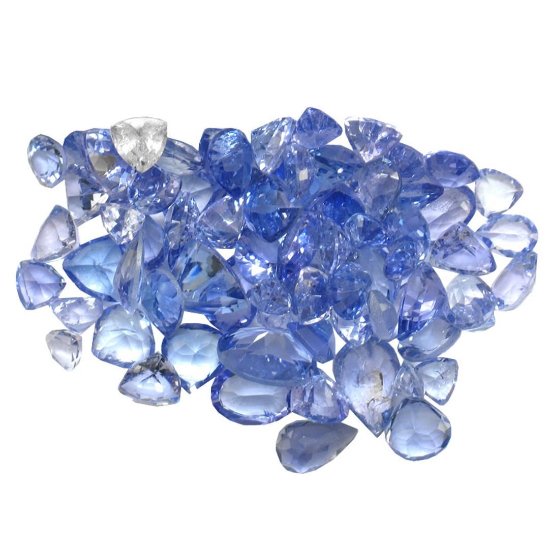 Sixty mixed cut natural tanzanites exact total weight 14.07ct., clarity is eye clean, type I, medium dark, very slightly grayish, bluish violet color, (GIA bV 6/3), cut is good. Transmitting light with no distortion, transparent. Color grade is an average for the group. Graded in the setting. Tanzanite is a very rare gemstone that is only found in the country of Tanzania. Originally discovered in 1967. Tiffany & Company, named the stone Tanzanite. It is found in the Usumburu Mountains that border the Umba Valley of northern Tanzania. Tanzanite occurs in gray, brown, violet, blue, reddish-purple, & green. The gem is interesting because of its exceptional pleochroism. Rotated in different directions a tanzanite will exhibit multiple changes of color. Tanzanite has a low tolerance to ultrasonic cleaning, and should not be cleaned using this method. Westfield Appraised at $1,355.00.