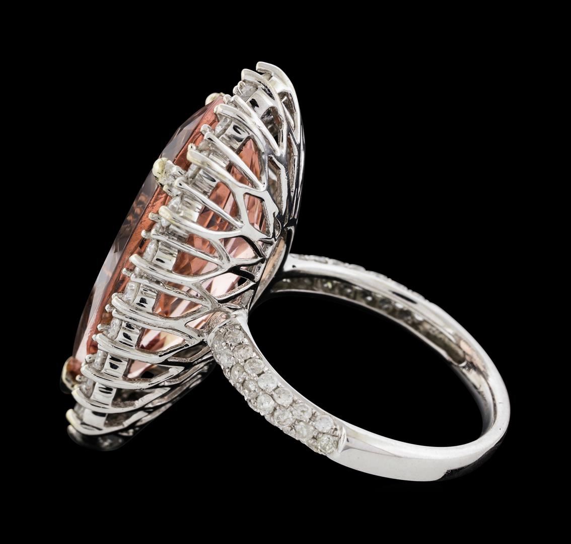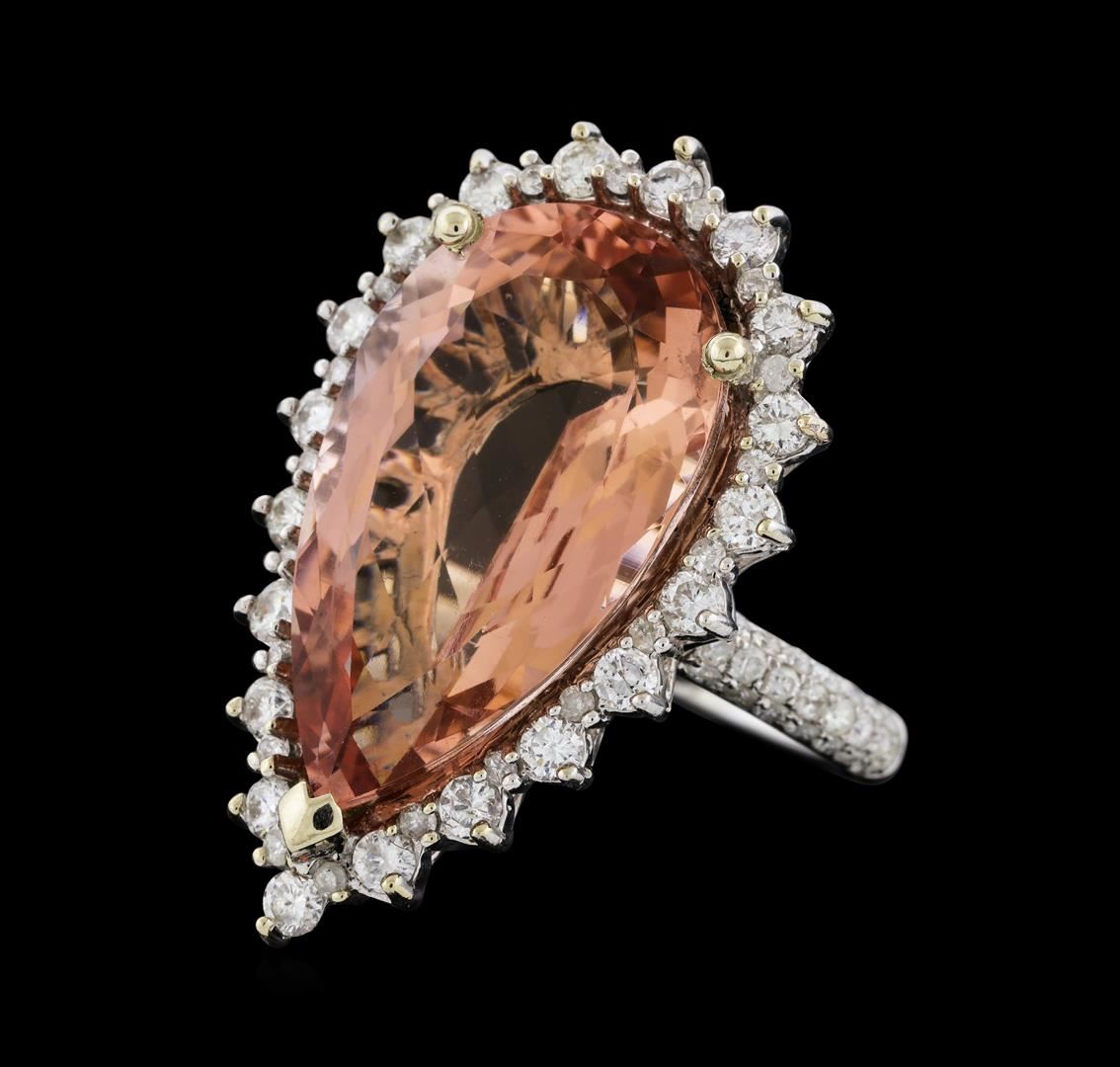 One electronically tested 14KT white gold lady's cast fashion ring with a staggered basket halo with a bright polish finish. The featured lady's ring has a shank measuring 2.43 millimeters wide. Identified with markings of '14K'. Condition is new, good workmanship. Containing: One prong set pear modified brilliant cut natural morganite, measuring 22.20 x 12.96 x 8.07mm, (depth est.) 11%. bulge factor, approximate weight of 14.09ct., clarity is eye clean, light, moderately strong, reddish orange color, (GIA rO 3/4), cut is very good. Transmitting light with no distortion, transparent. Colored gemstones are presumed to have been subjected to commonly used enhancement processes. Graded in the setting. Twenty prong set round brilliant cut diamonds, measuring 2.20 - 2.10 x 1.33mm (depth est.) approximate total weight of 20 Stones = 0.77ct. Graded in the setting. Clarity SI-1 to SI-2. Color: H - I Cut Good Sixty-Four prong set round brilliant cut diamonds, measuring 1.40 - 1.25 x 0.80mm (depth est.) approximate total weight of 64 Stones = 0.55ct. Graded in the setting. Clarity SI-2 to I-2. Color: H - I Cut Good. Total Weight of Colored Stones 14.09ct.. Total Weight of Diamonds 1.32ct.. Total Weight of Ring 8.40gm. GAS Appraised at $9,945.00.