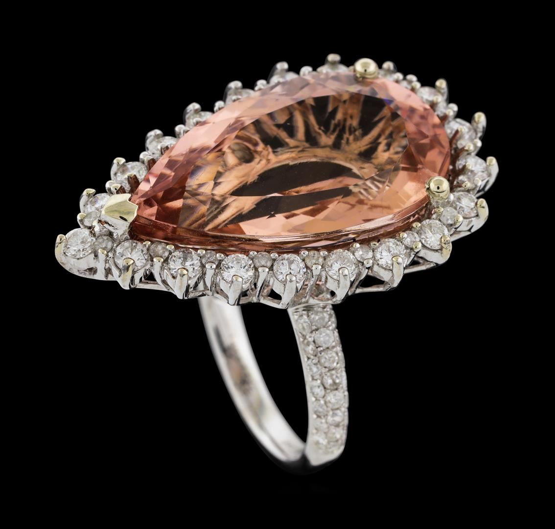 One electronically tested 14KT white gold lady's cast fashion ring with a staggered basket halo with a bright polish finish. The featured lady's ring has a shank measuring 2.43 millimeters wide. Identified with markings of '14K'. Condition is new, good workmanship. Containing: One prong set pear modified brilliant cut natural morganite, measuring 22.20 x 12.96 x 8.07mm, (depth est.) 11%. bulge factor, approximate weight of 14.09ct., clarity is eye clean, light, moderately strong, reddish orange color, (GIA rO 3/4), cut is very good. Transmitting light with no distortion, transparent. Colored gemstones are presumed to have been subjected to commonly used enhancement processes. Graded in the setting. Twenty prong set round brilliant cut diamonds, measuring 2.20 - 2.10 x 1.33mm (depth est.) approximate total weight of 20 Stones = 0.77ct. Graded in the setting. Clarity SI-1 to SI-2. Color: H - I Cut Good Sixty-Four prong set round brilliant cut diamonds, measuring 1.40 - 1.25 x 0.80mm (depth est.) approximate total weight of 64 Stones = 0.55ct. Graded in the setting. Clarity SI-2 to I-2. Color: H - I Cut Good. Total Weight of Colored Stones 14.09ct.. Total Weight of Diamonds 1.32ct.. Total Weight of Ring 8.40gm. GAS Appraised at $9,945.00.