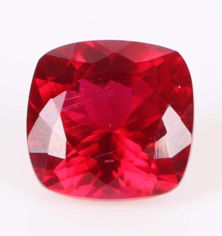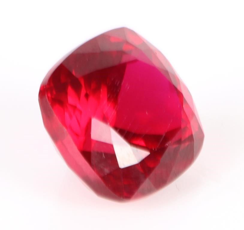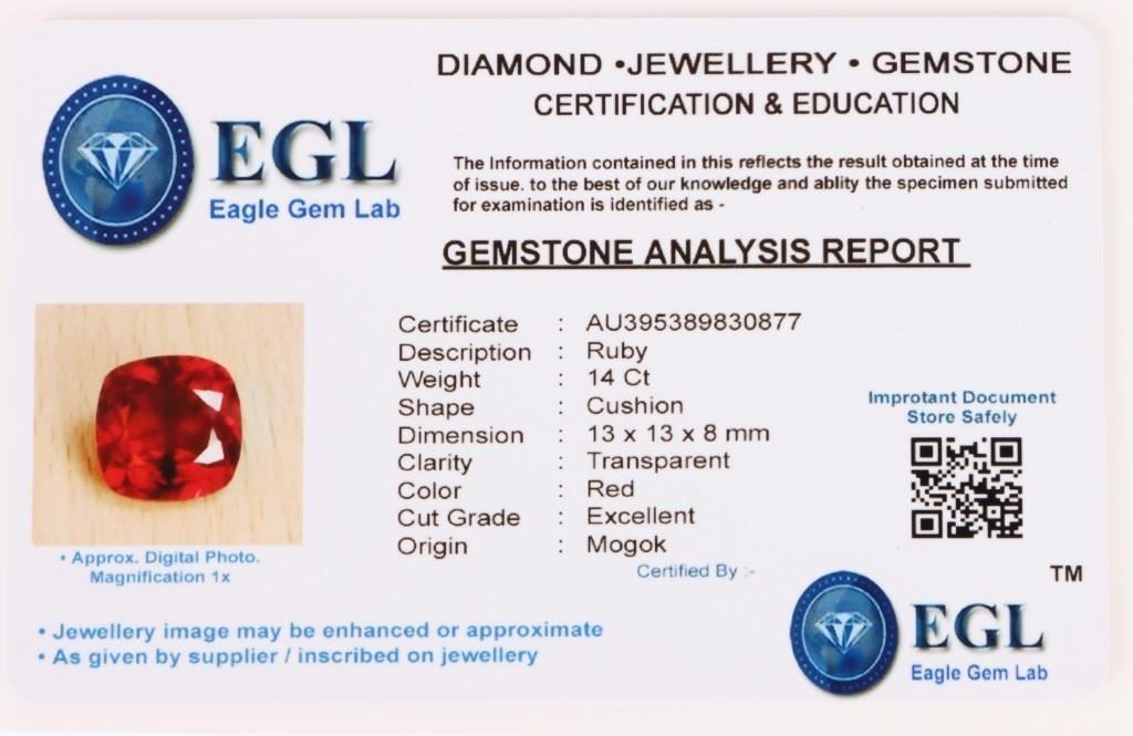 14.0ct cushion-cut red ruby loose gemstone with EGL certification. Gemstone has been electronically tested and identified, tester does not distinguish between lab grown and natural.