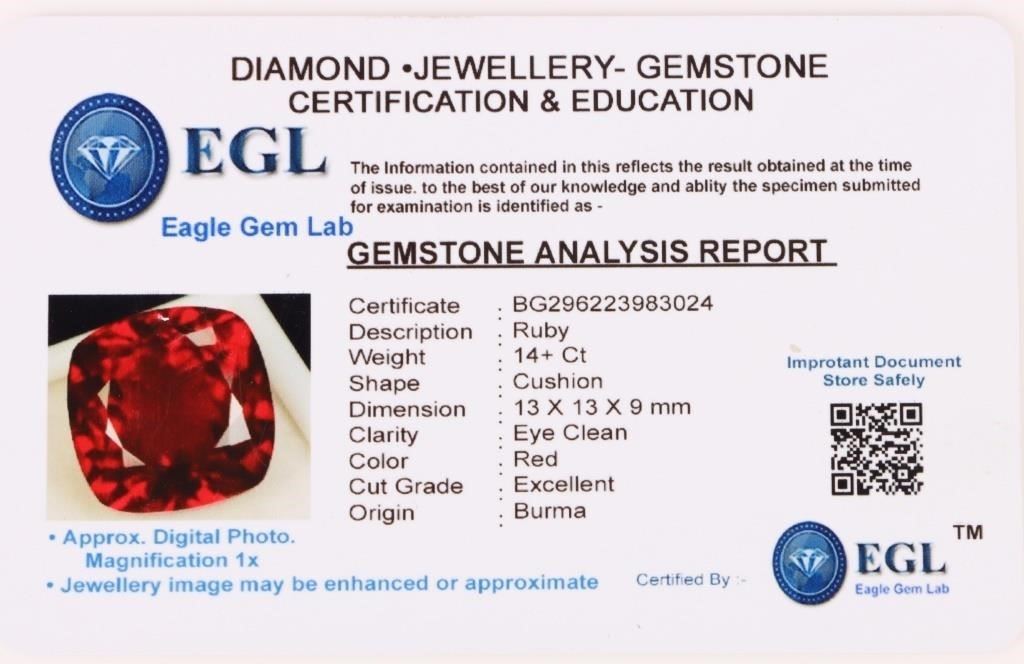 14.0ct large cushion-cut red loose ruby with EGL lab certification. Stone is electronically tested and identified, tester does not distinguish between natural and lab grown.