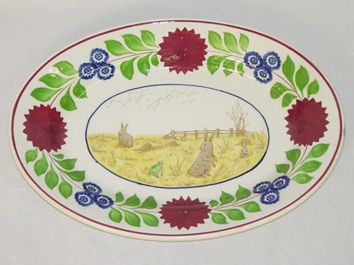 14 1/2" OVAL STICKSPATTER RABBIT WARE PLATTER - GOOD COLOR, 3" PROFESSIONAL HAIRLINE REPAIR TO TOP LEFT CORNER EDGE & CRAZING
