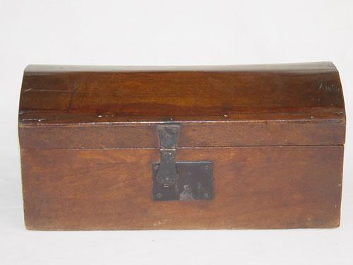 14 1/4" 19TH CENT. WOODEN DOME TOP DOCUMENT BOX W/ IRON LOCK PLATE & LATCH - REFINISHED, WEAR & IMPERFECTIONS