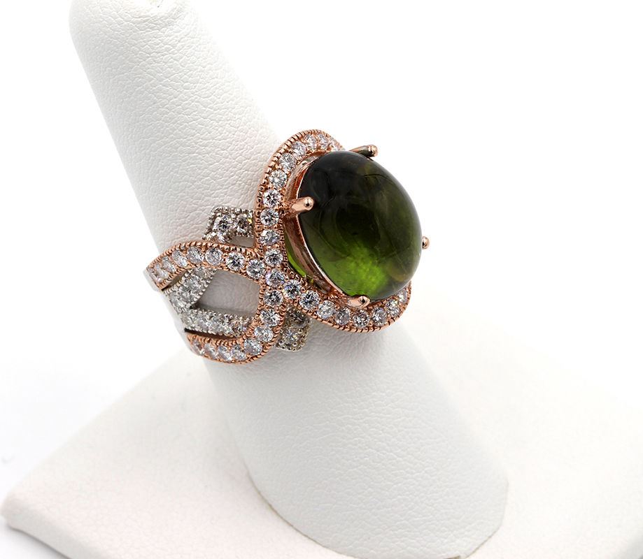 One Cass Green Tourmaline Diamond Cocktail Two-Toned Ring in 14k Rose Gold. Size 7 but is resizable. The ring design is a four crossed and four prong extravaganza style. The metal type is 14k White Gold and 14k Rose Gold (2 tone) with a total weight of 14.79 grams. The main stone is not enhanced / natural with a cabochon shape. Main stone is 11.62 carats, deep color clarity, fancy green color, with excellent cut. Side diamonds equate 2.49 total carats with G-H color. Diamond clarity is SI1, shape is round cut, and the cut is excellent on all the 24 side diamonds. Total carat weight of stones is 14.11 with an overall number of 25 diamonds. This ring is brand new. Included with independent certification with a retail value of $12,600.
