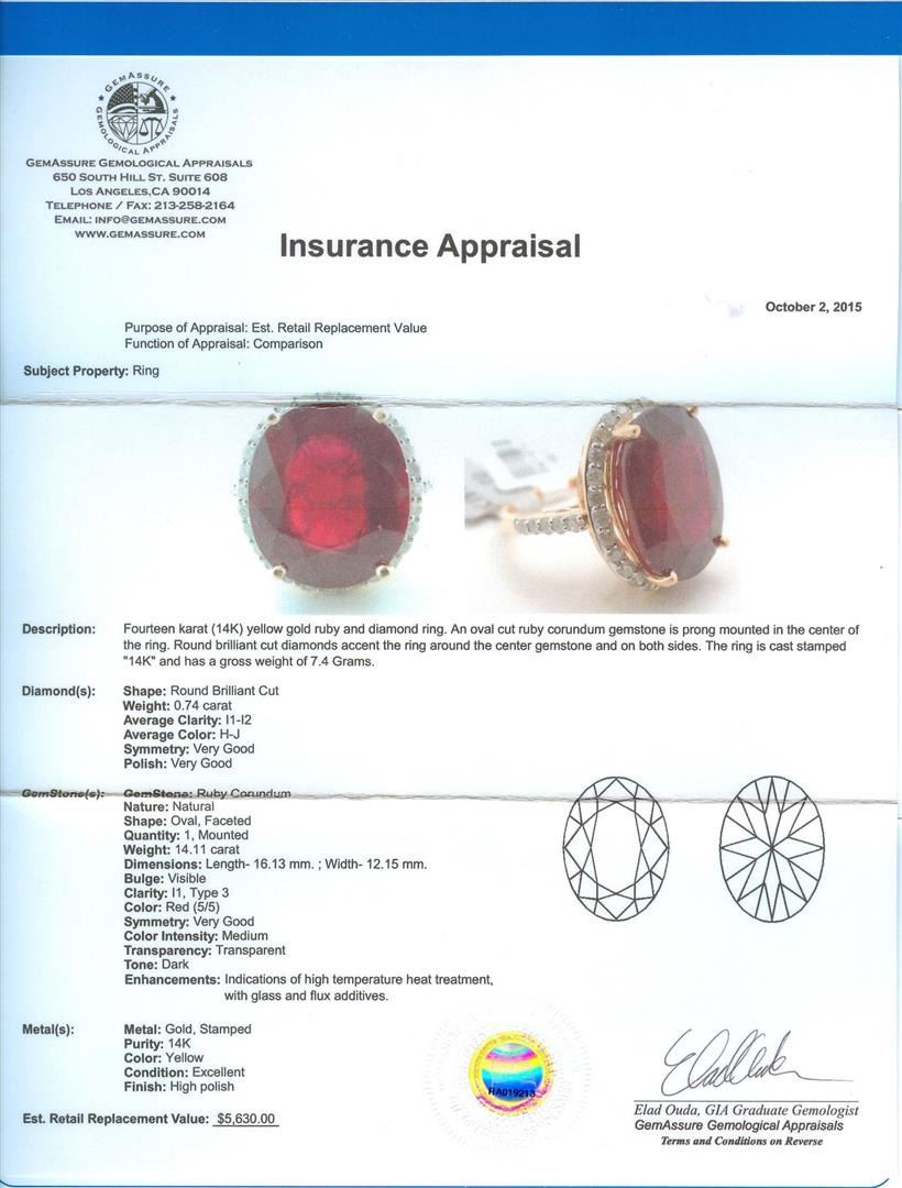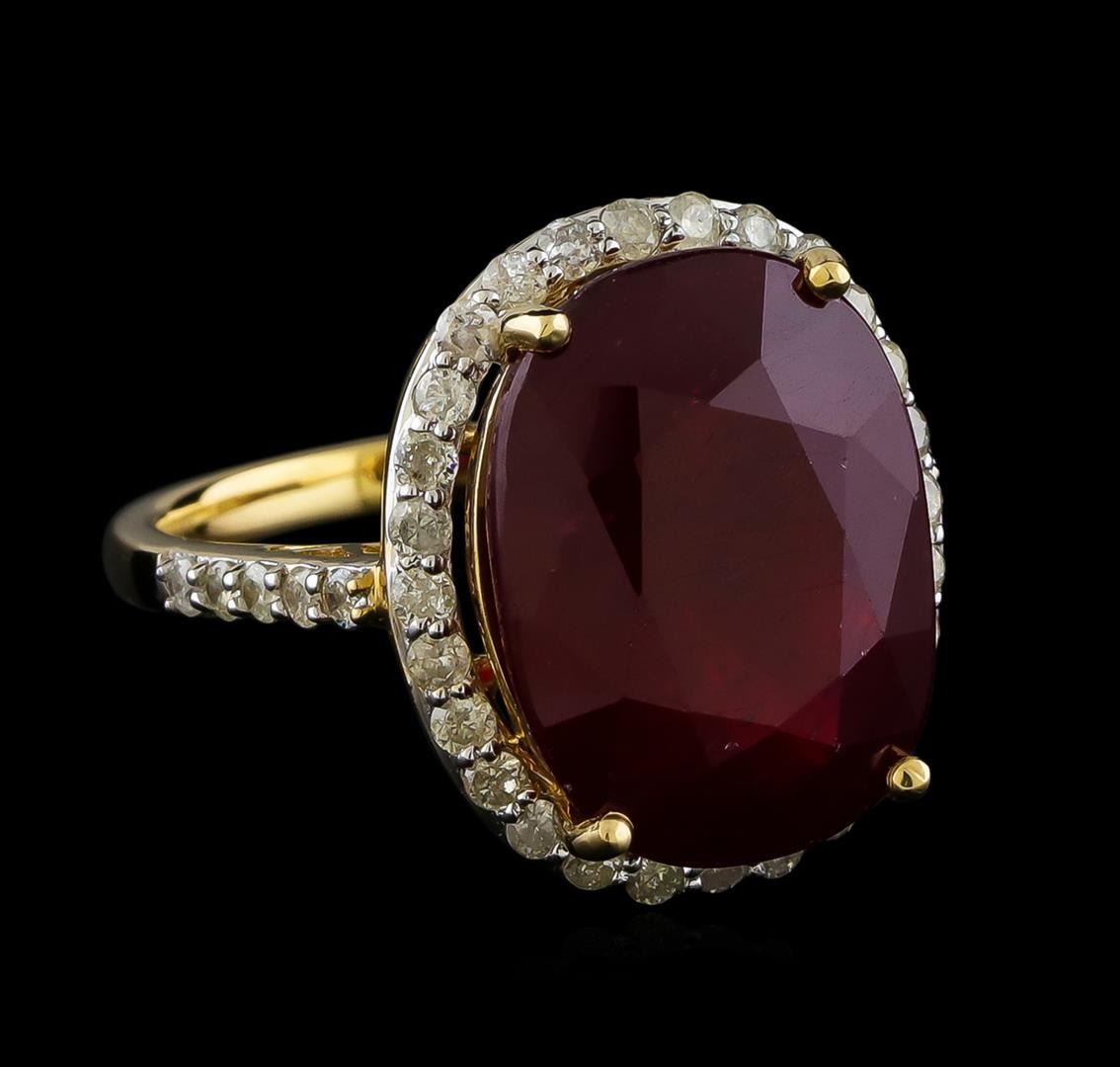Fourteen karat (14K) yellow gold ruby and diamond ring. An oval cut ruby corundum gemstone is prong mounted in the center of the ring. Round brilliant cut diamonds accent the ring around the center gemstone on both sides. The ring is cast stamped "14K" and has a gross weight of 7.4 grams. Diamond(s): Shape: Round brilliant cut. Weight: .74 carat. Average clarity: I1-I2. average color: H-J. Symmetry: Very good. Polish: Very good. Gemstone(s): Gemstone: Ruby corundum. Nature: Natural. Shape: Oval, faceted. Quantity: 1, mounted. Weight: 14.11 carat. Dimensions: Length-16.13 mm. ; Width-12.15 mm. Bulge: Visible. Clarity: I1, type 3. Color: Red (5/5) Symmetry: Very good. Color intensity: Medium. Transparency: Transparent. Tone: Dark. Enhancements: Indications of high temperature heat treatment, with glass and flux additives. Metal(s): Metal: Gold, stamped. Purity: 14K. Color: Yellow. Condition: Excellent. Finish: High Polish. GGA Appraised at $5,630.00.