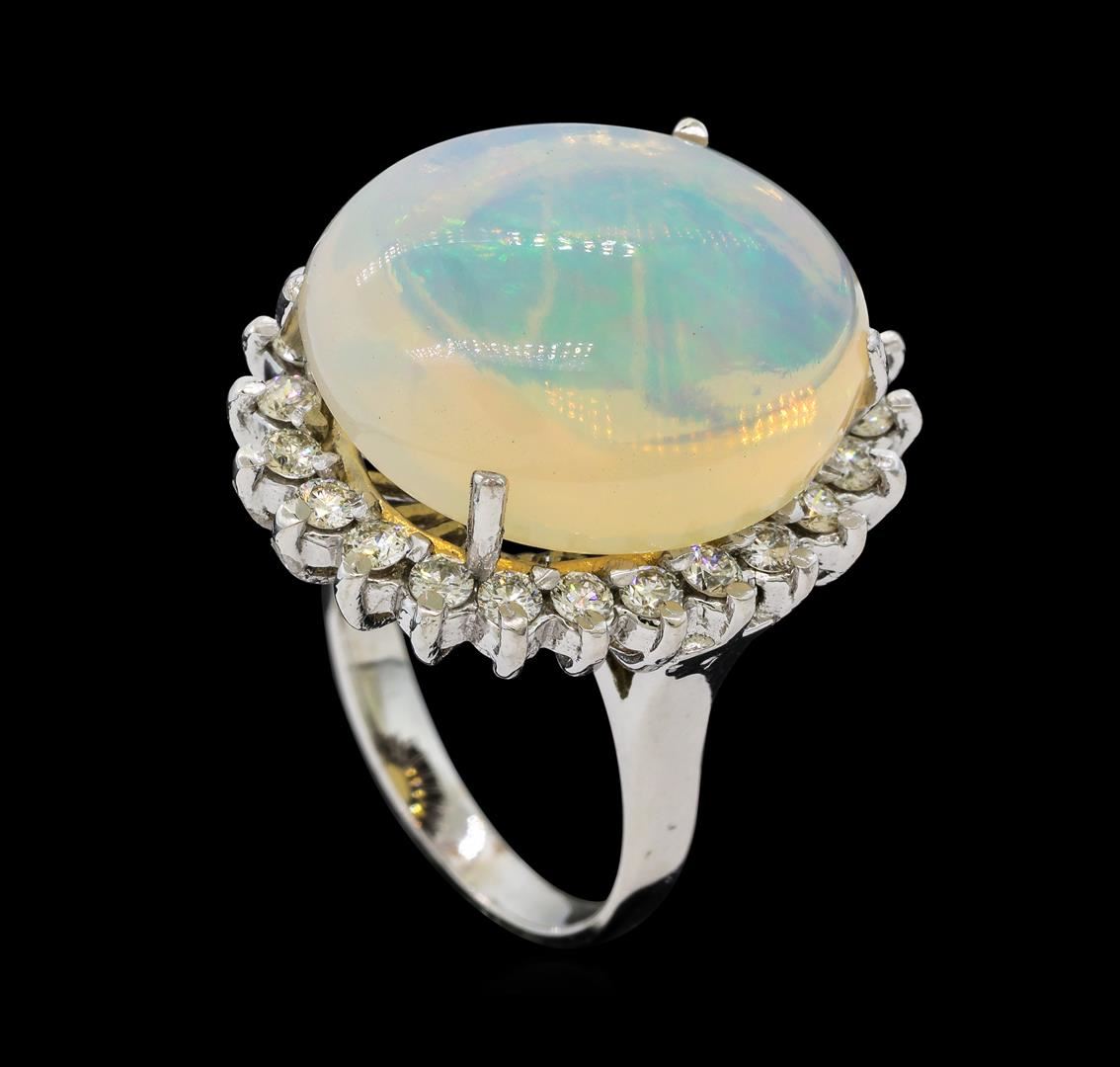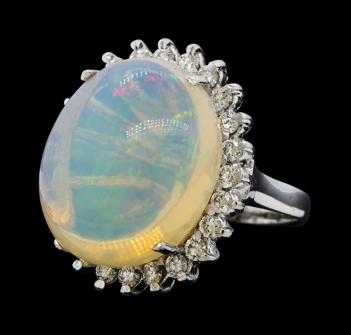 One electronically tested 14KT white gold lady's cast fashion ring with a cathedral shank with a basket halo with a bright polish finish. The featured lady's ring has a shank measuring 2.42 millimeters wide. Identified with markings of '14K'. Condition is new, good workmanship. Containing: One crystal opal that is cut in a oval shaped cabochon and is prong set, measuring 19.15 mm long x 16.20 mm wide, and 10.00 mm thick and the approximate weight is 14.12 carats. The opal has a somewhat bright, multicolor play of color (fire) in a rolling flashfire pattern; a medium dome; a good cut; no inclusions; consistent in its brightness and pattern; and is slightly directional. Graded in the setting. Twenty-Four prong set round brilliant cut diamonds, measuring 2.20 - 2.10 x 1.31mm (depth est.) approximate total weight of 24 Stones = 0.88ct. Graded in the setting. Clarity SI-1 to I-1. Color: G - H Cut Good. Total Weight of Diamonds 0.88ct.. Total Weight of Opals 14.12ct.. Total Weight of Ring 10.10gm. GAS Appraised at $6,270.00.
