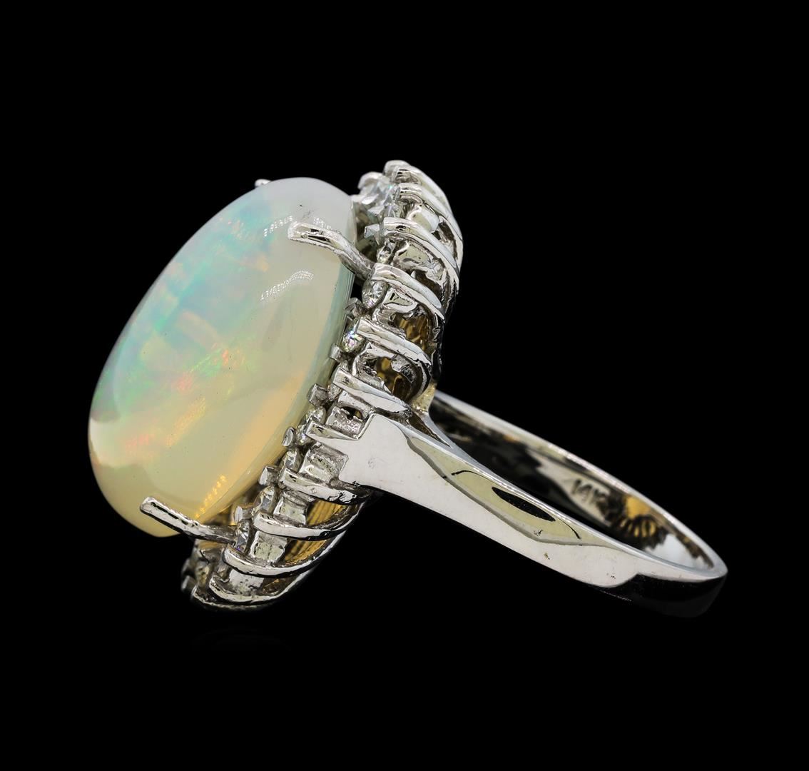 One electronically tested 14KT white gold lady's cast fashion ring with a cathedral shank with a basket halo with a bright polish finish. The featured lady's ring has a shank measuring 2.42 millimeters wide. Identified with markings of '14K'. Condition is new, good workmanship. Containing: One crystal opal that is cut in a oval shaped cabochon and is prong set, measuring 19.15 mm long x 16.20 mm wide, and 10.00 mm thick and the approximate weight is 14.12 carats. The opal has a somewhat bright, multicolor play of color (fire) in a rolling flashfire pattern; a medium dome; a good cut; no inclusions; consistent in its brightness and pattern; and is slightly directional. Graded in the setting. Twenty-Four prong set round brilliant cut diamonds, measuring 2.20 - 2.10 x 1.31mm (depth est.) approximate total weight of 24 Stones = 0.88ct. Graded in the setting. Clarity SI-1 to I-1. Color: G - H Cut Good. Total Weight of Diamonds 0.88ct.. Total Weight of Opals 14.12ct.. Total Weight of Ring 10.10gm. GAS Appraised at $6,270.00.